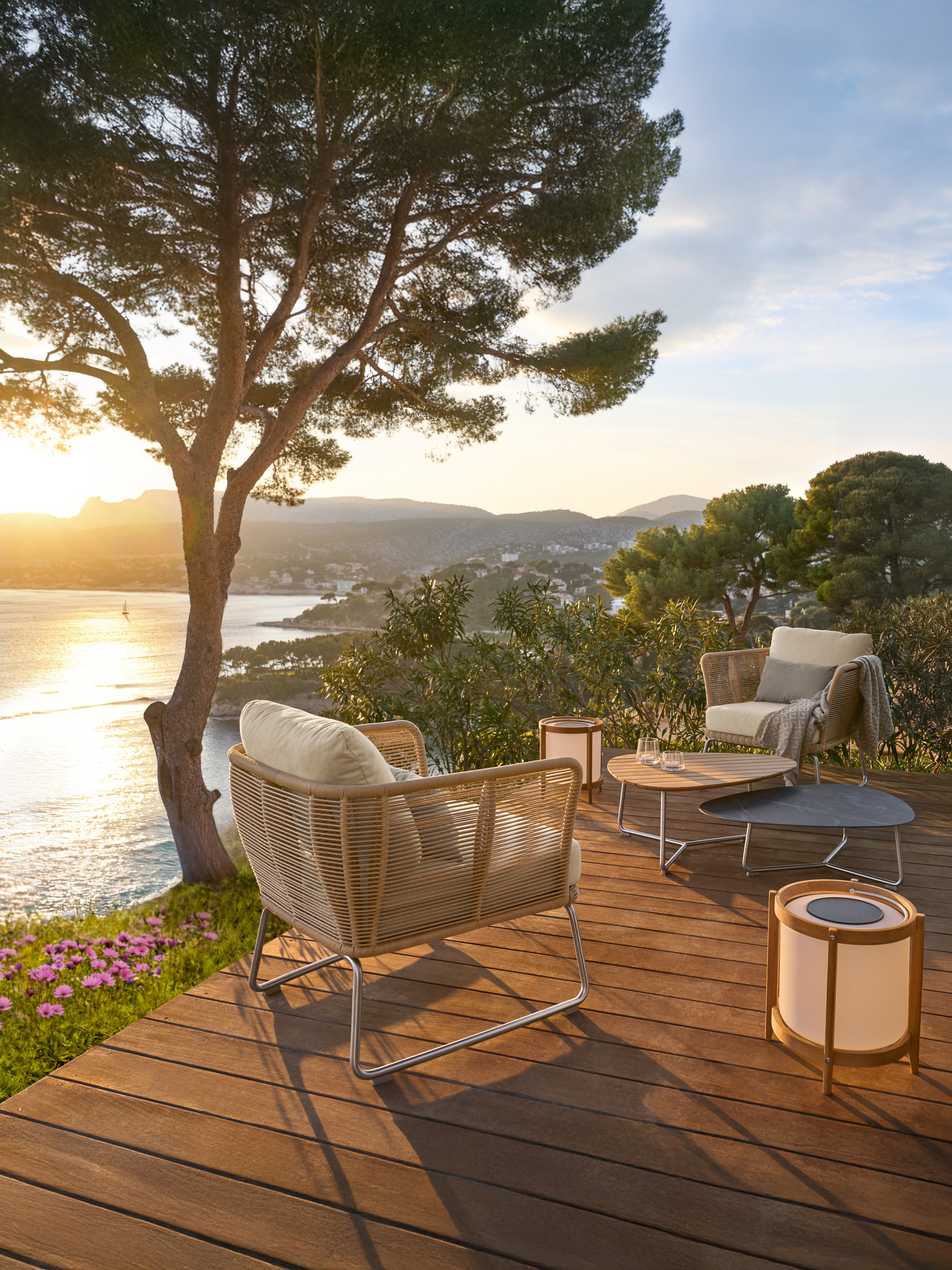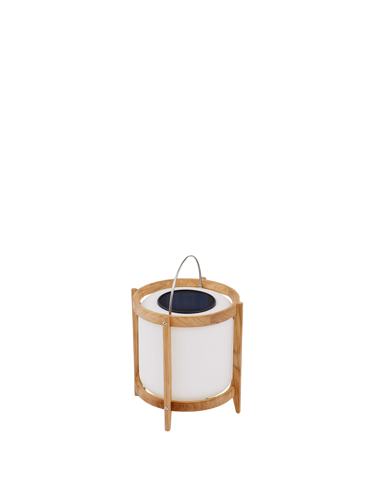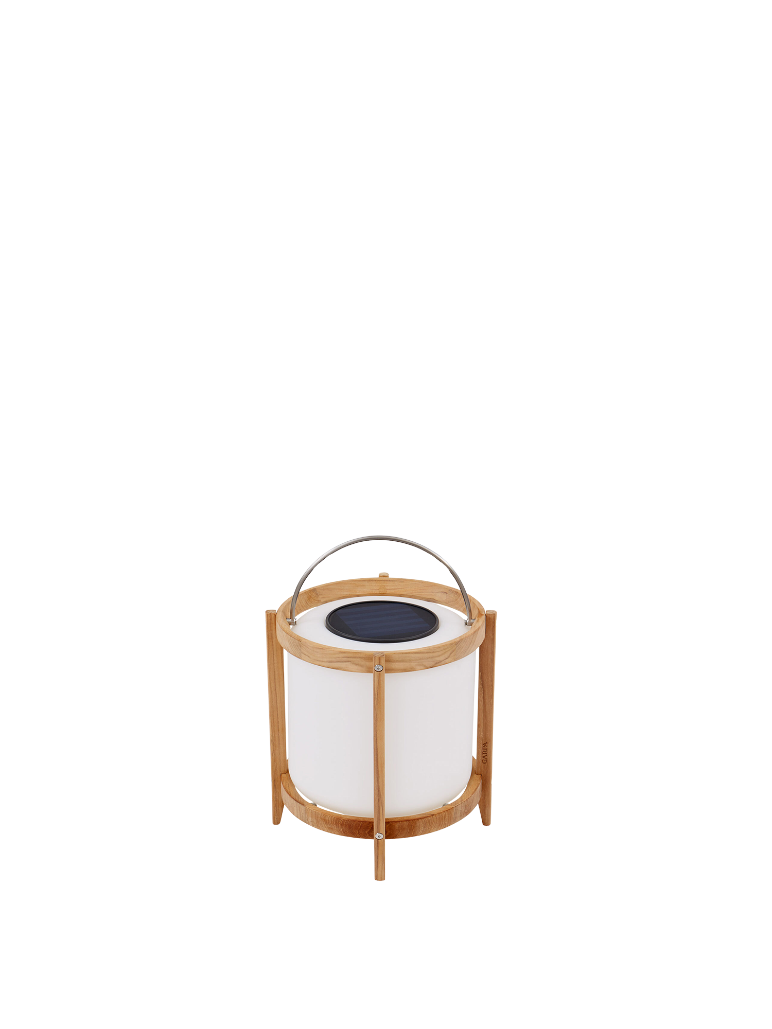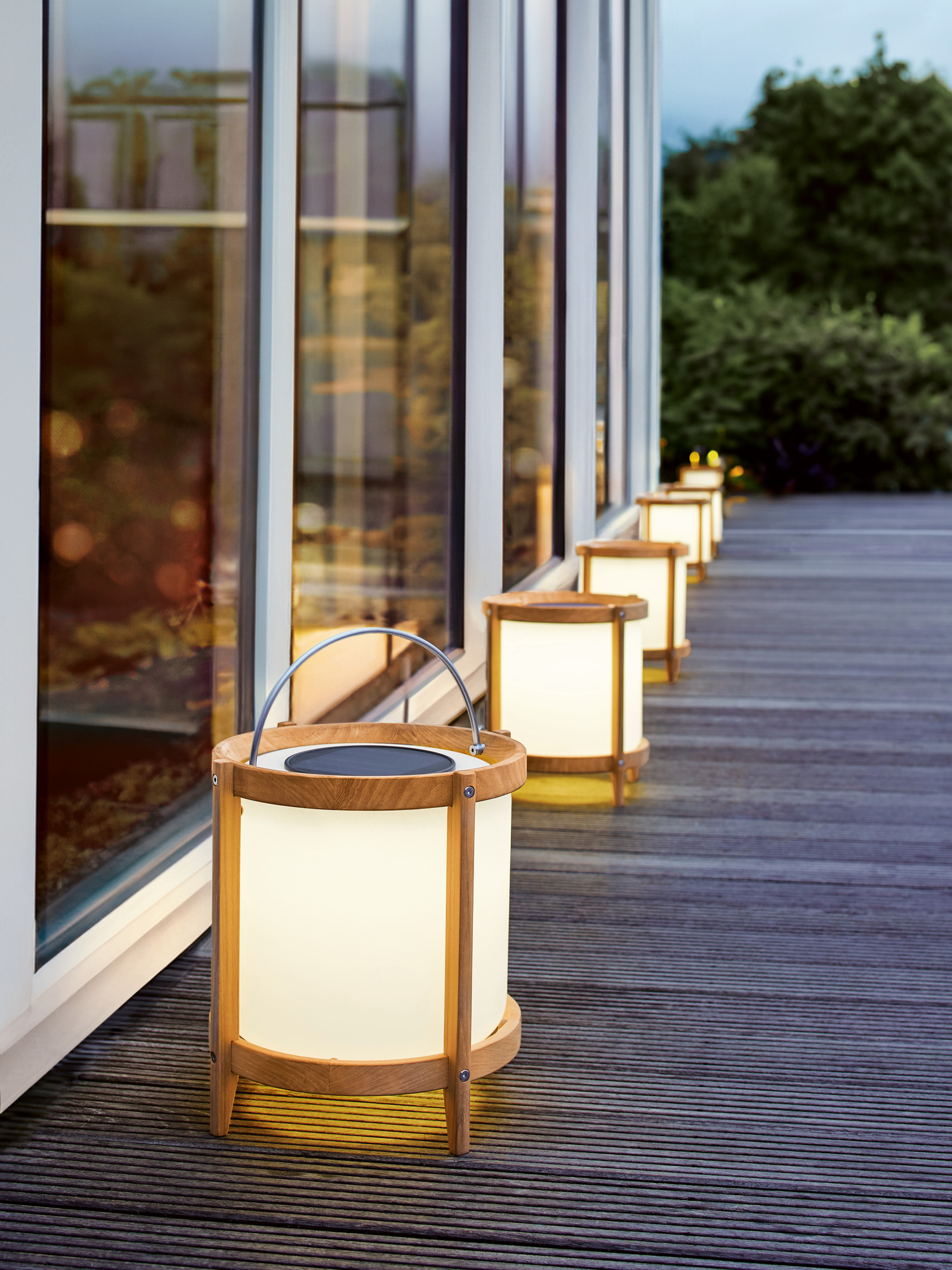To illuminate summer nights the lamp, made of teak and synthetic material, is fitted with a solar panel and needs a sunny place only during the day. The LED unit can also be charged from the mains. In both cases, the Neva lamp provides light for up to four hours. It is dimmable in three steps.