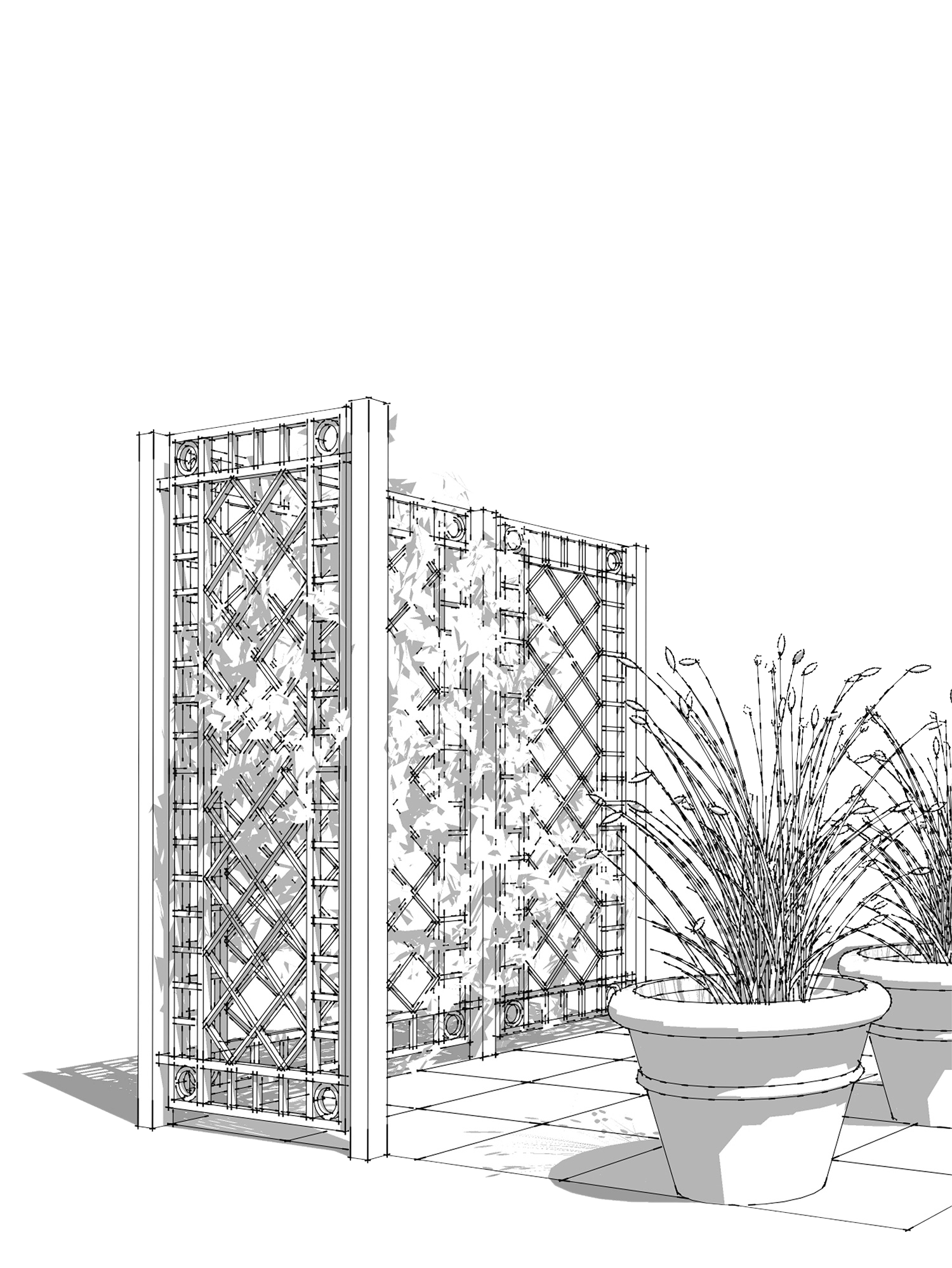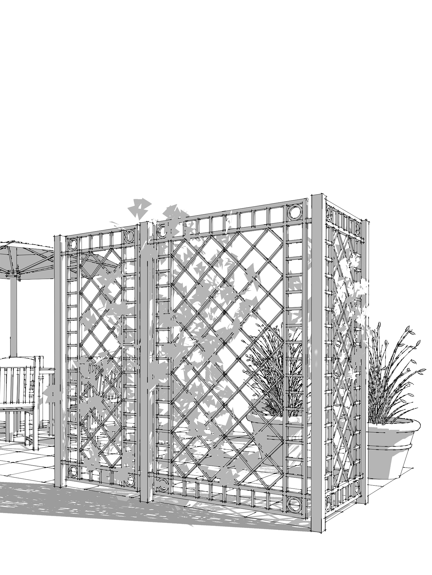 These pieces allow to set up of two trellis elements at a 90° angle. They are mounted around a post and further screwed to one side of the post. Each set consists of two connection pieces.