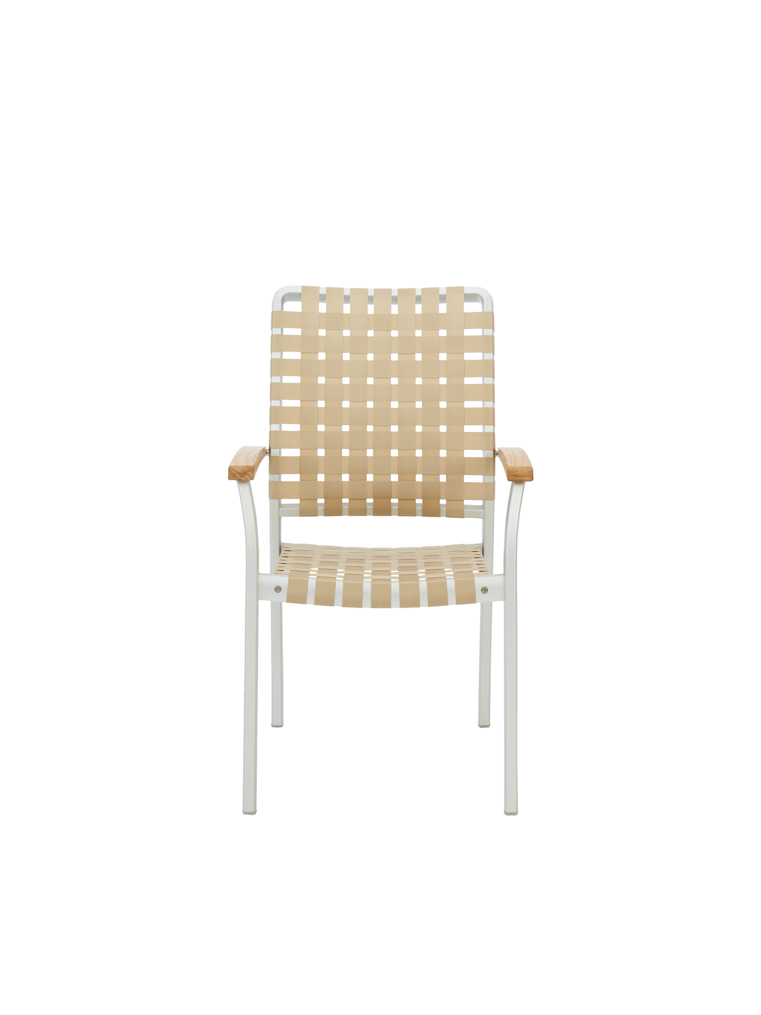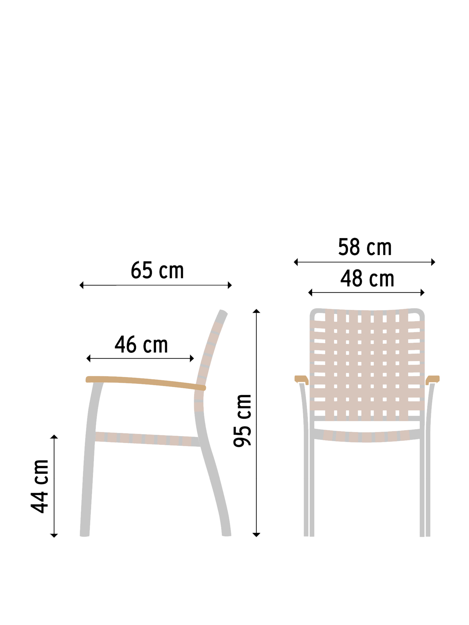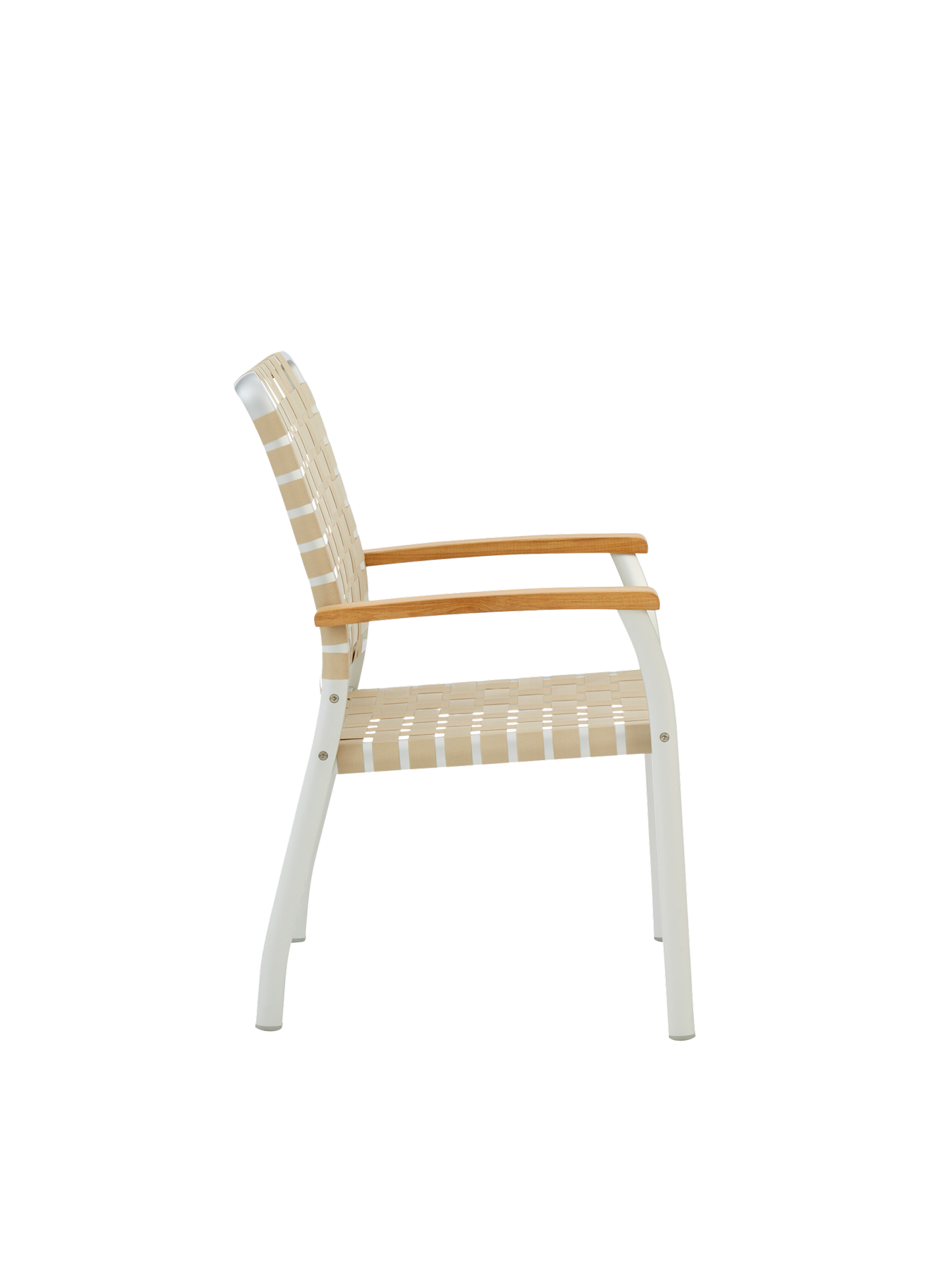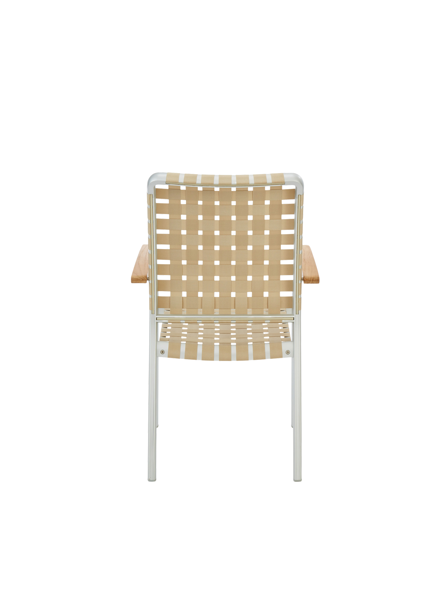 The armchairs of the series impress with their undeniable elegance. The 'invisible' attachment of the webbing to the curved frame of anodised aluminium has been achieved by a special technique, and ensures pleasant support and ergonomic comfort. Gently curved teak armrests are pleasant to the touch.