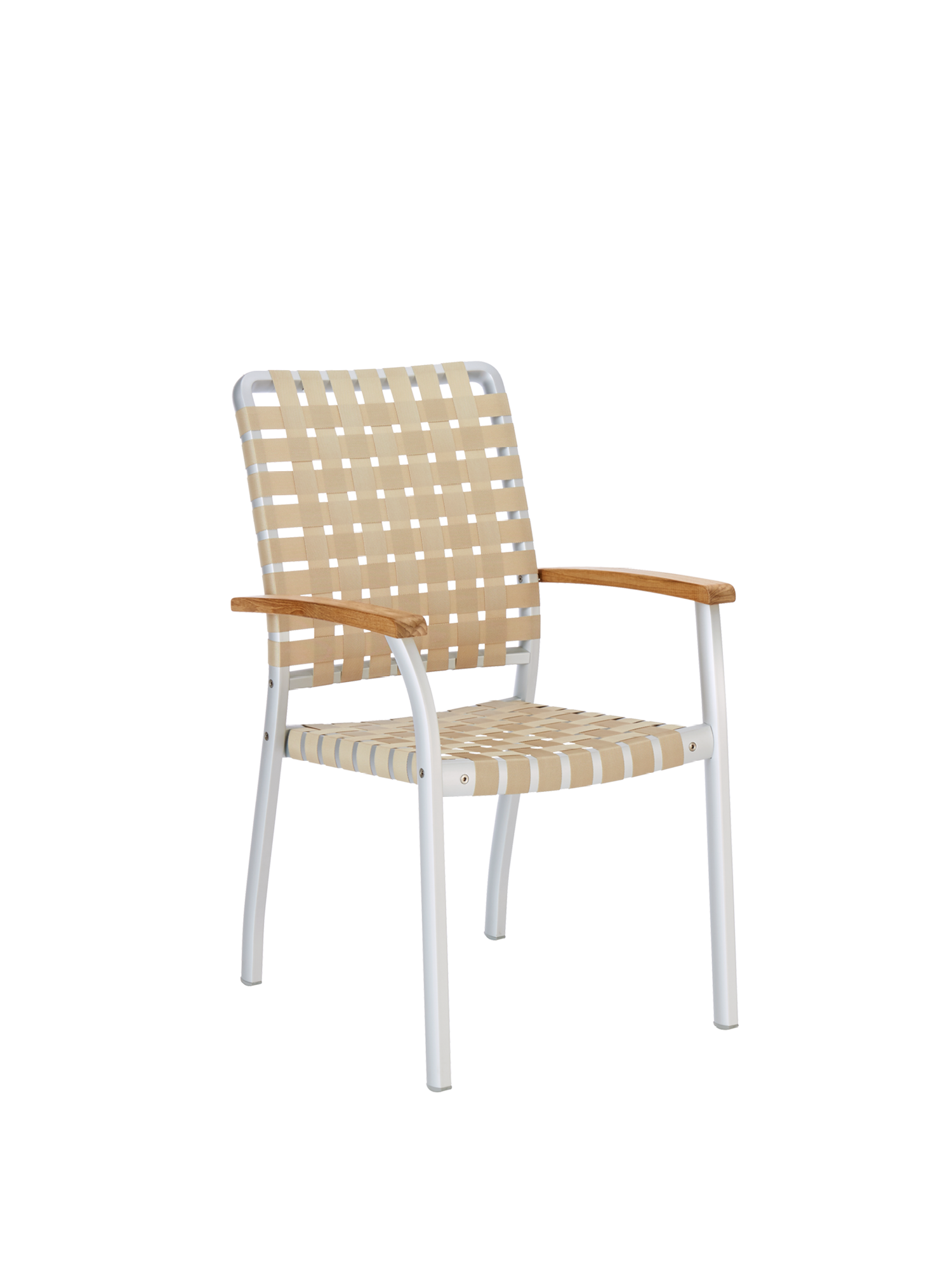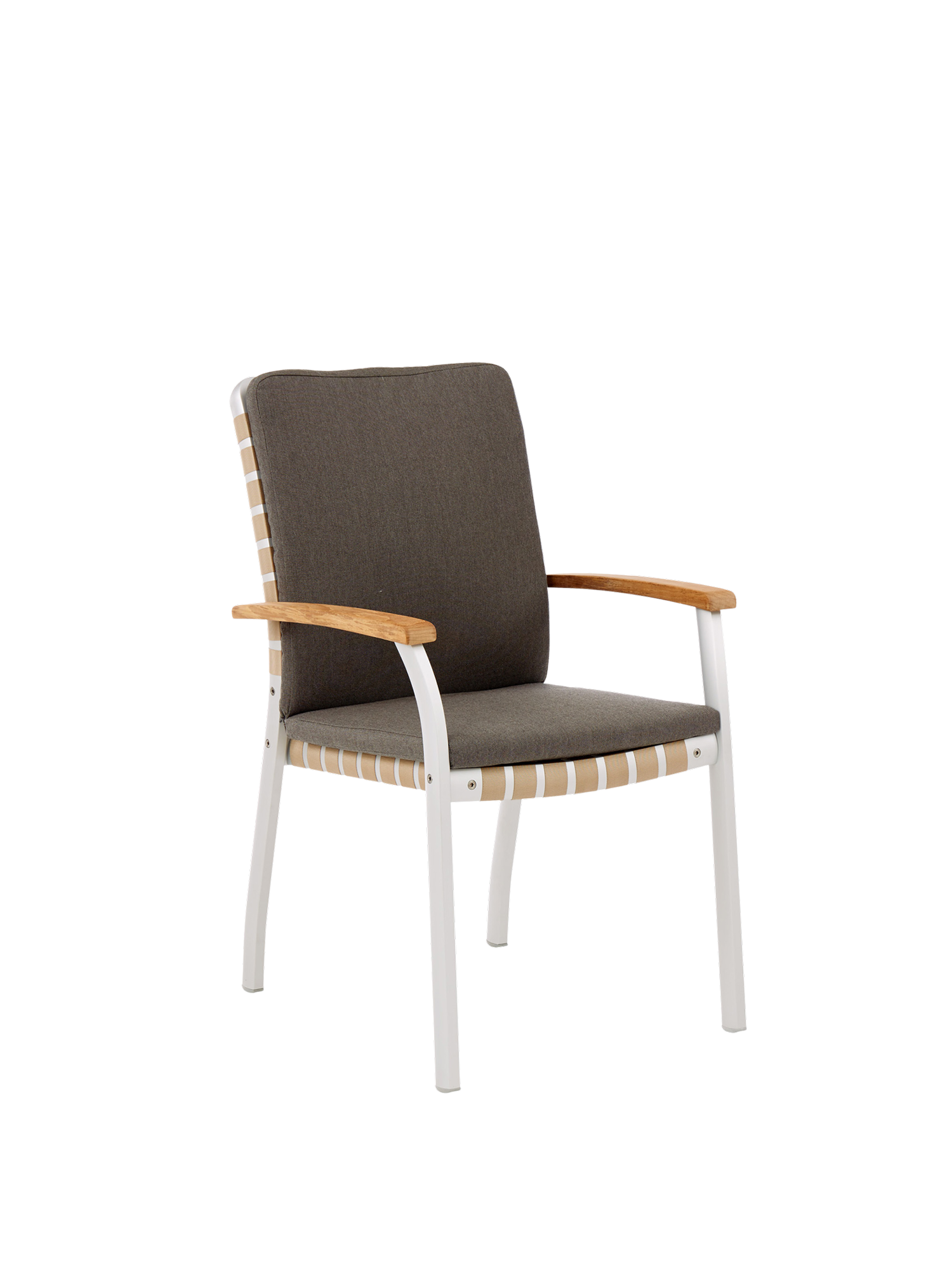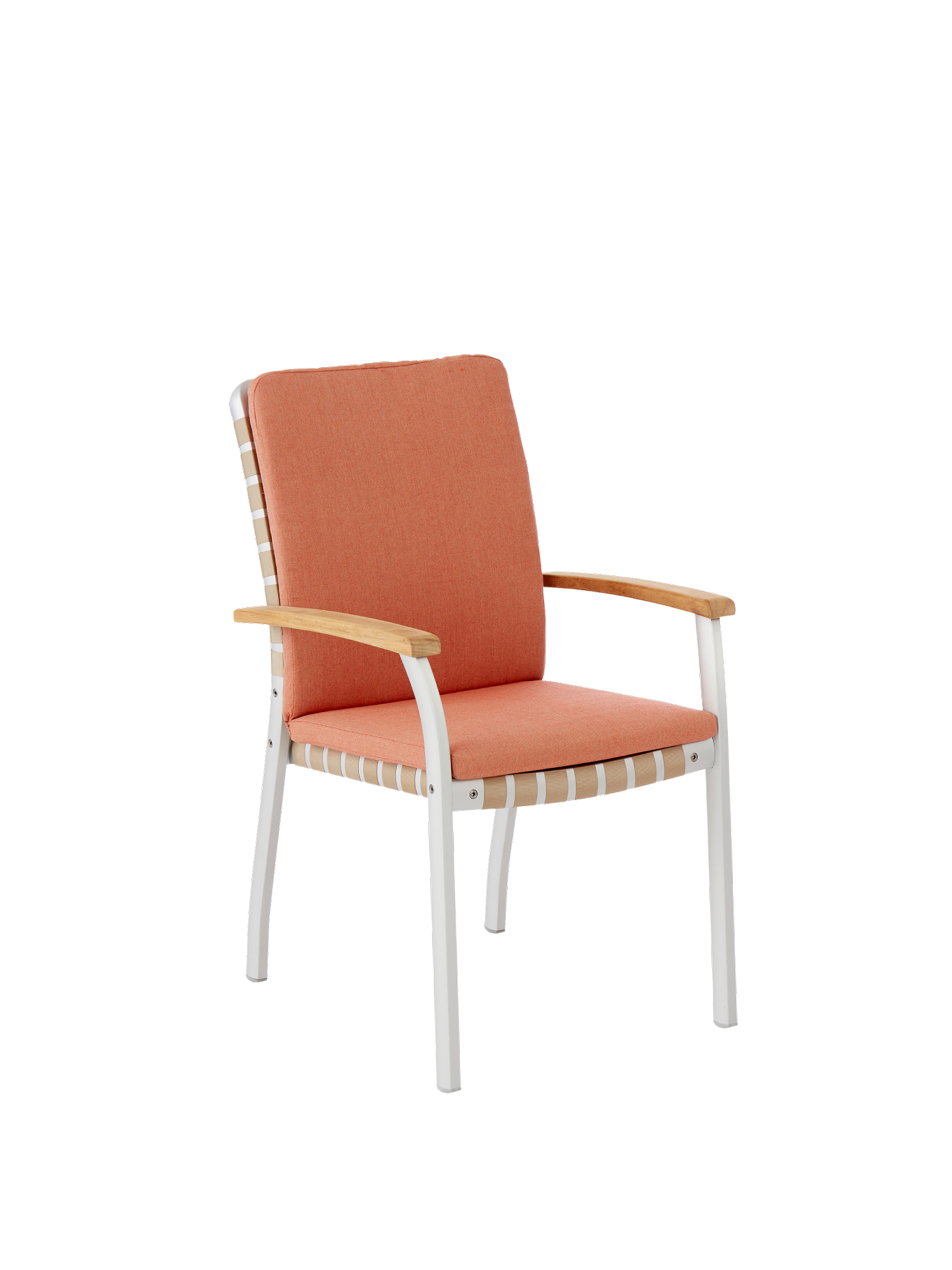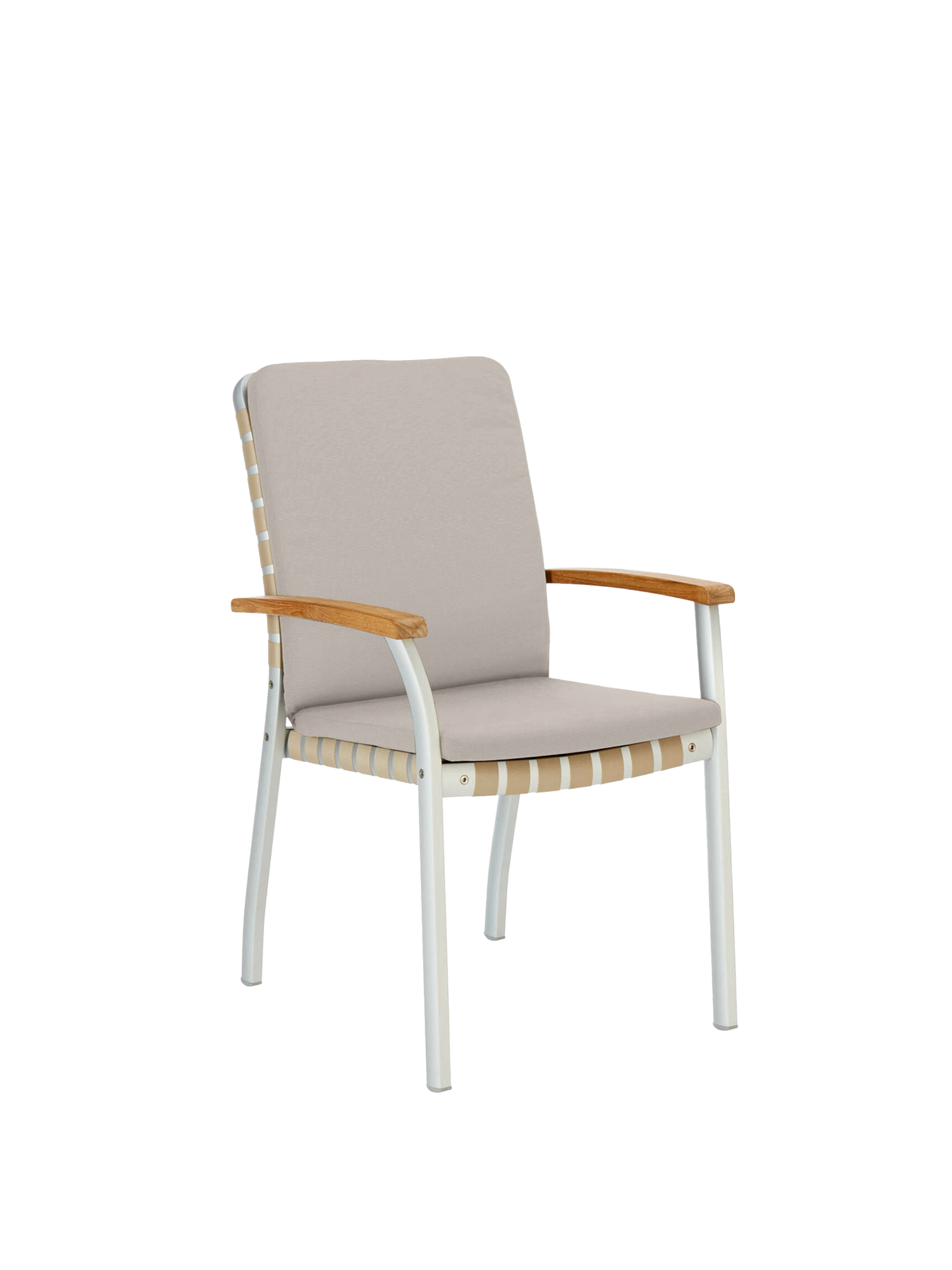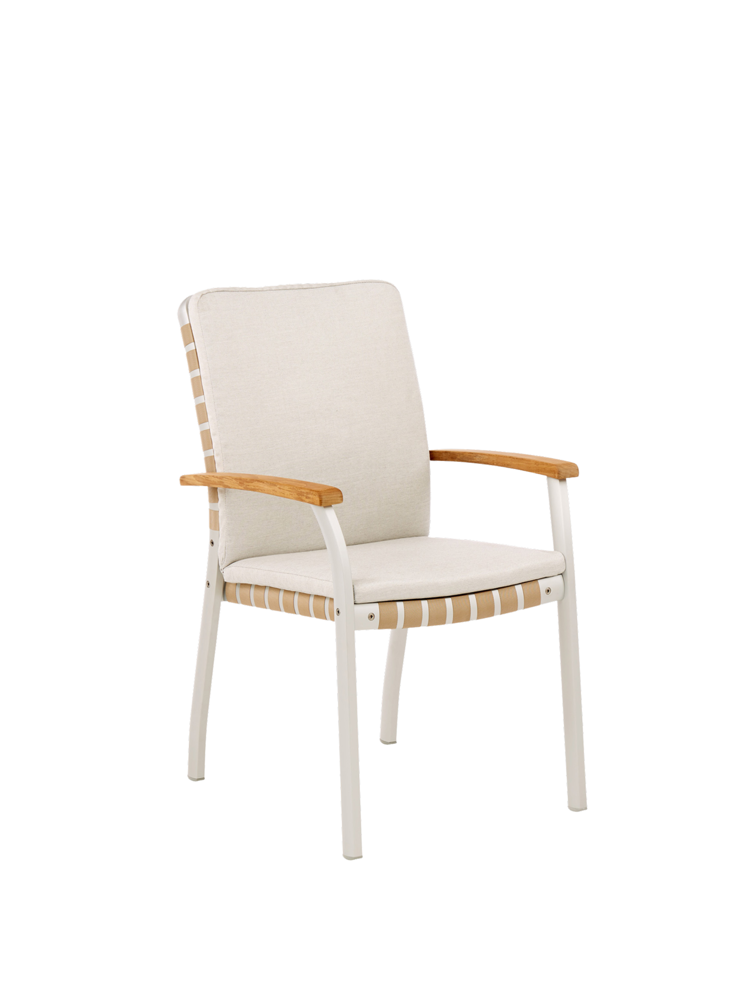 The armchairs of the series impress with their undeniable elegance. The 'invisible' attachment of the webbing to the curved frame of anodised aluminium has been achieved by a special technique, and ensures pleasant support and ergonomic comfort. Gently curved teak armrests are pleasant to the touch.