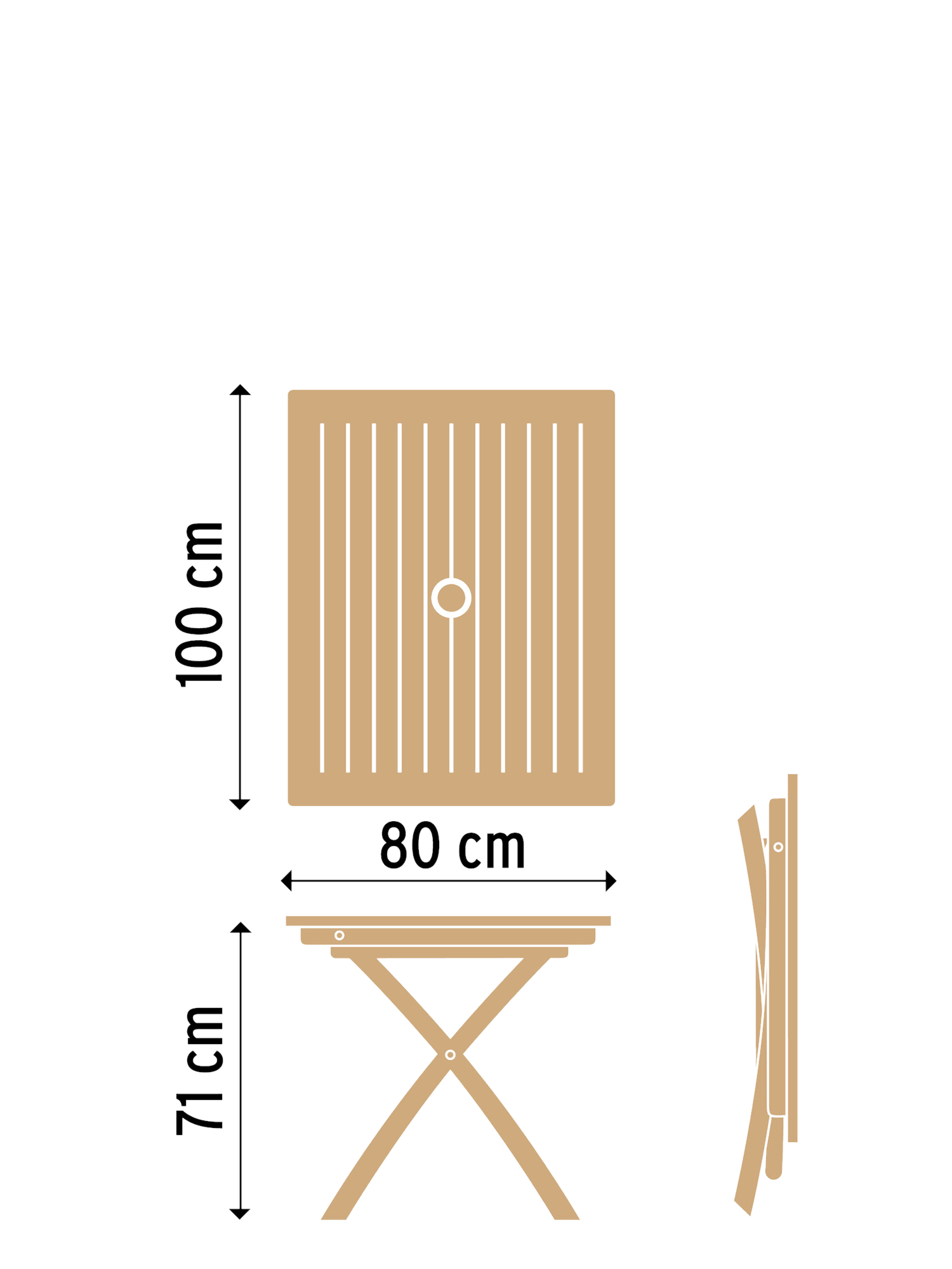 Aufgrund des simplen Klappmechanismus lässt sich der Tisch komfortabel transportieren und platzsparend verstauen. Das Schirmloch in der Mitte der Platte kann an sonnenärmeren Tagen mit einem Teakstopfen verschlossen werden.