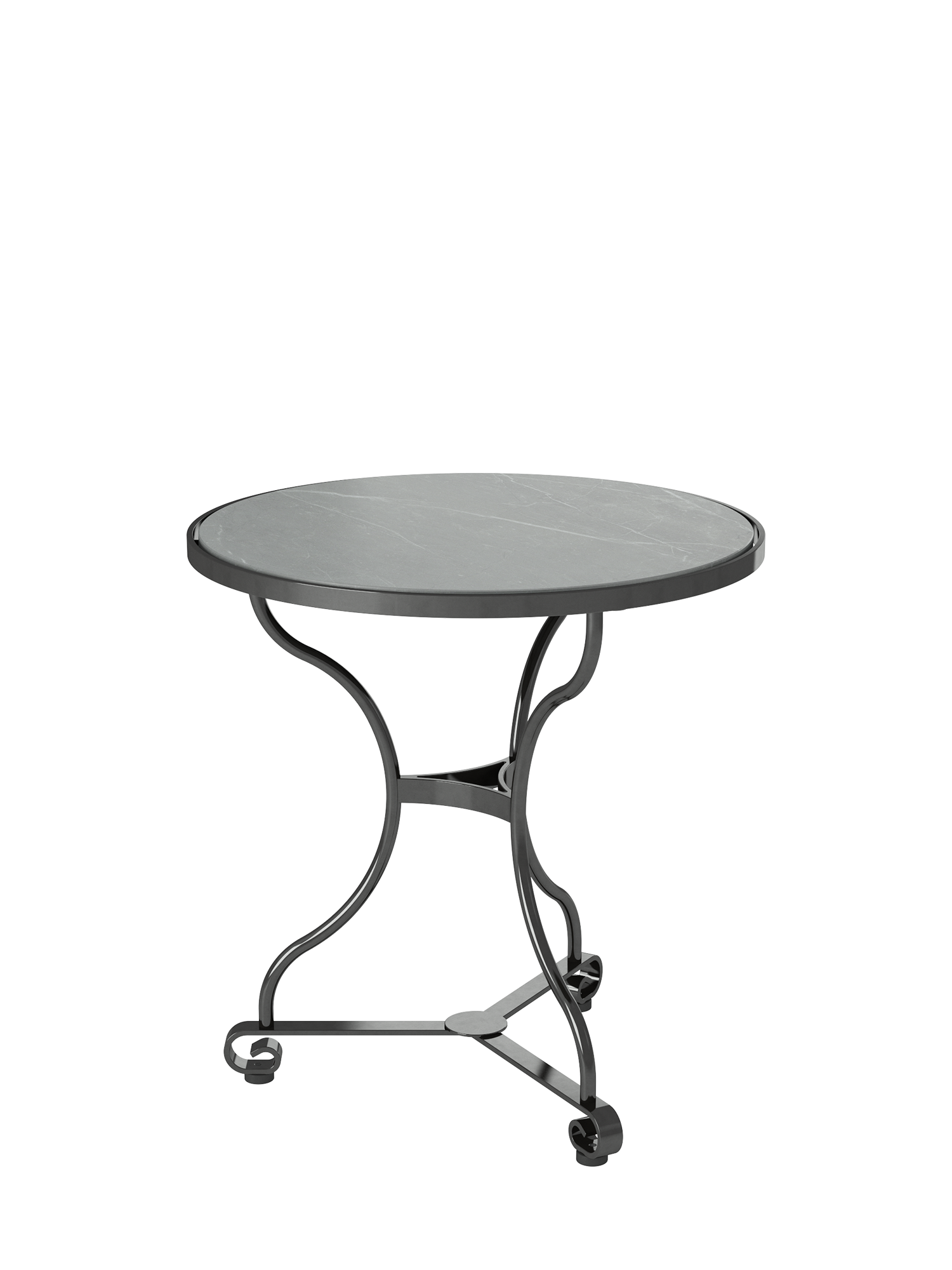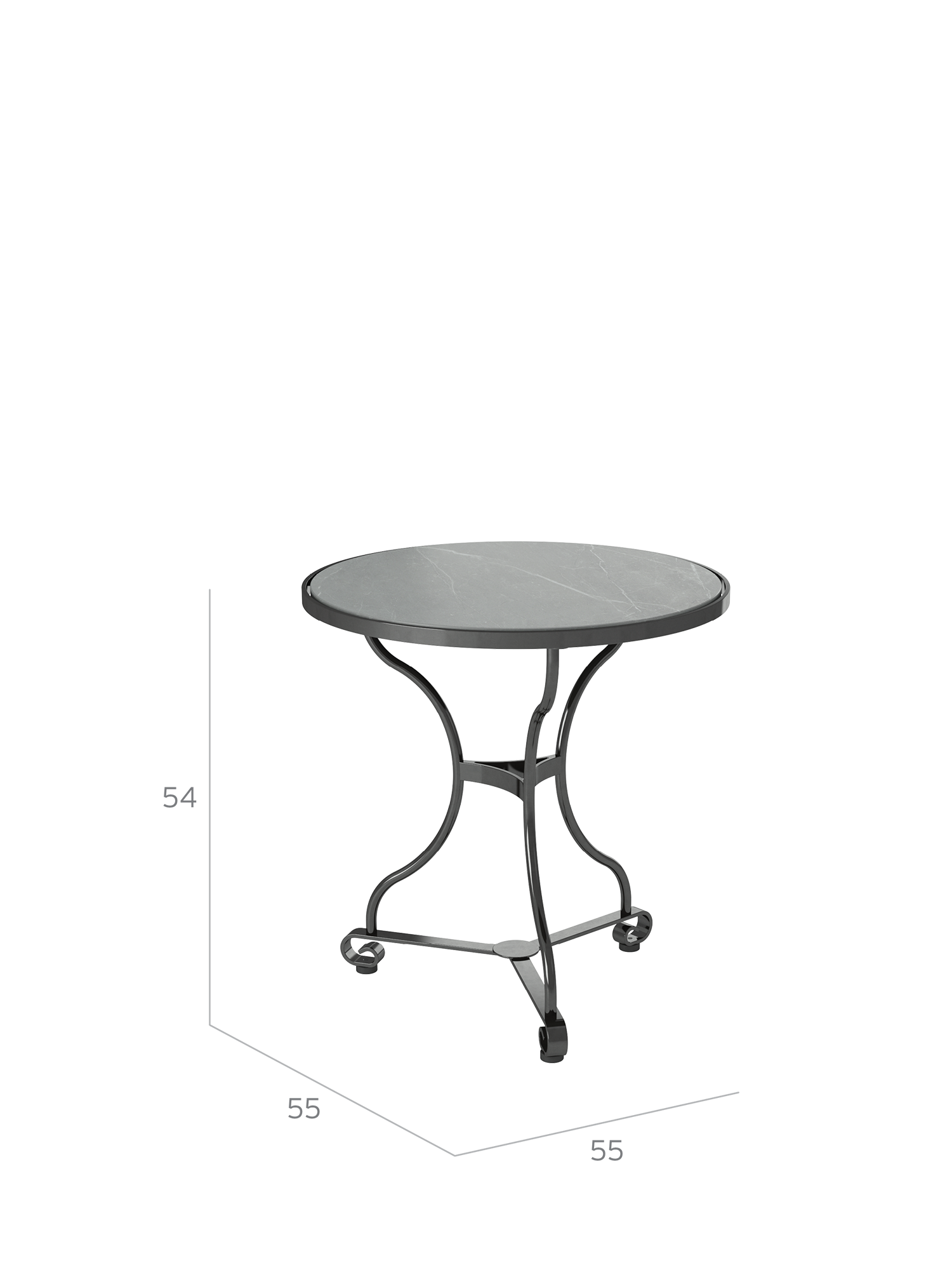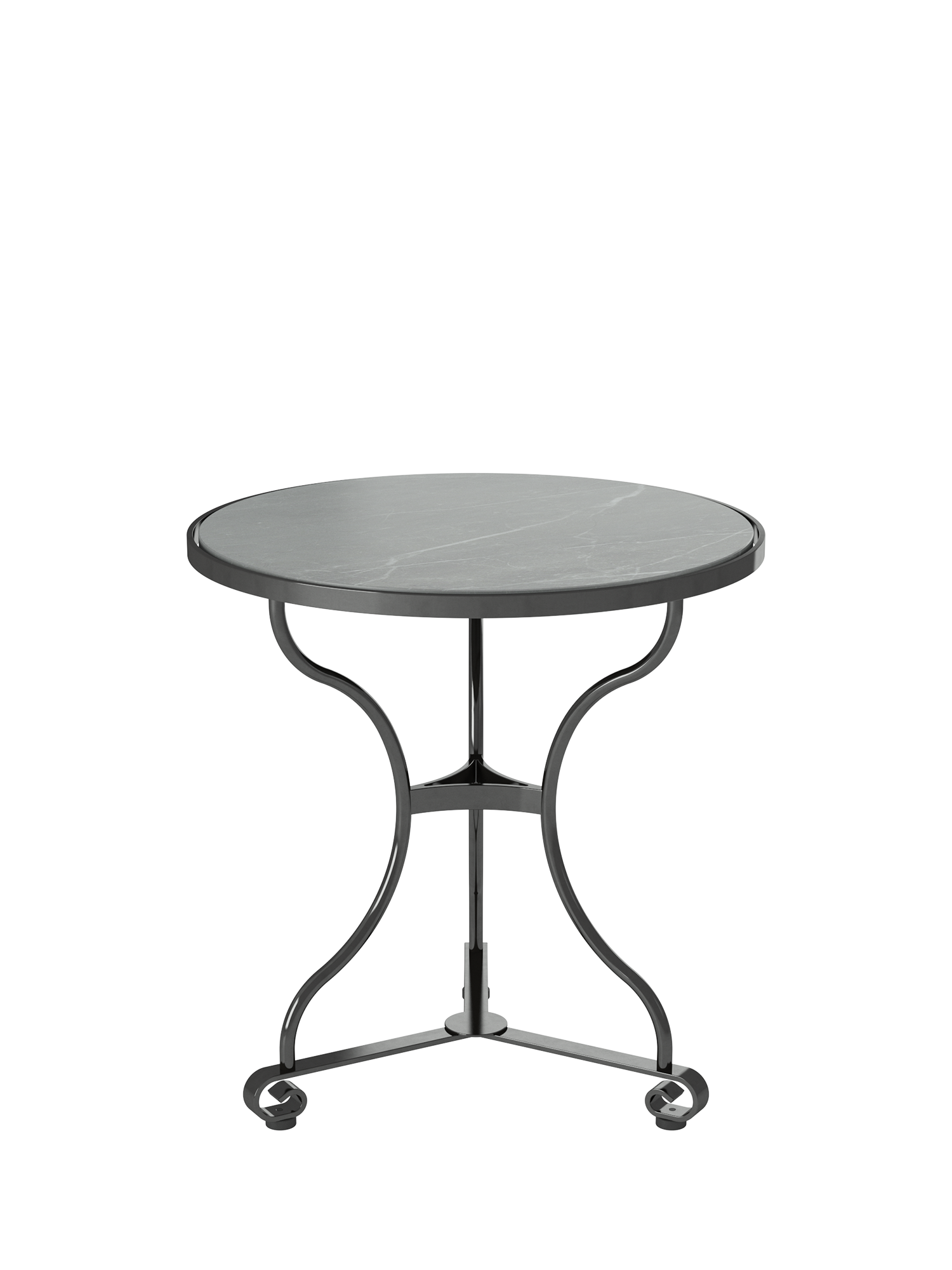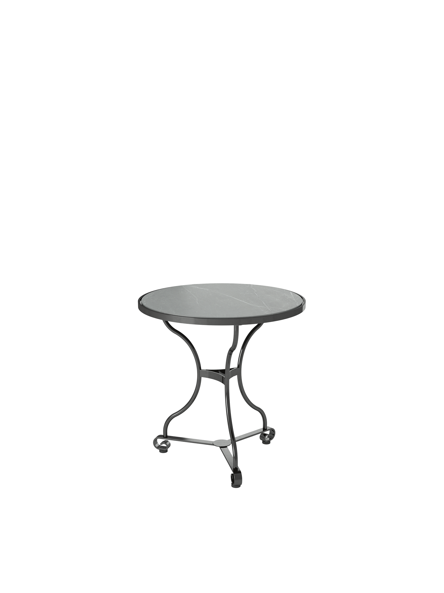 Der kleine runde Beistelltisch mit Keramikplatte hält Lektüre, Sonnenbrille und Erfrischungen jederzeit in Reichweite.