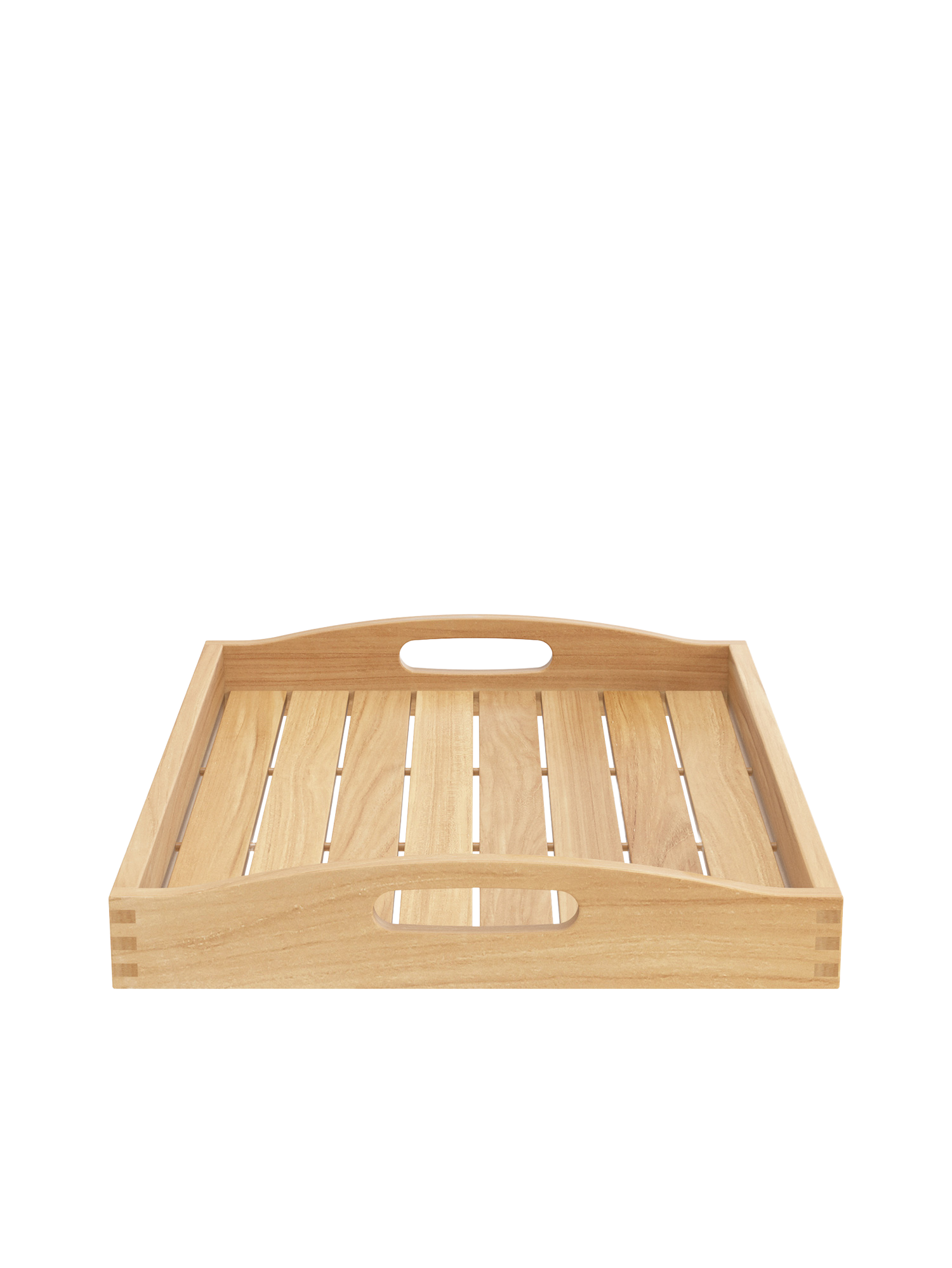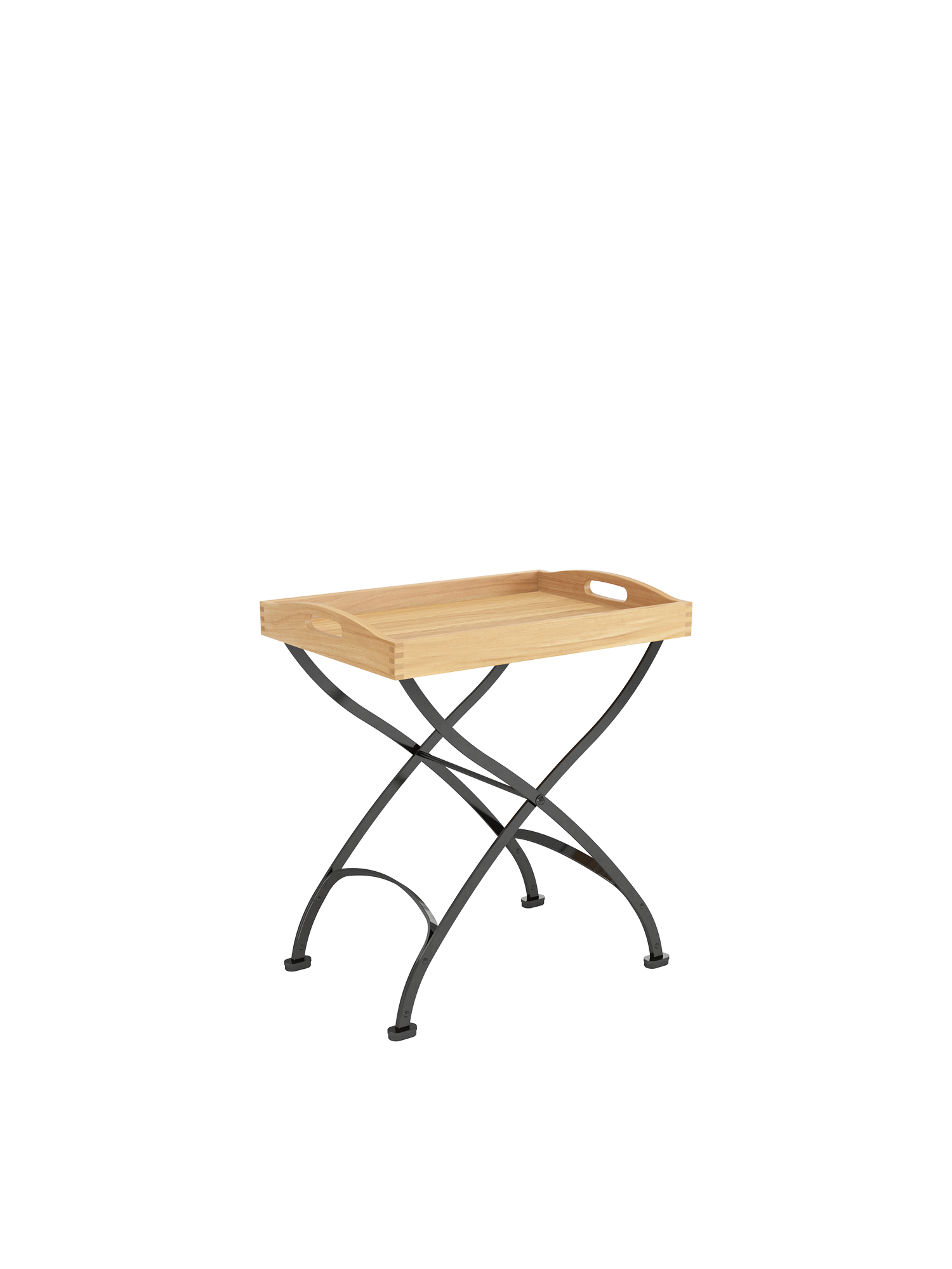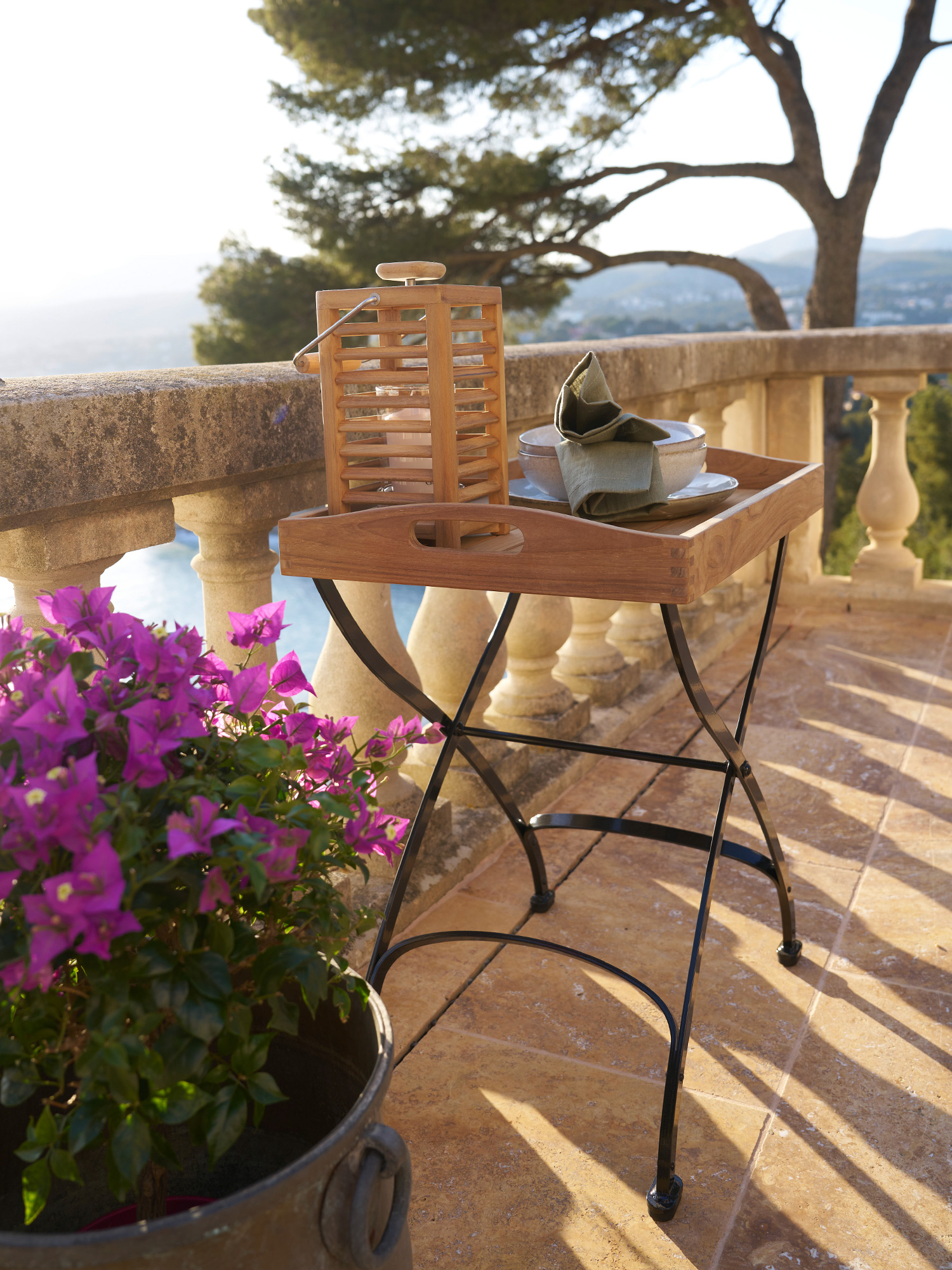 Überall schnell positioniert, wo zusätzlicher Platz bei Tisch benötigt wird, hält er alles in praktischer Reichweite. Das Gestell des Butler’s Tray besteht aus verzinktem, pulverbeschichtetem Stahl, das abnehmbare Tablett aus massiven Teakleisten ist auch einzeln erhältlich. Fussgleiter aus abriebfestem Kunststoff schützen wertvolle Böden vor Kratzern.