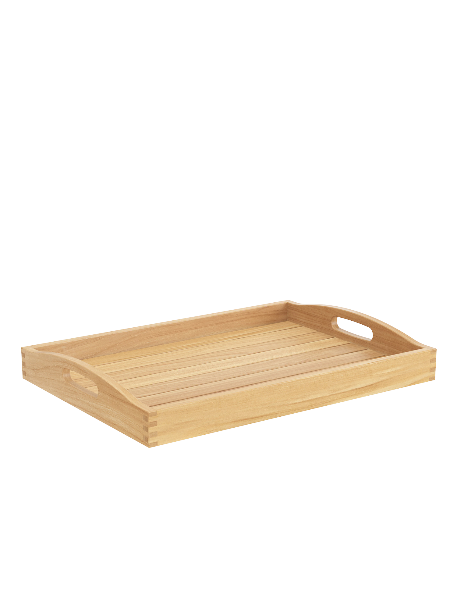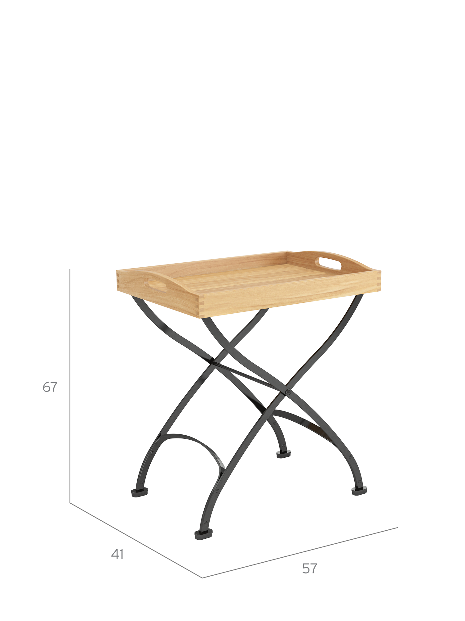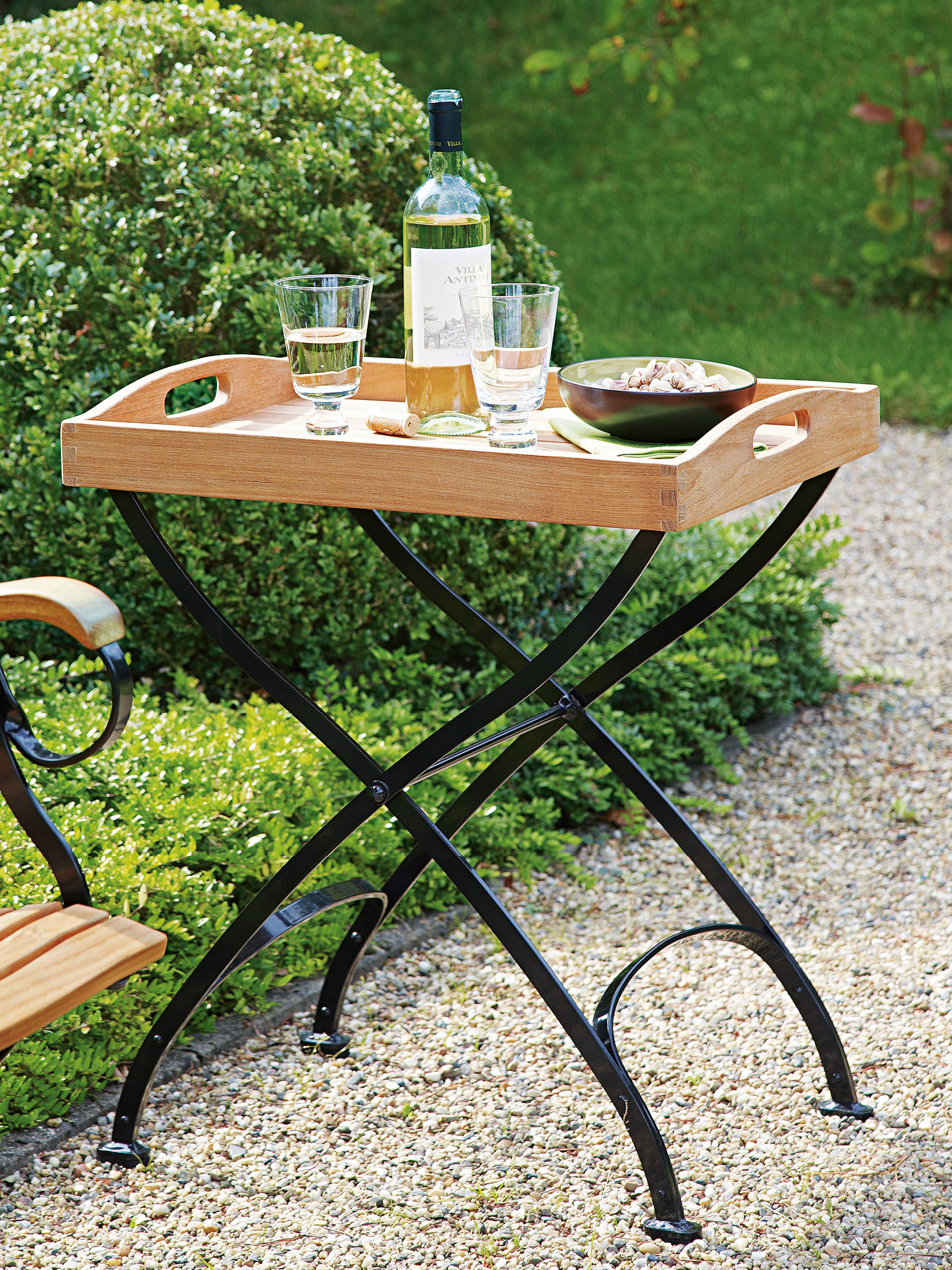 Überall schnell positioniert, wo zusätzlicher Platz bei Tisch benötigt wird, hält er alles in praktischer Reichweite. Das Gestell des Butler’s Tray besteht aus verzinktem, pulverbeschichtetem Stahl, das abnehmbare Tablett aus massiven Teakleisten ist auch einzeln erhältlich. Fussgleiter aus abriebfestem Kunststoff schützen wertvolle Böden vor Kratzern.