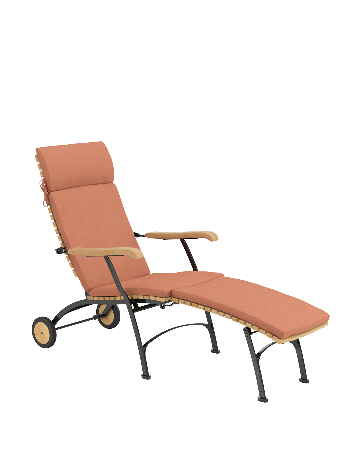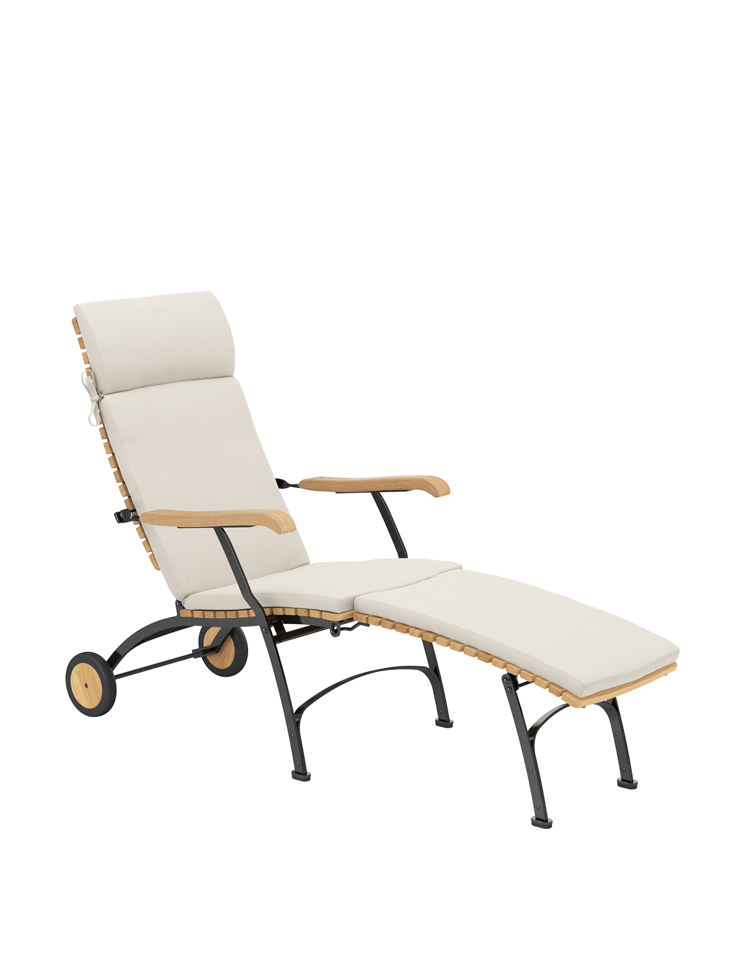Die Rückenlehne des Deck Chairs lässt sich vierfach verstellen. Sie besteht aus massiven Teakleisten, die in engem Abstand aufeinander folgen. Ihre Form ist nach einem der ungewöhnlichsten Kurvenverläufe modelliert: dem des menschlichen Rückens. Dank seines einfach abzunehmenden Fussteils verwandelt sich der Deck Chair im Handumdrehen in einen komfortablen Sessel. Auflagen in verschiedenen Farbtönen erhöhen noch die Bequemlichkeit der Möbel und setzen feine Akzente.