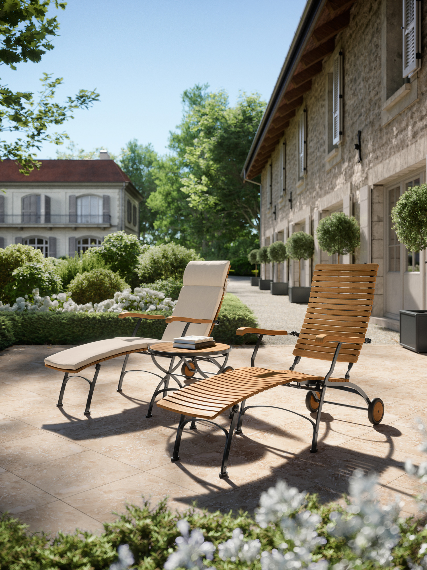 - ergonomisch geformte Liegefläche aus wetterfestem Plantagenteak