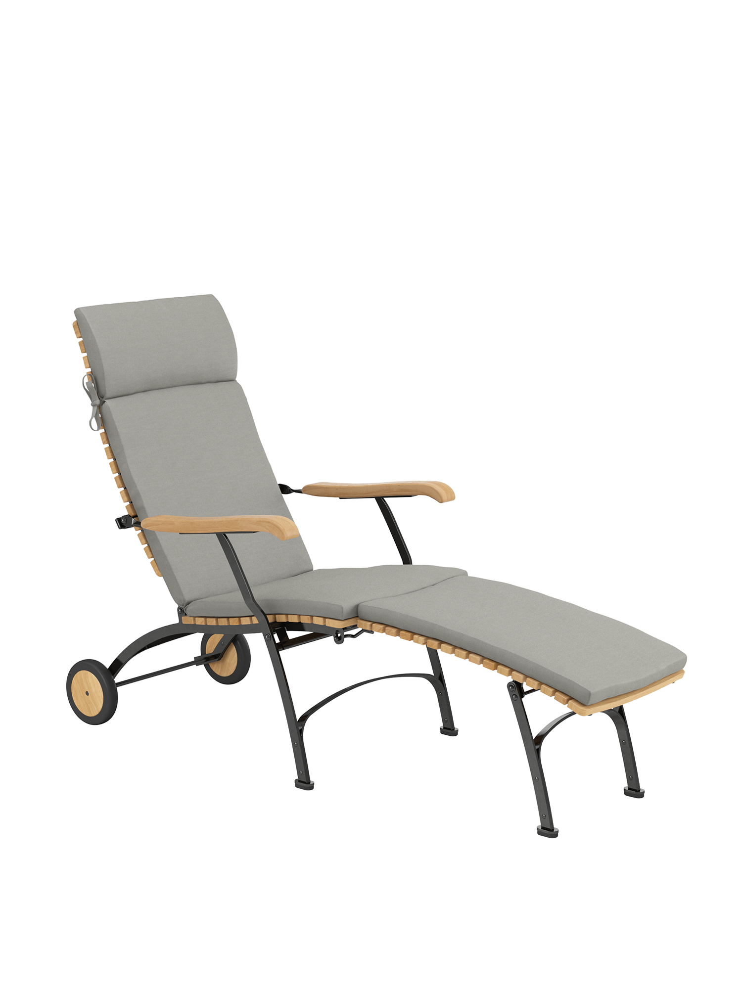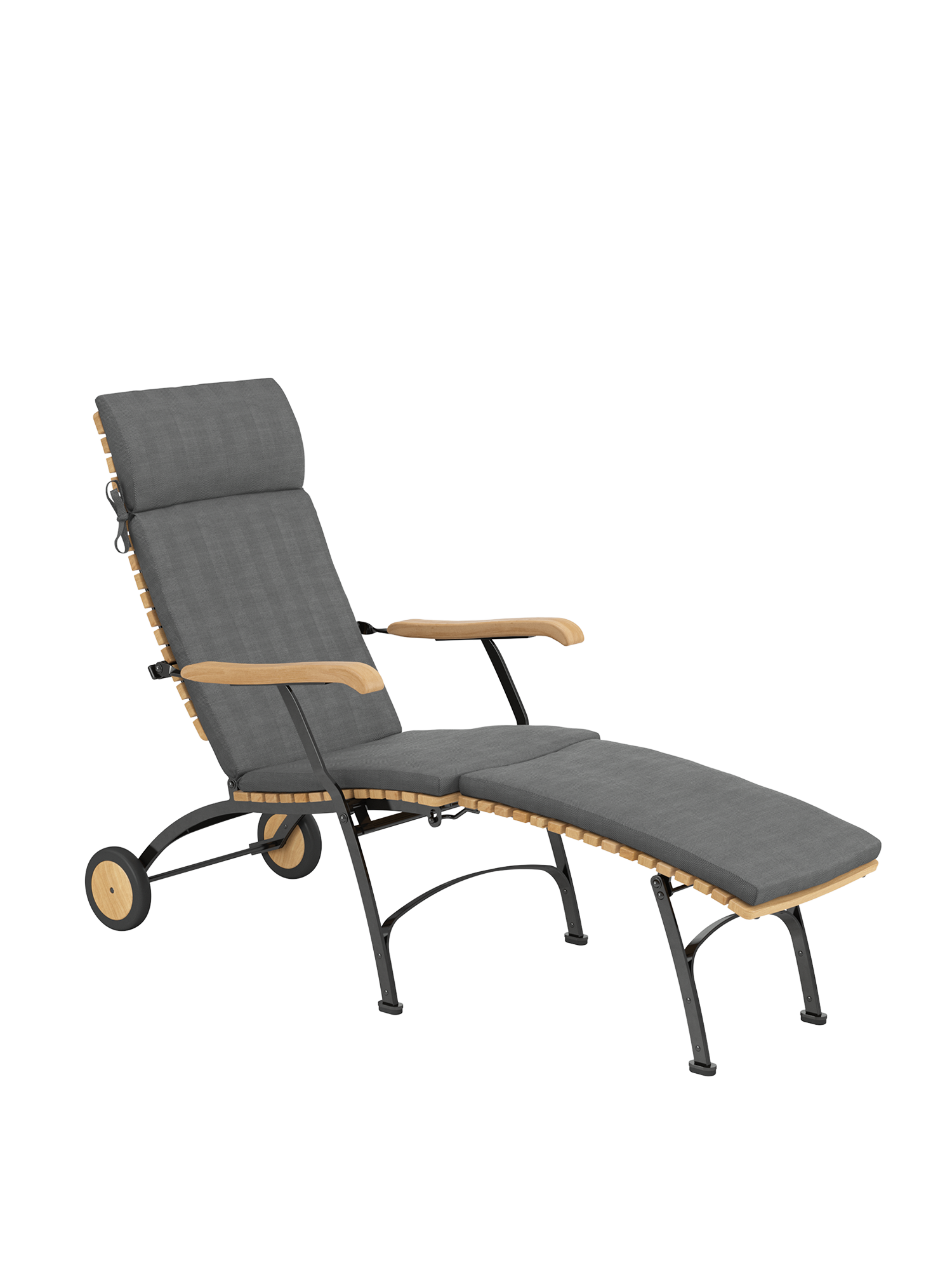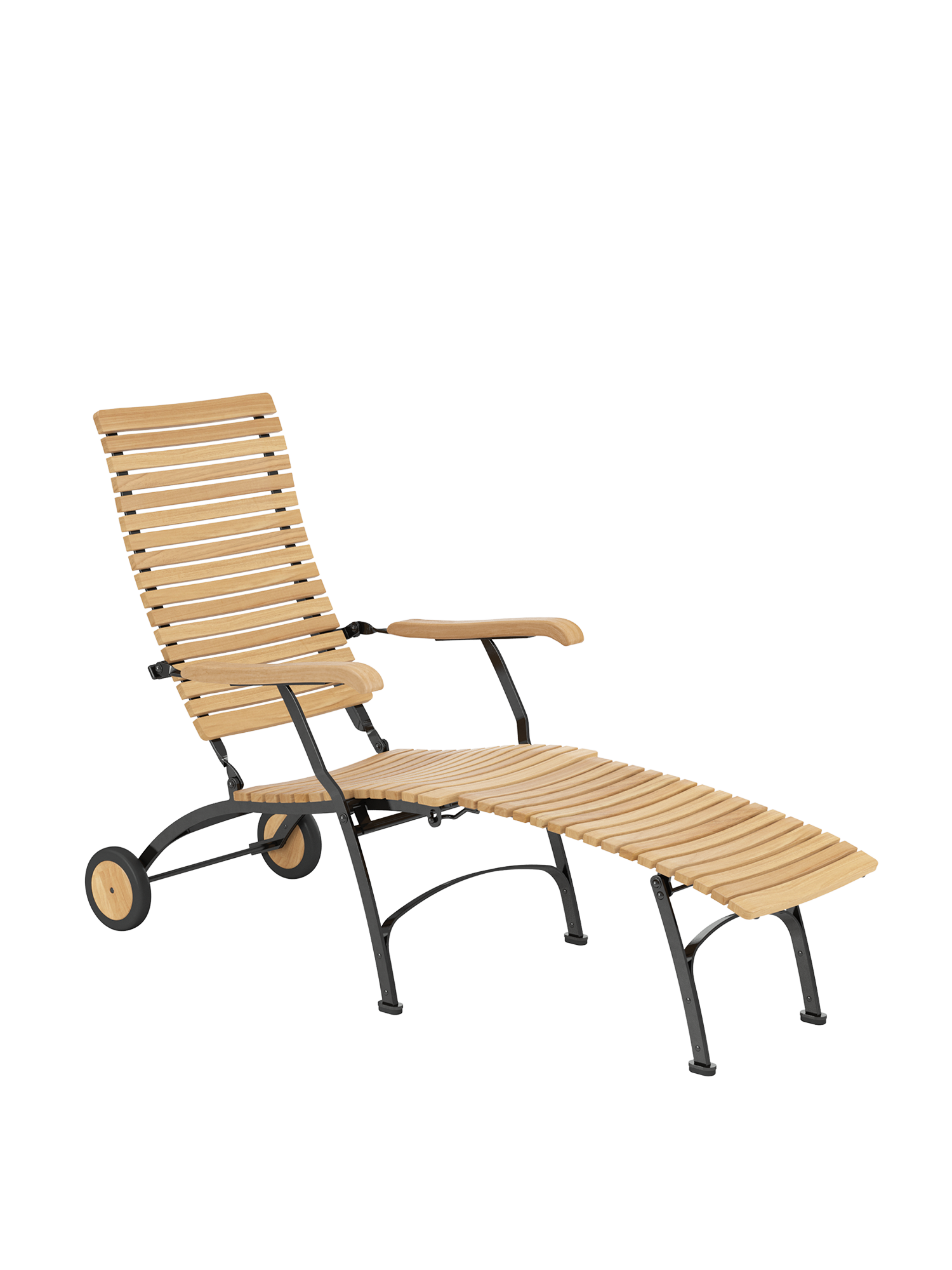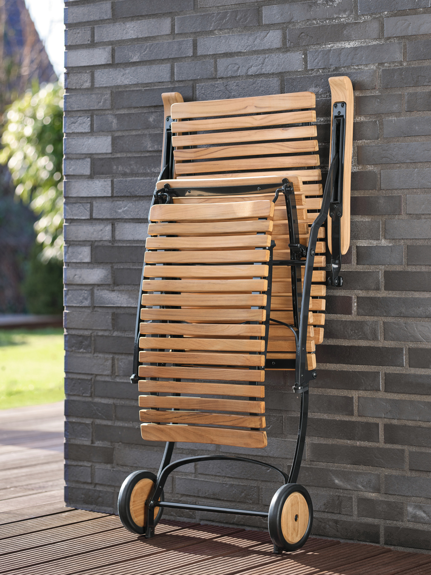 Alle Drehverbindungen aus Edelstahlbolzen sind rostfrei gelagert - für eine dauerhafte Funktion im Freien. Laufrollen aus hochwertigem Polyamid, die unter der Sitzfläche angebracht sind, unterstützen leichtgängiges Klappen und schonen die beschichteten Metallteile. Das Gestell ist aus verzinktem und damit rostgeschütztem Stahl, graphitschwarz pulverbeschichtet. Mit seinen Rädern aus Teak lässt sich der Deck Chair einfach durch den Garten bewegen. Fussgleiter aus abriebfestem Kunststoff schützen wertvolle Böden vor Kratzern.