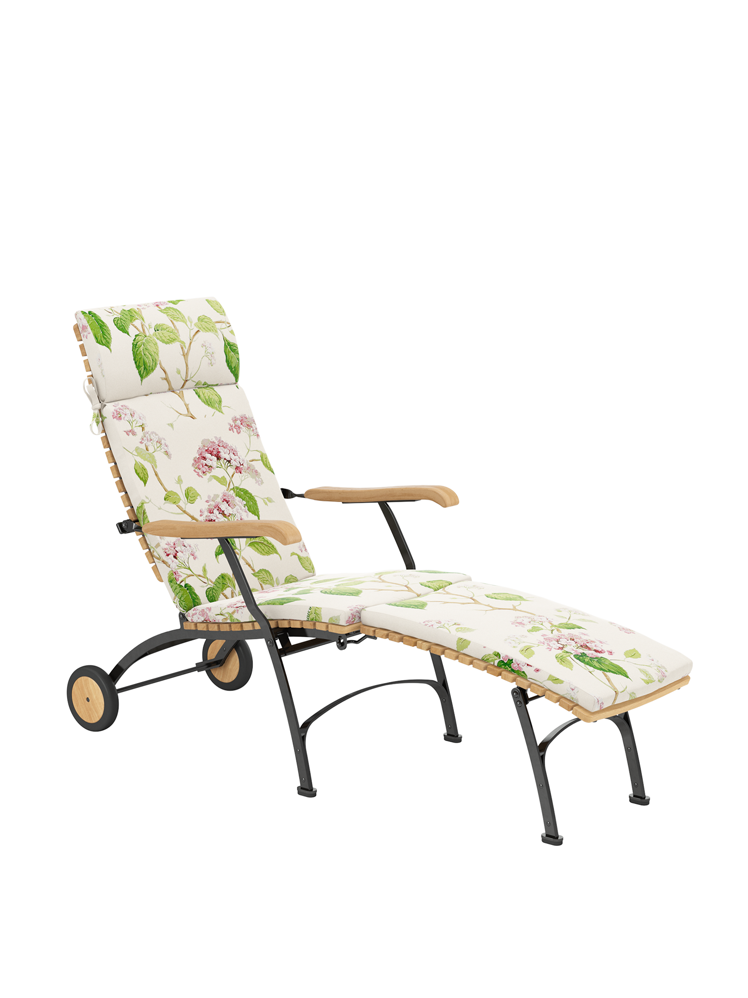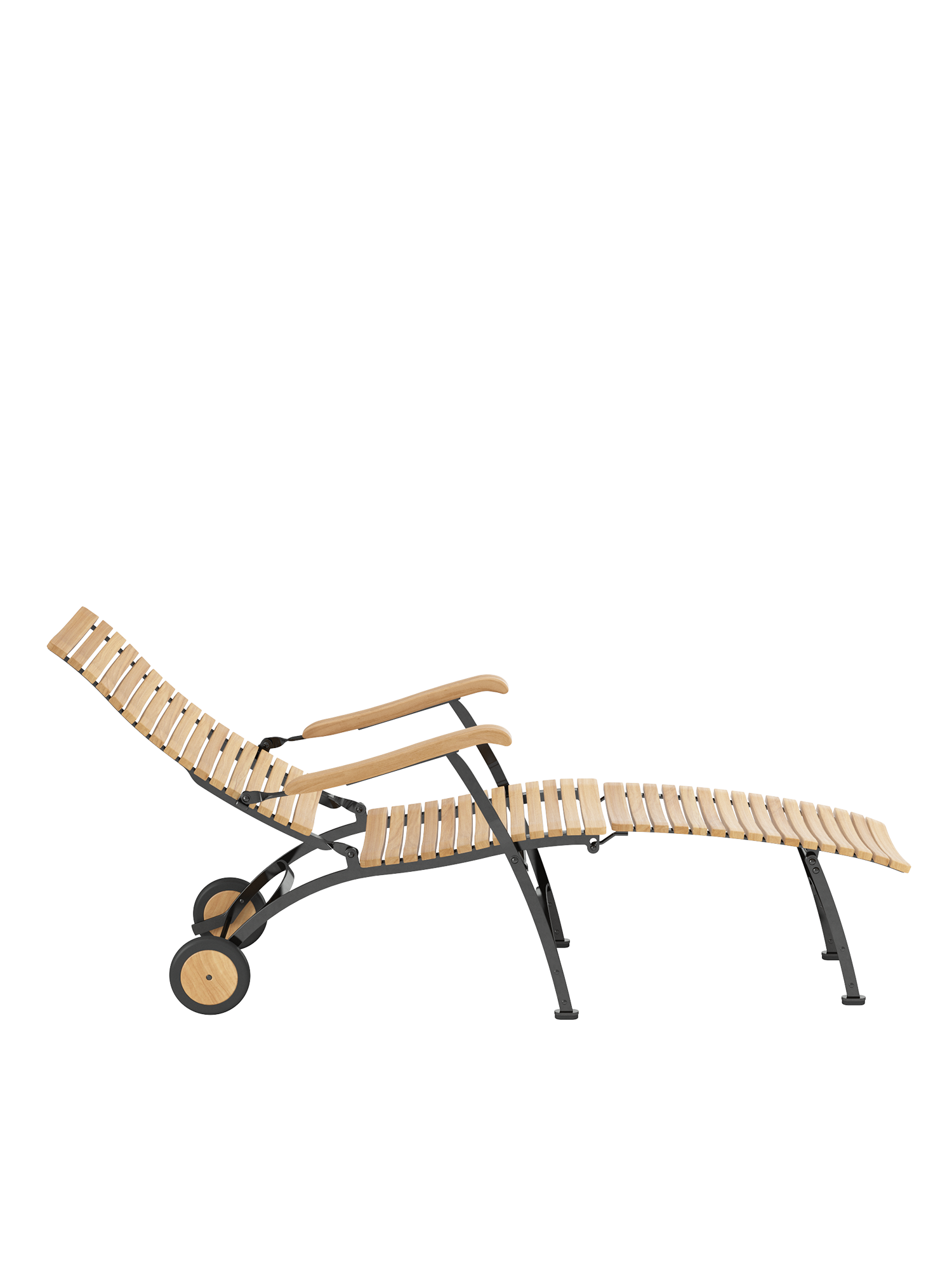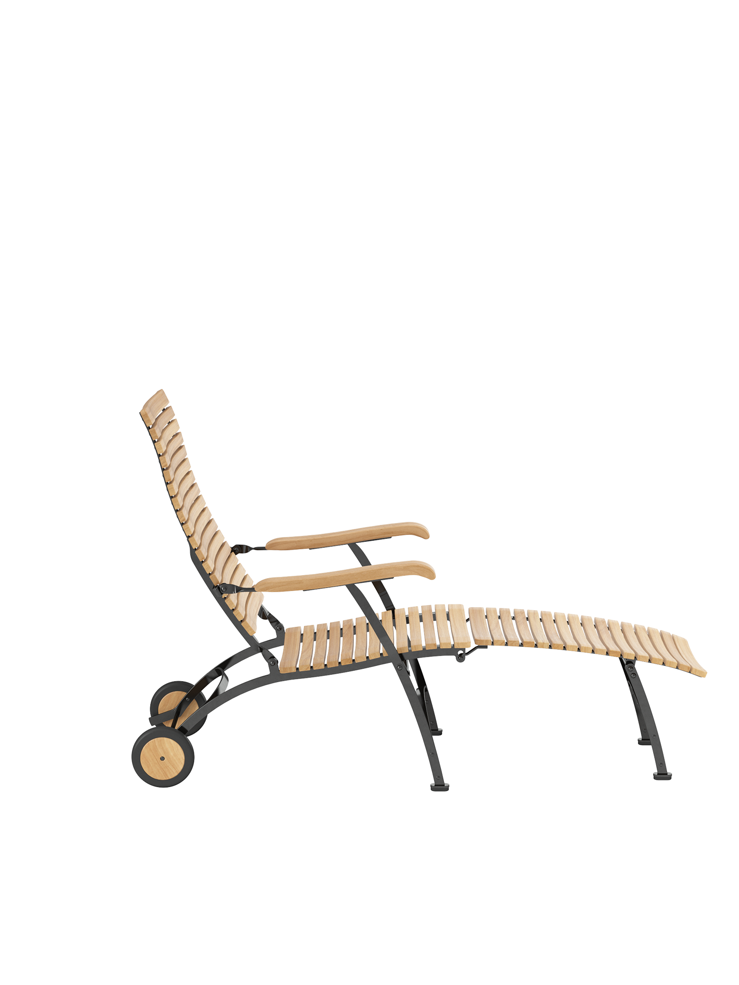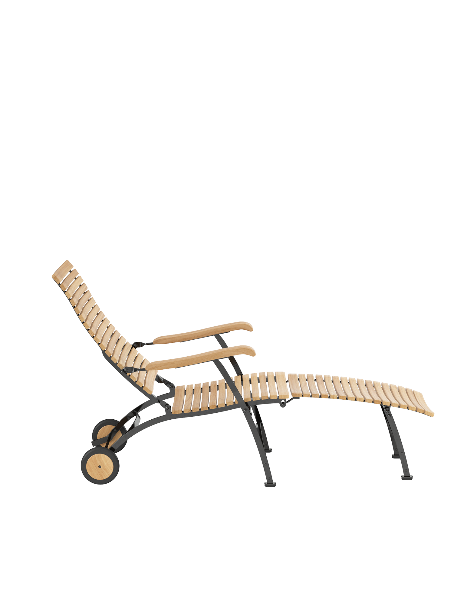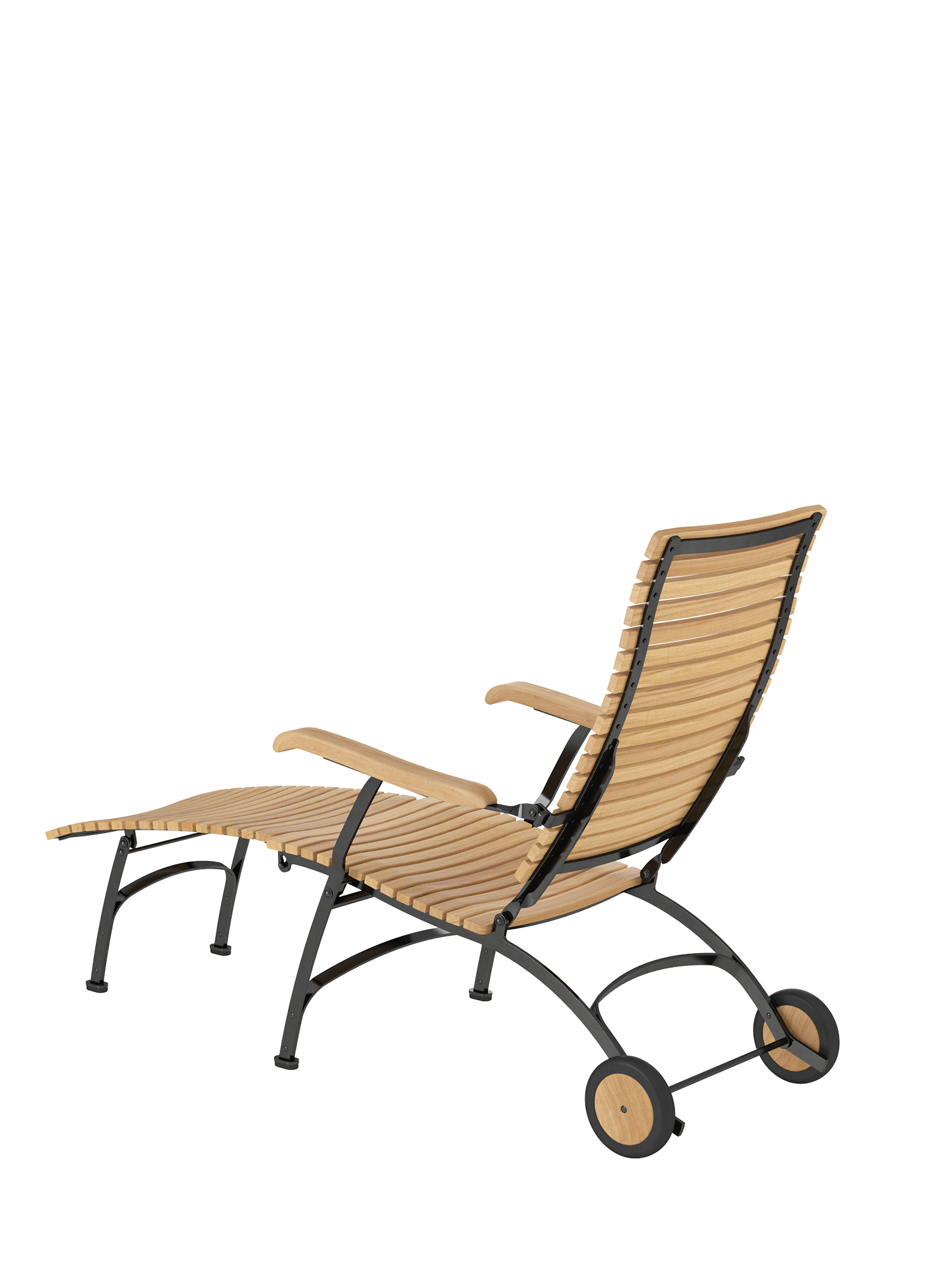 Alle Drehverbindungen aus Edelstahlbolzen sind rostfrei gelagert - für eine dauerhafte Funktion im Freien. Laufrollen aus hochwertigem Polyamid, die unter der Sitzfläche angebracht sind, unterstützen leichtgängiges Klappen und schonen die beschichteten Metallteile. Das Gestell ist aus verzinktem und damit rostgeschütztem Stahl, graphitschwarz pulverbeschichtet. Mit seinen Rädern aus Teak lässt sich der Deck Chair einfach durch den Garten bewegen. Fussgleiter aus abriebfestem Kunststoff schützen wertvolle Böden vor Kratzern.