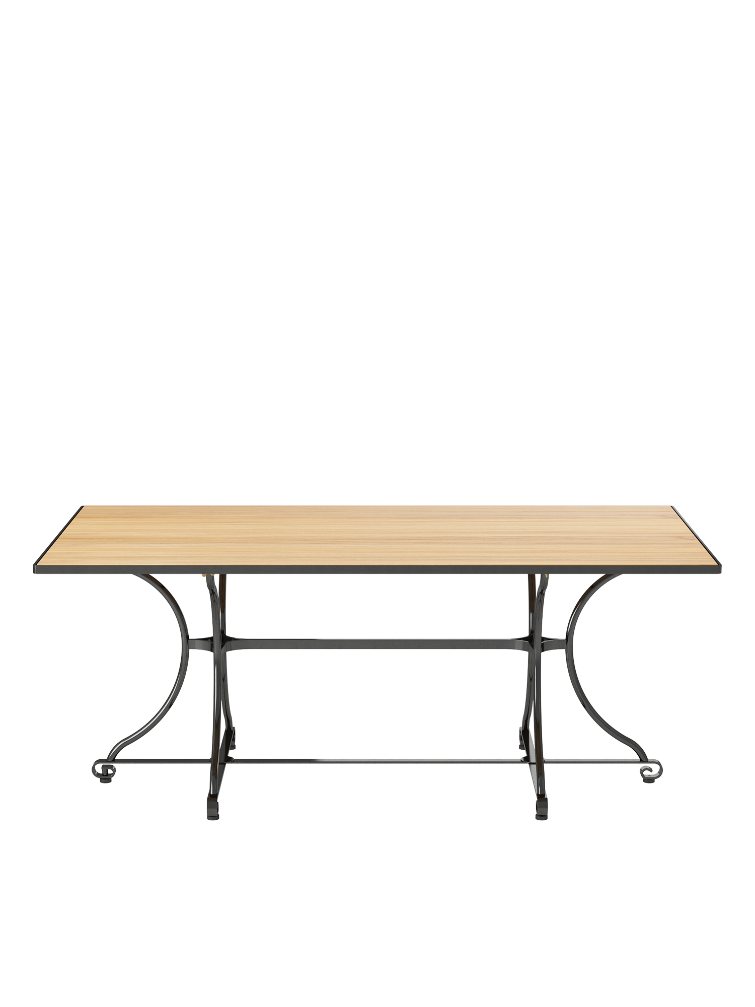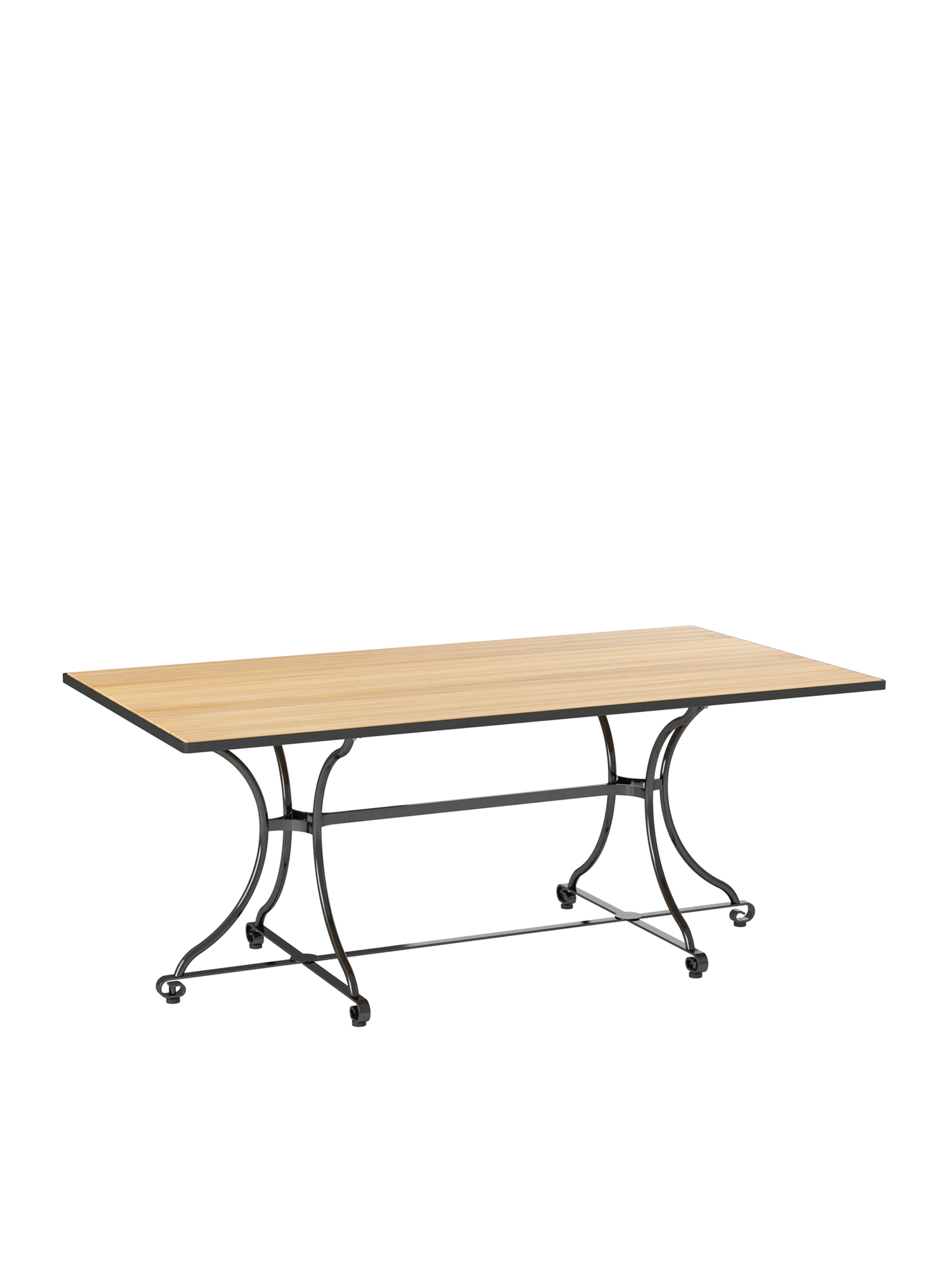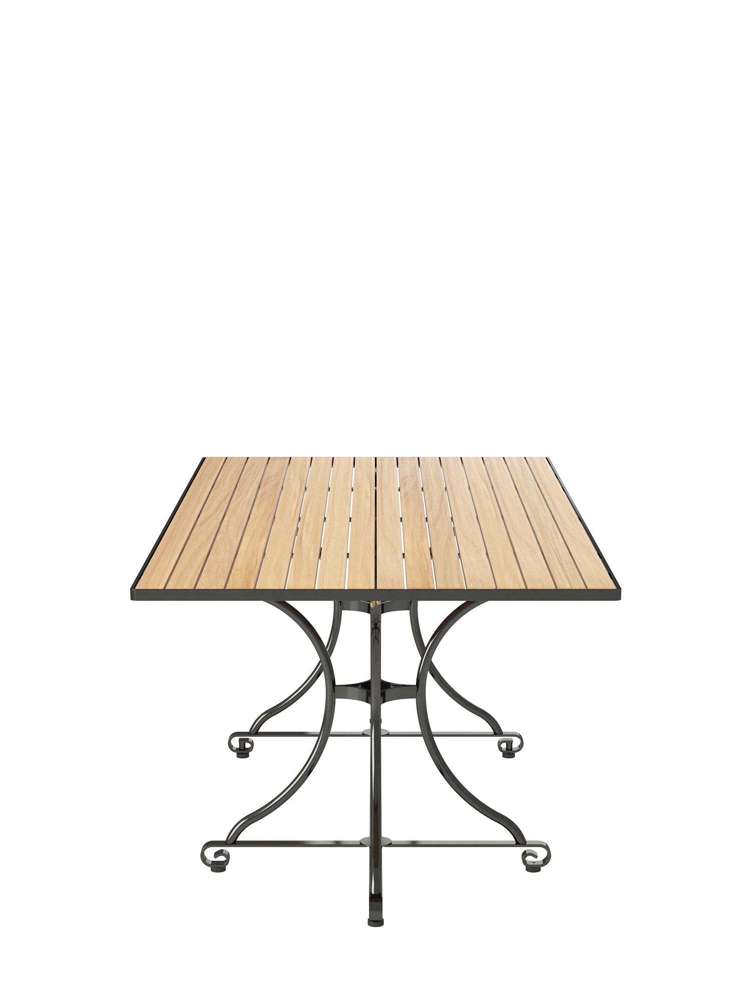 Die Platte des Gartentisches besteht aus Teakleisten in einem Stahlreif, das nicht klappbare Gestell aus verzinktem, graphitschwarz pulverbeschichtetem Stahl. Höhenverstellbare Fussgleiter gleichen Bodenunebenheiten flexibel aus.