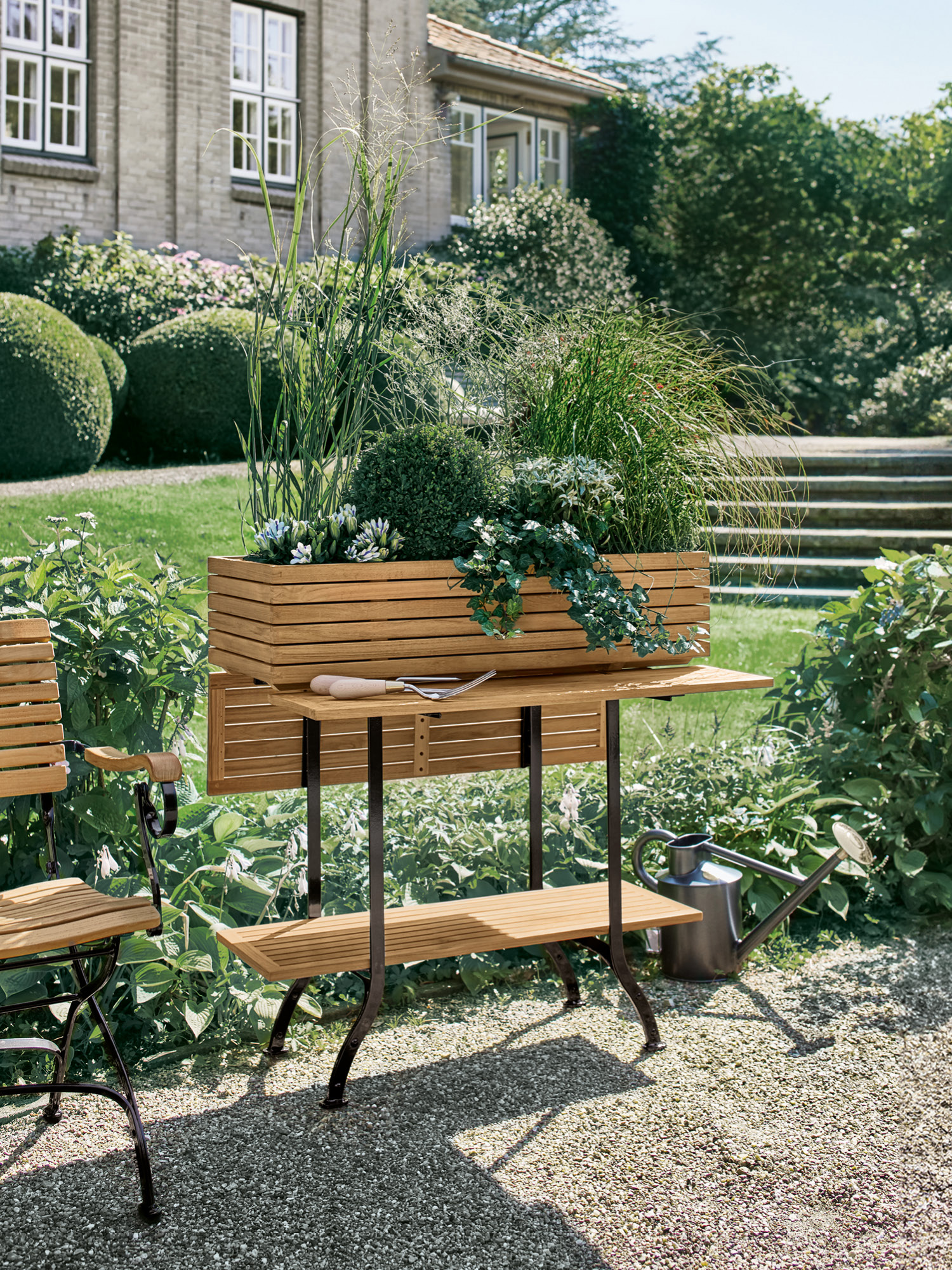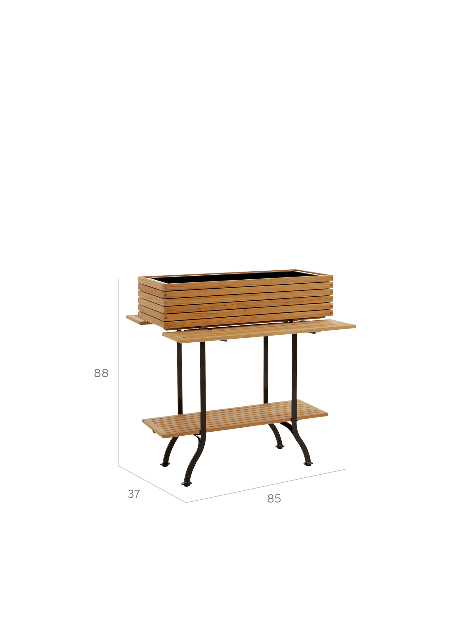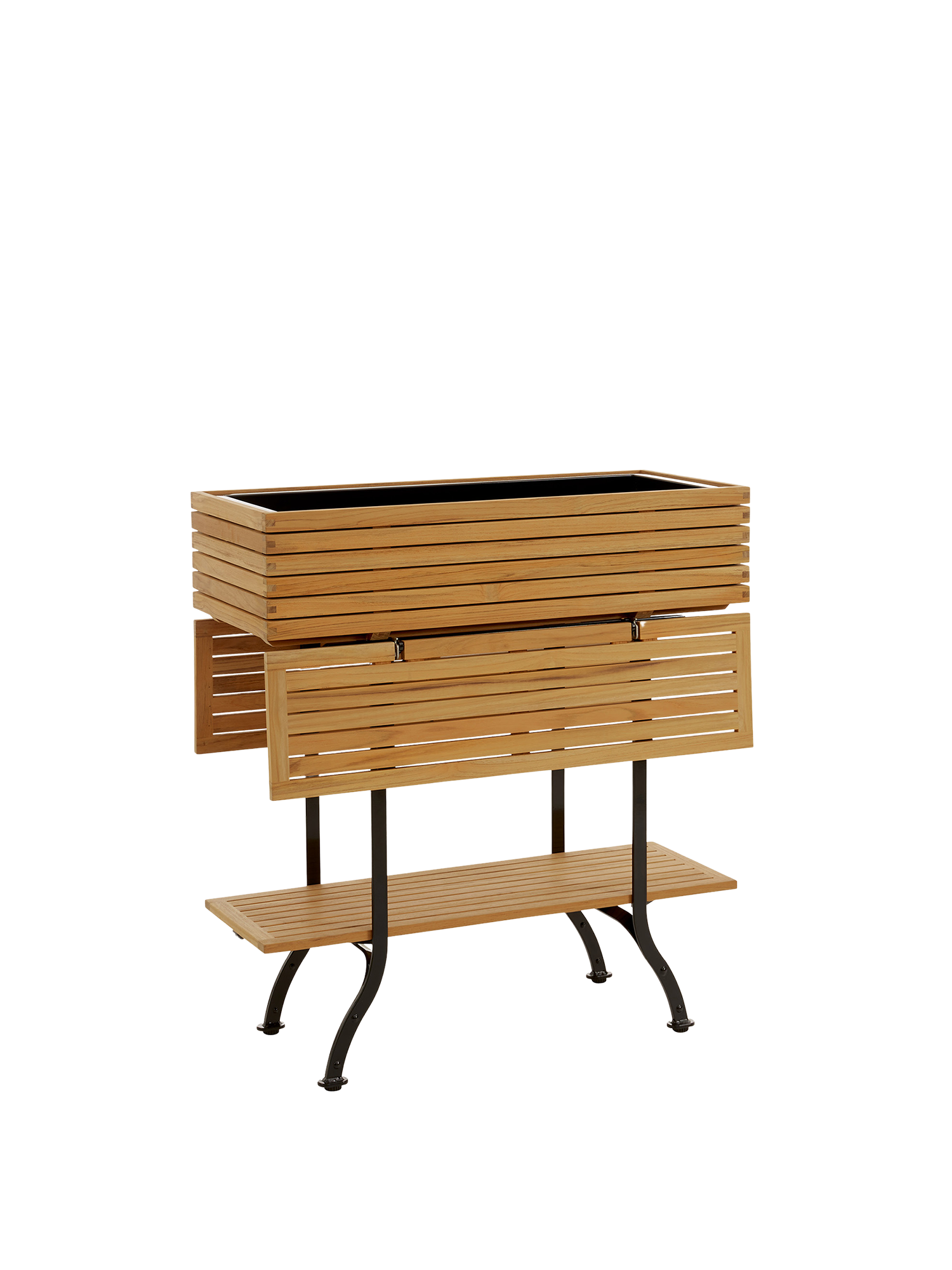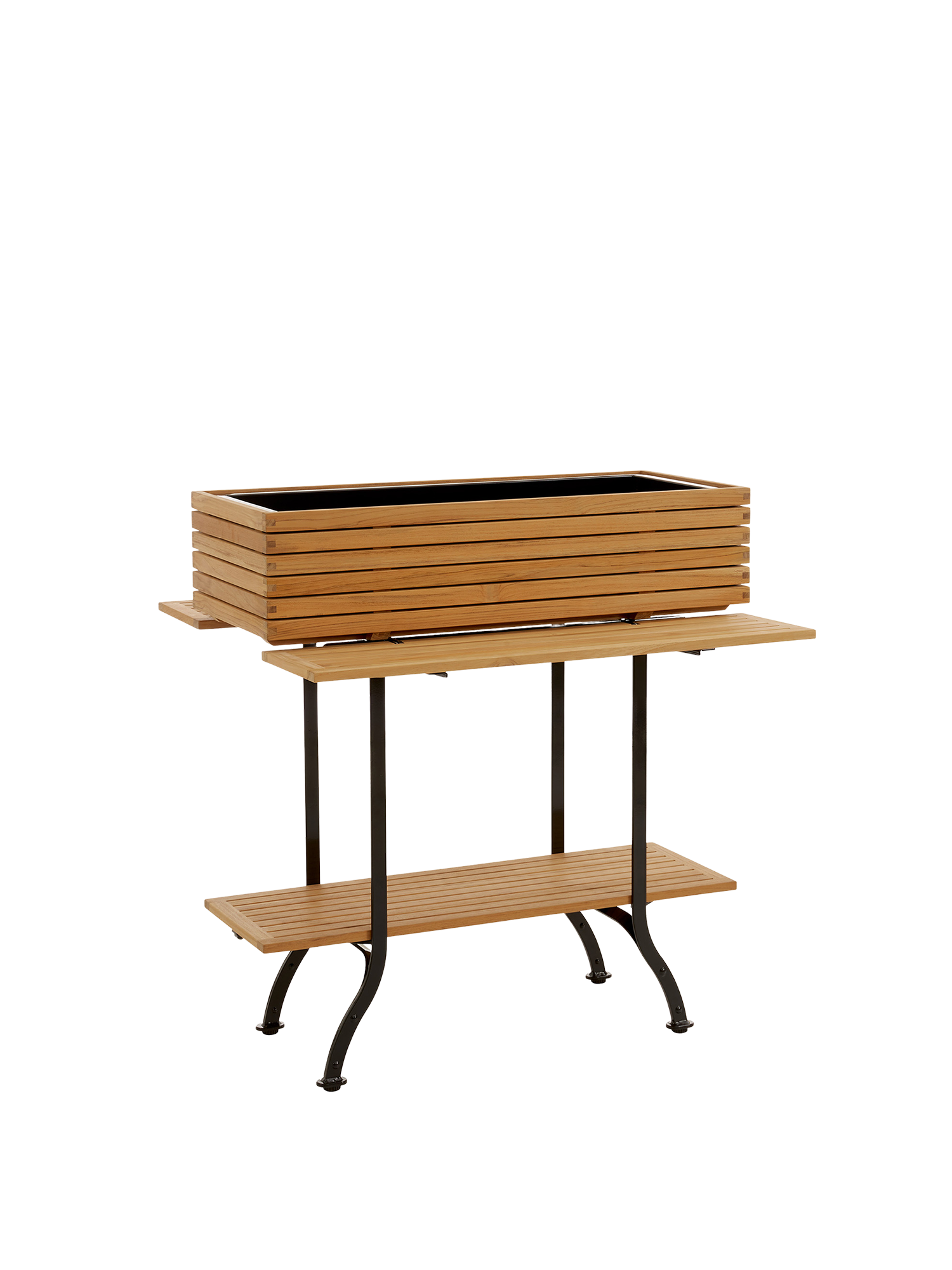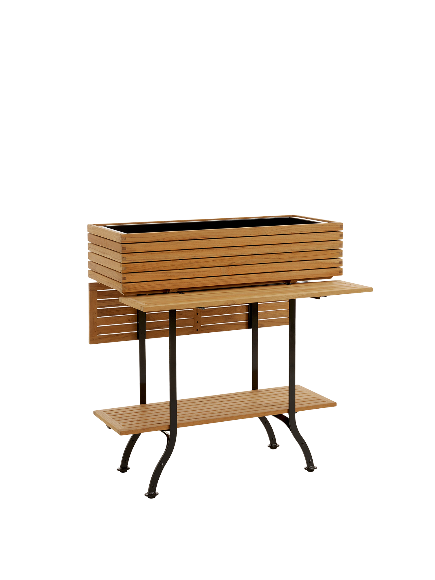 Das Gestell ist aus verzinktem und damit rostgeschütztem Stahl, graphitschwarz pulverbeschichtet, der Einsatz aus schwarz pulverbeschichtetem Aluminium. Seine Verkleidung besteht, genau wie der praktische untere Regalboden und die klappbaren Abstellflächen, aus massiven Teakleisten.