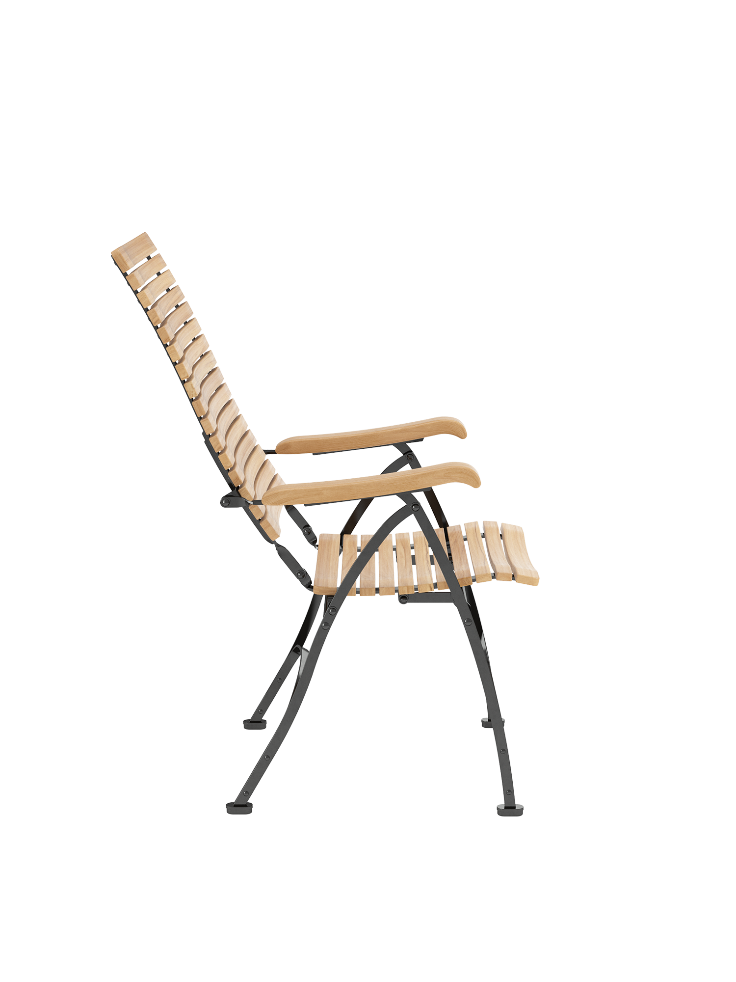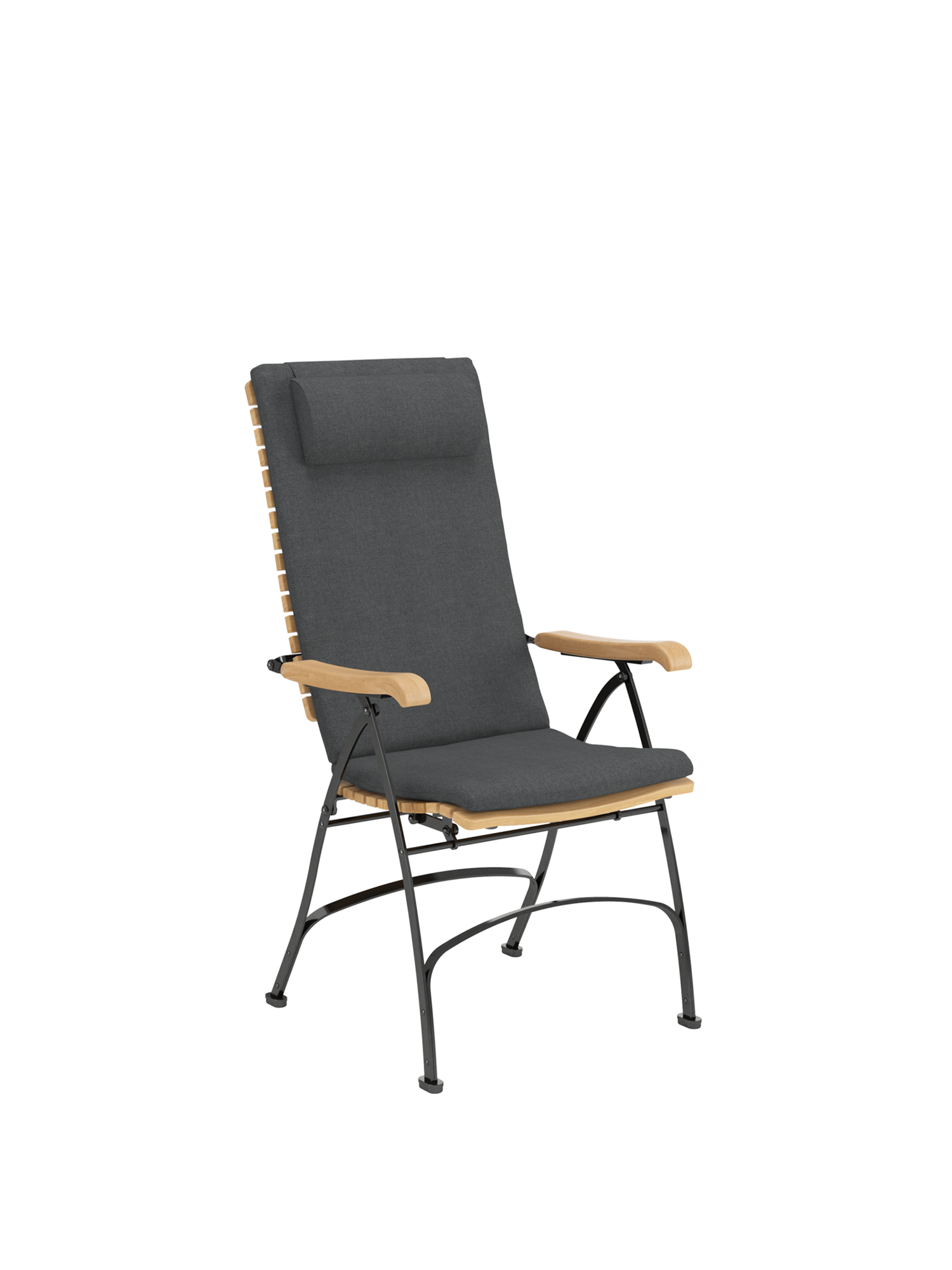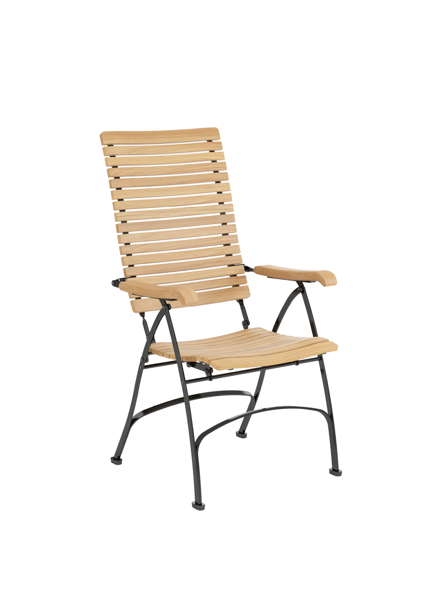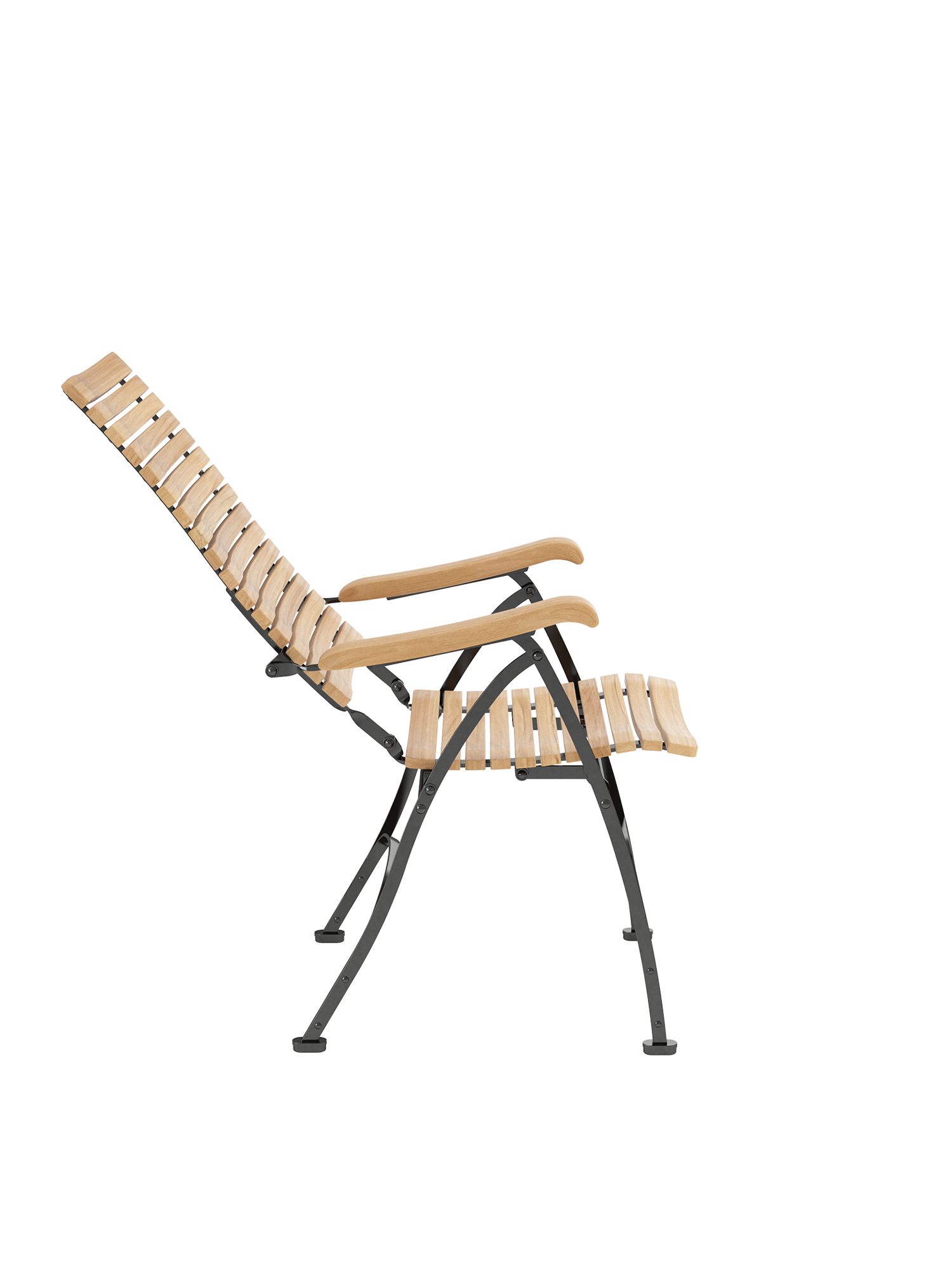 Alle Drehverbindungen aus Edelstahlbolzen sind rostfrei gelagert - für eine dauerhafte Funktion im Freien. Laufrollen aus hochwertigem Polyamid, die unter der Sitzfläche angebracht sind, unterstützen leichtgängiges Klappen und schonen die beschichteten Metallteile. Die grosse Sitzfläche aus Teak ist dreidimensional geformt, so dass sie sich dem Körper anschmiegt. Vorn ist sie zur besseren Schenkelauflage abgerundet. Das Gestell besteht aus verzinktem und damit rostgeschütztem Stahl, graphitschwarz pulverbeschichtet. Fussgleiter aus abriebfestem Kunststoff schützen wertvolle Böden vor Kratzern.