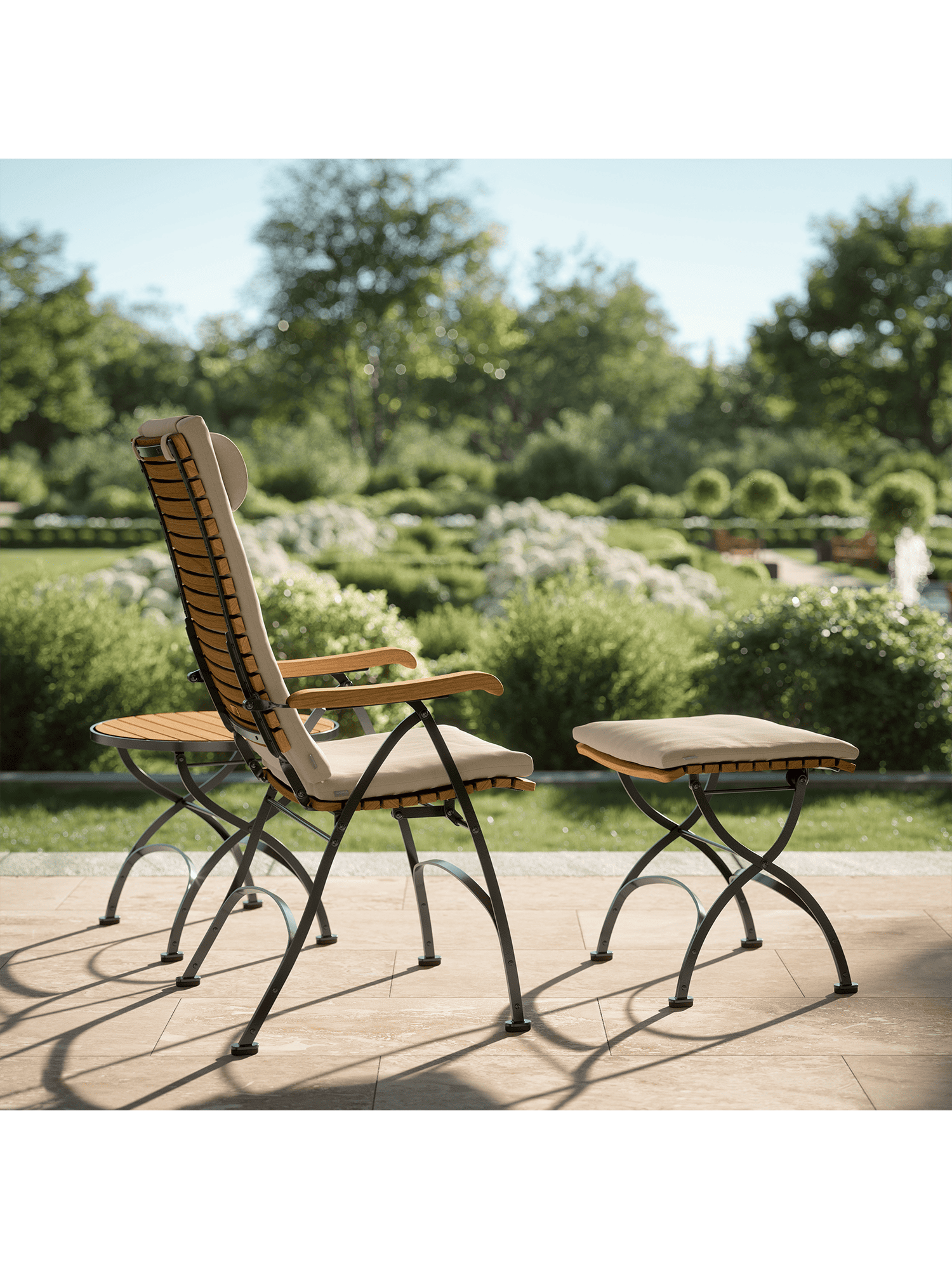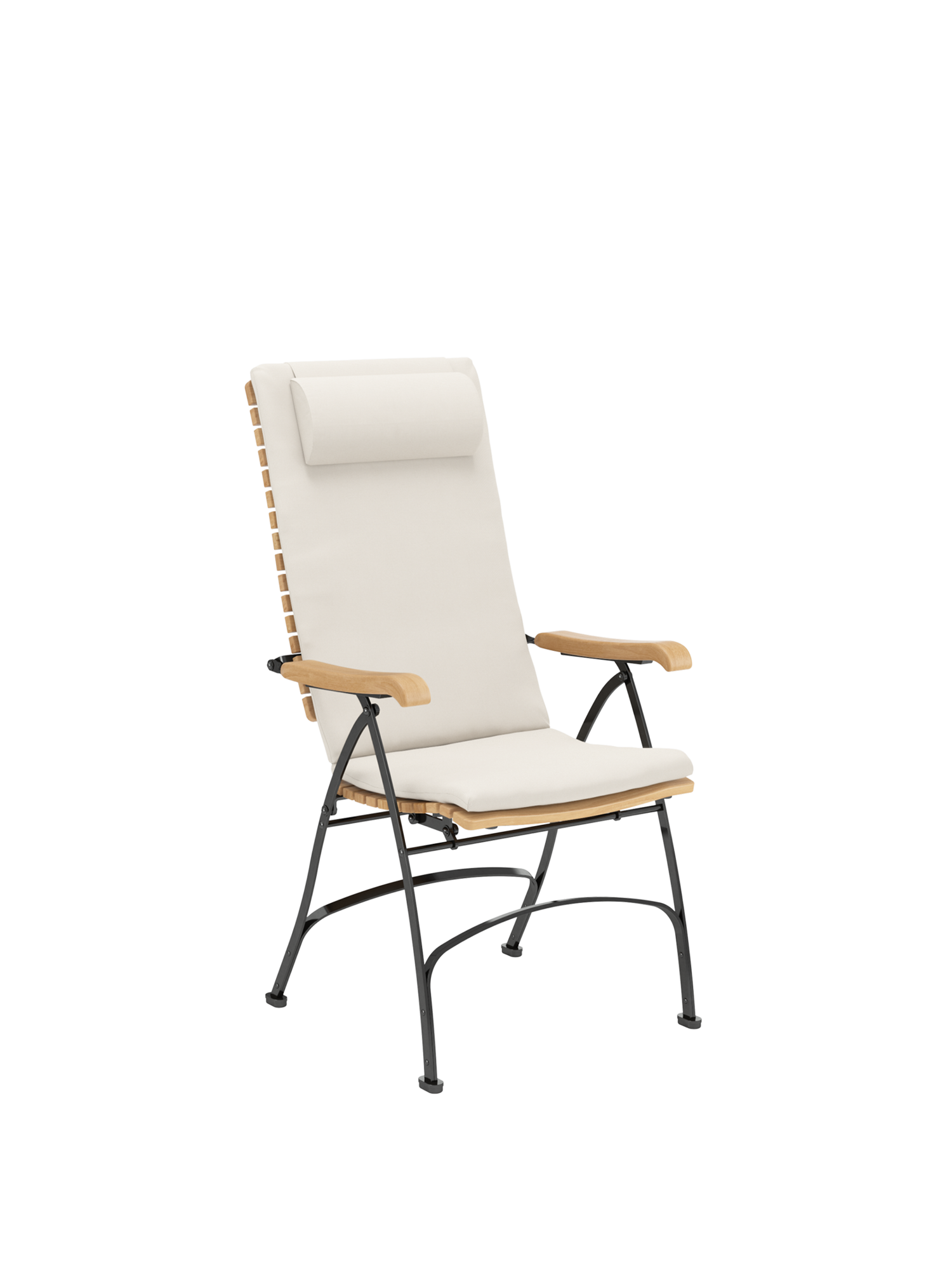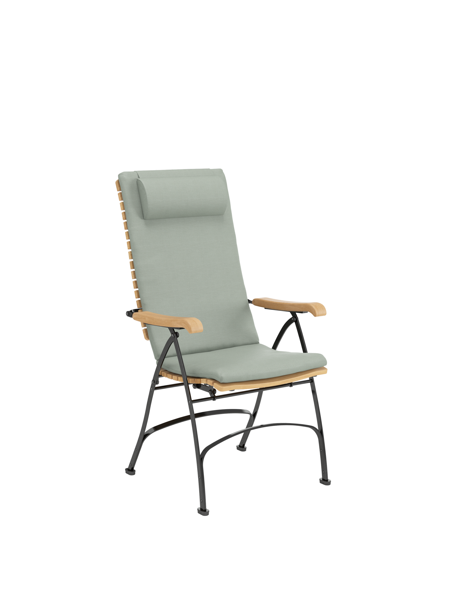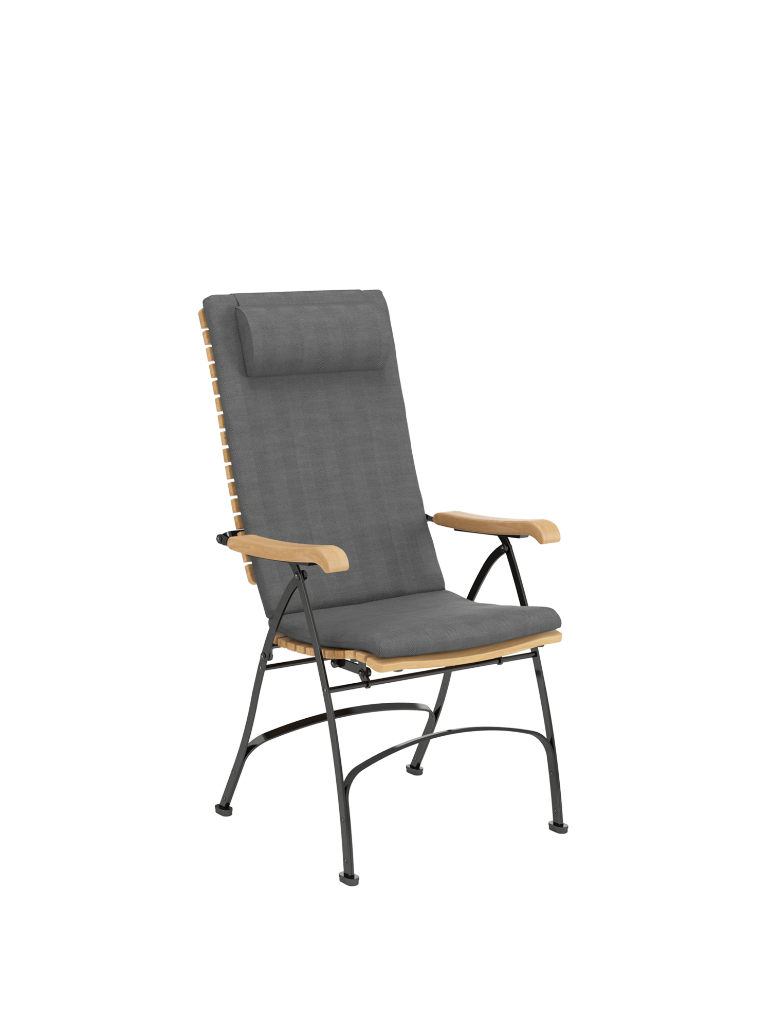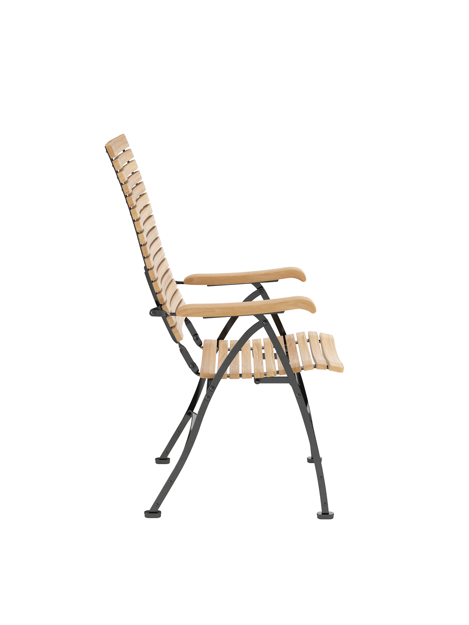 Alle Drehverbindungen aus Edelstahlbolzen sind rostfrei gelagert - für eine dauerhafte Funktion im Freien. Laufrollen aus hochwertigem Polyamid, die unter der Sitzfläche angebracht sind, unterstützen leichtgängiges Klappen und schonen die beschichteten Metallteile. Die grosse Sitzfläche aus Teak ist dreidimensional geformt, so dass sie sich dem Körper anschmiegt. Vorn ist sie zur besseren Schenkelauflage abgerundet. Das Gestell besteht aus verzinktem und damit rostgeschütztem Stahl, graphitschwarz pulverbeschichtet. Fussgleiter aus abriebfestem Kunststoff schützen wertvolle Böden vor Kratzern.