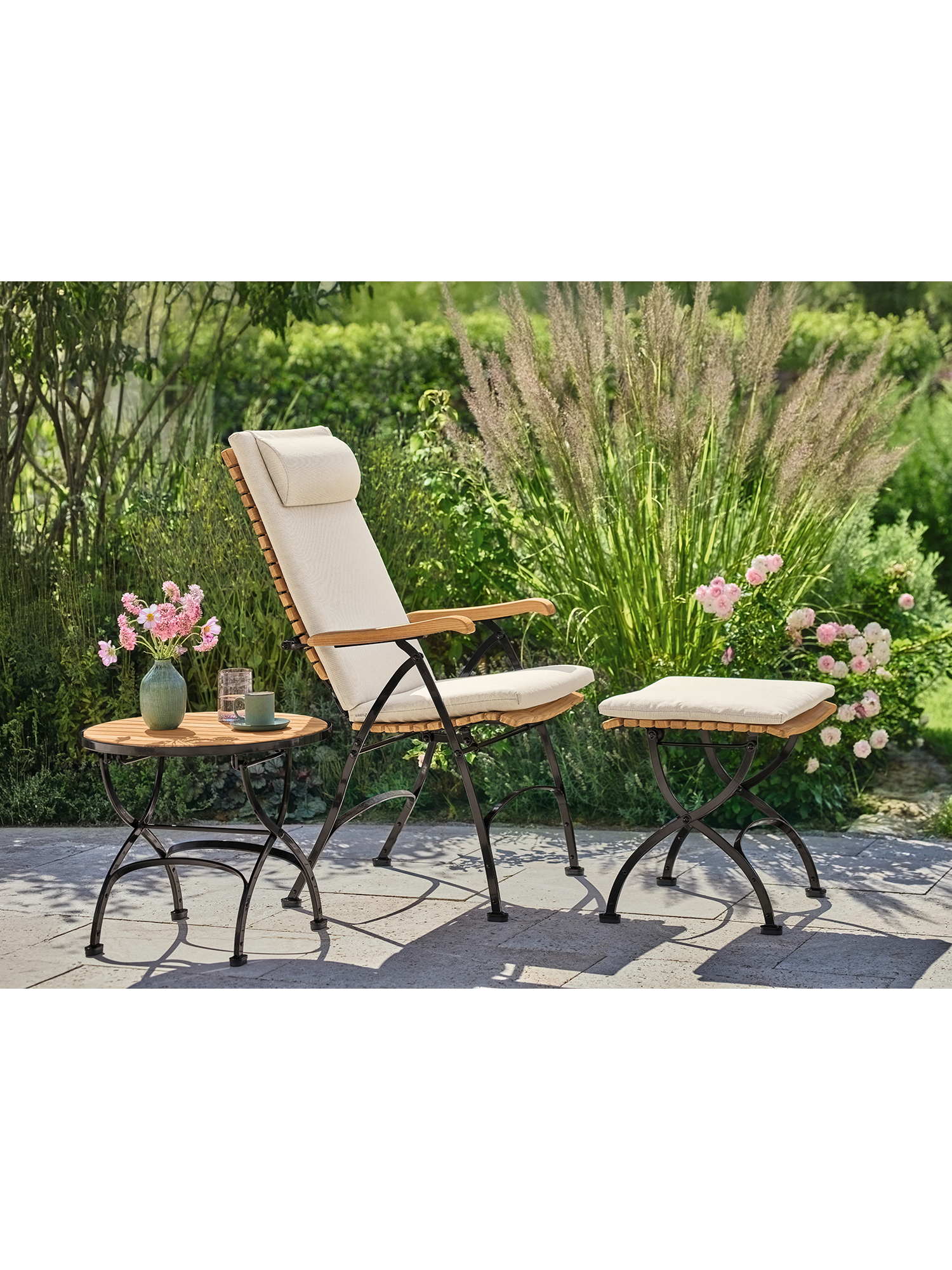 - ergonomisch geformte Sitz- und Rückenflächen aus Plantagenteak