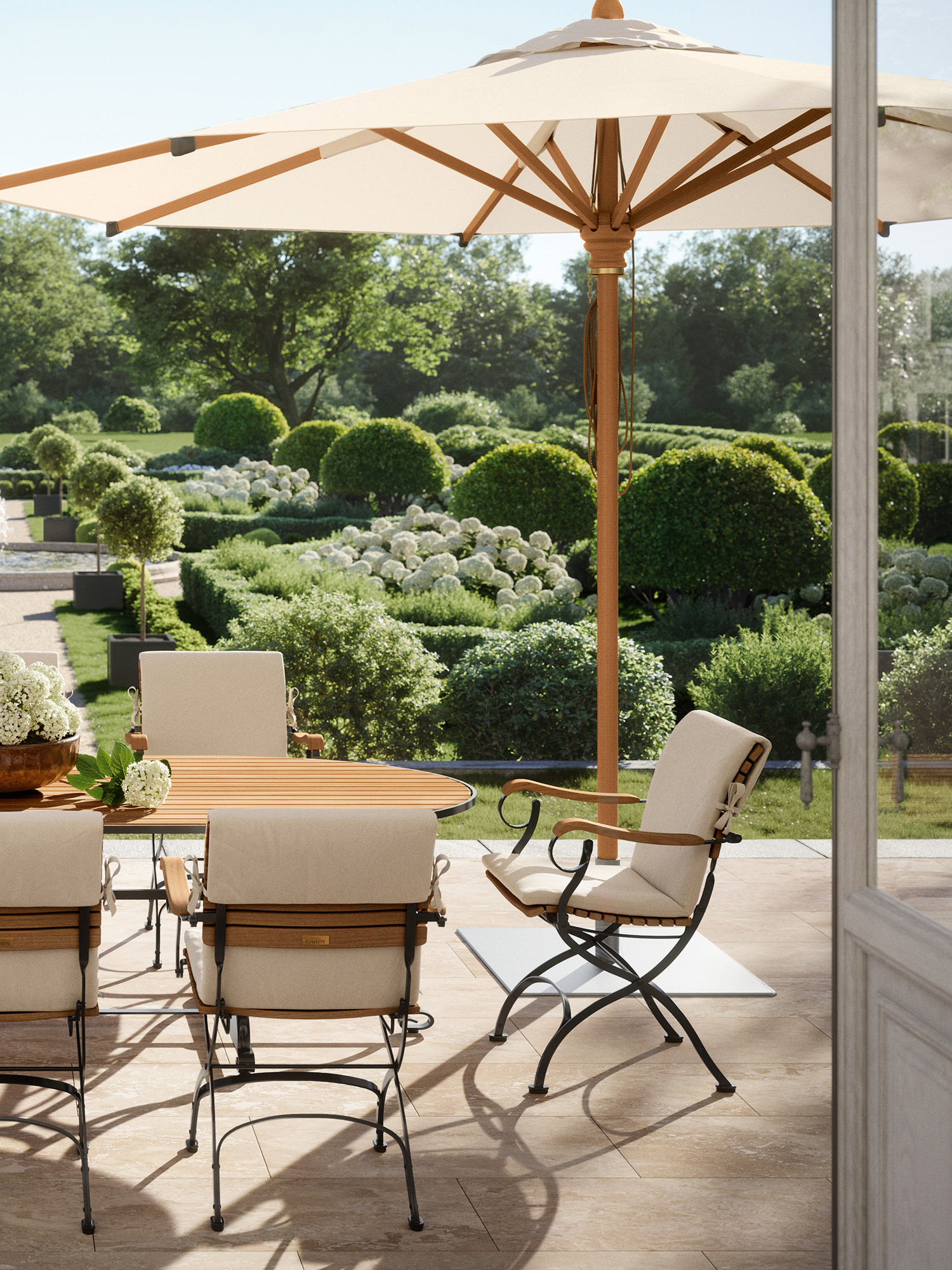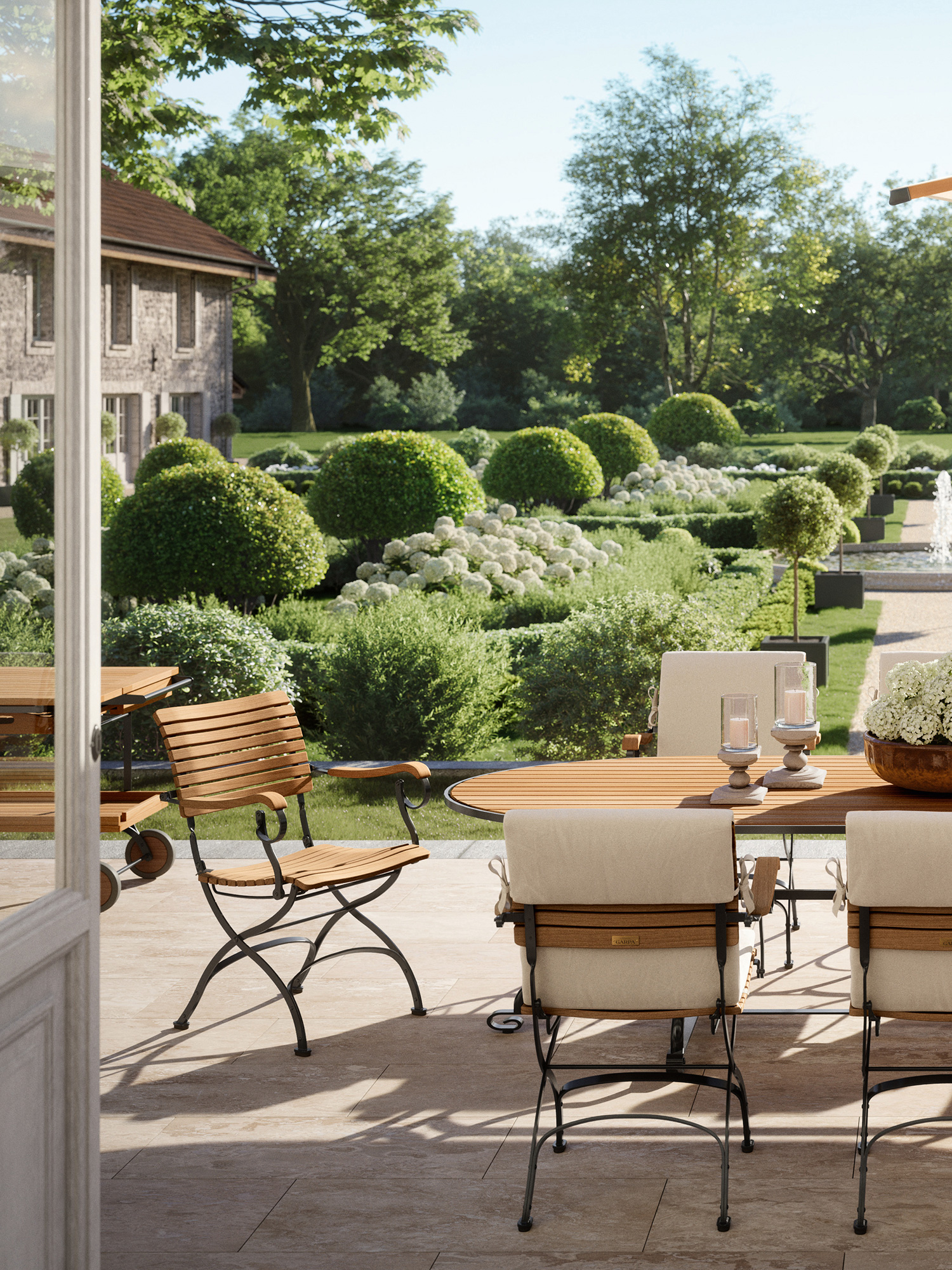 Präzise bearbeitete Leisten aus massivem Plantagenteak prägen die edle Anmutung des klappbaren Gartentisches der Fontenay Kollektion, der sich platzsparend verstauen lässt.