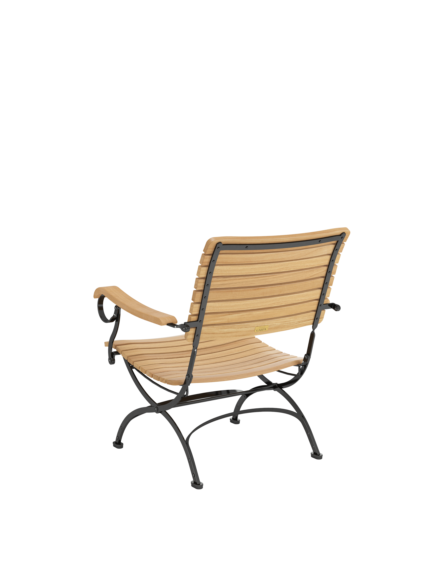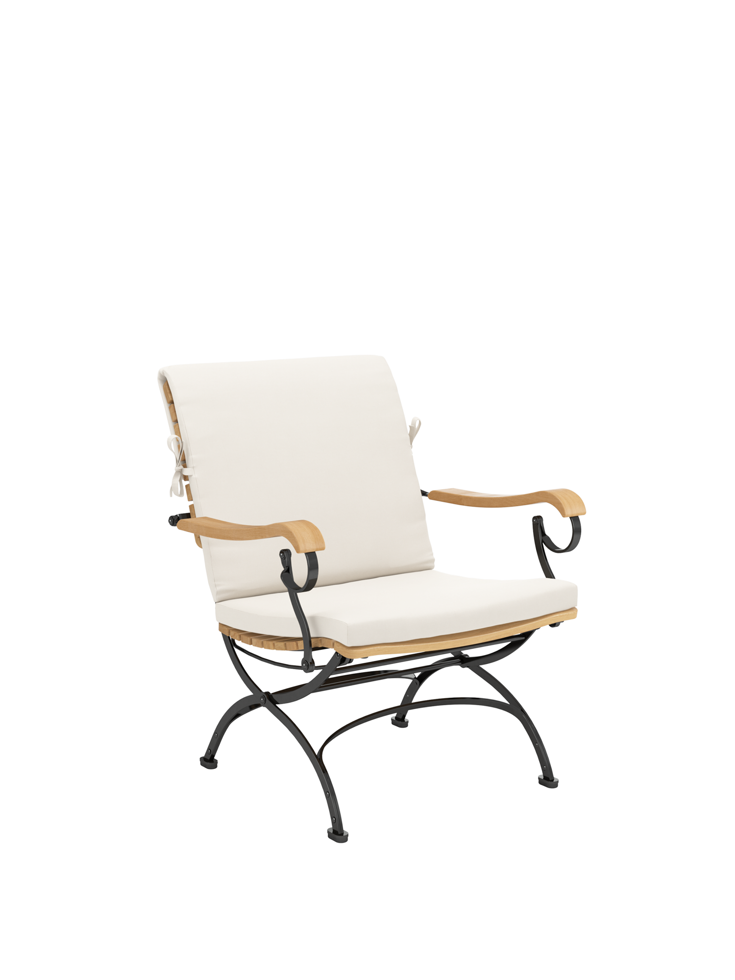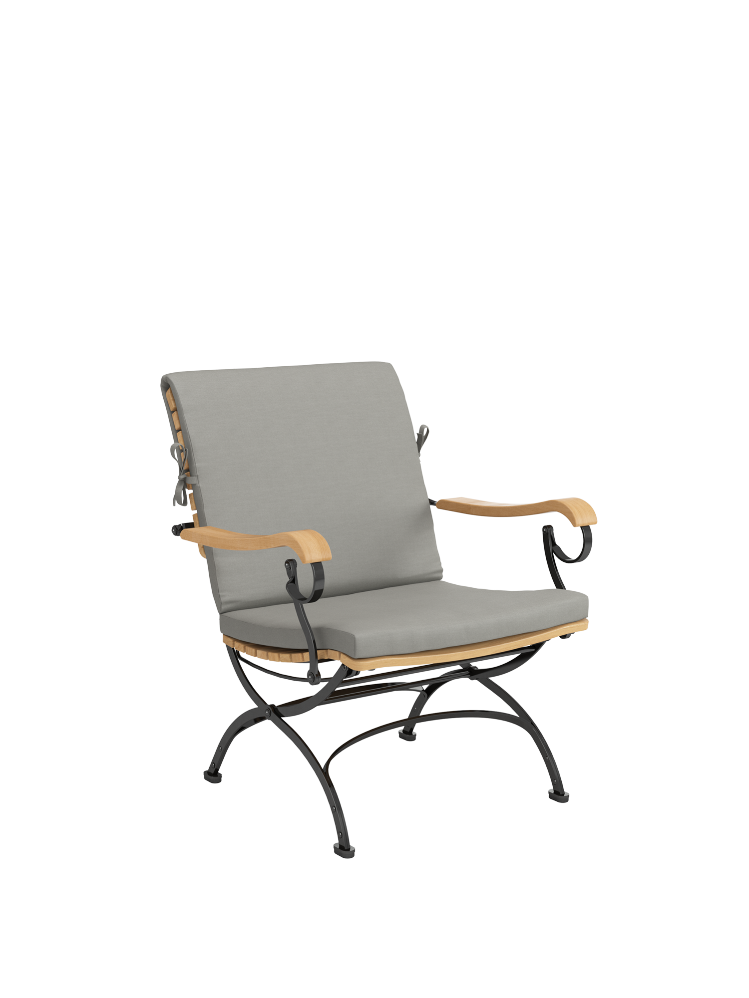 Avec un espace nettement plus généreux entre ses accoudoirs, ce classique repliable en lattes de teck et acier thermolaqué révèle des qualités exceptionnelles de meuble de salon. Véritable caresse pour les mains, les accoudoirs en teck de culture délestent le corps. La grande surface d'assise de ce fauteuil de jardin en teck possède une structure tridimensionnelle, de sorte qu'elle épouse agréablement les formes du corps. Le bord de l’assise est délicatement arrondi pour mieux soutenir les jambes. Des garnitures de différentes teintes augmentent encore le confort des meubles tout en leur apportant une touche de raffinement.