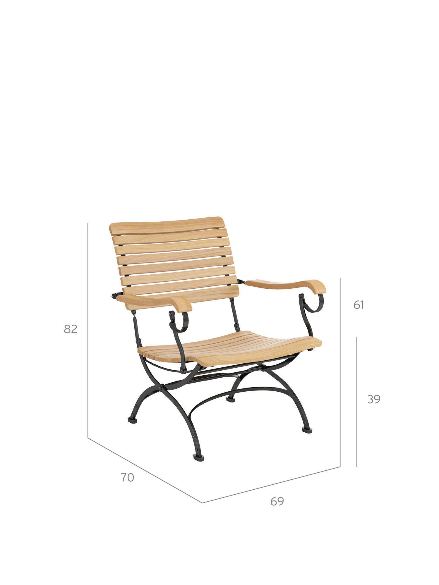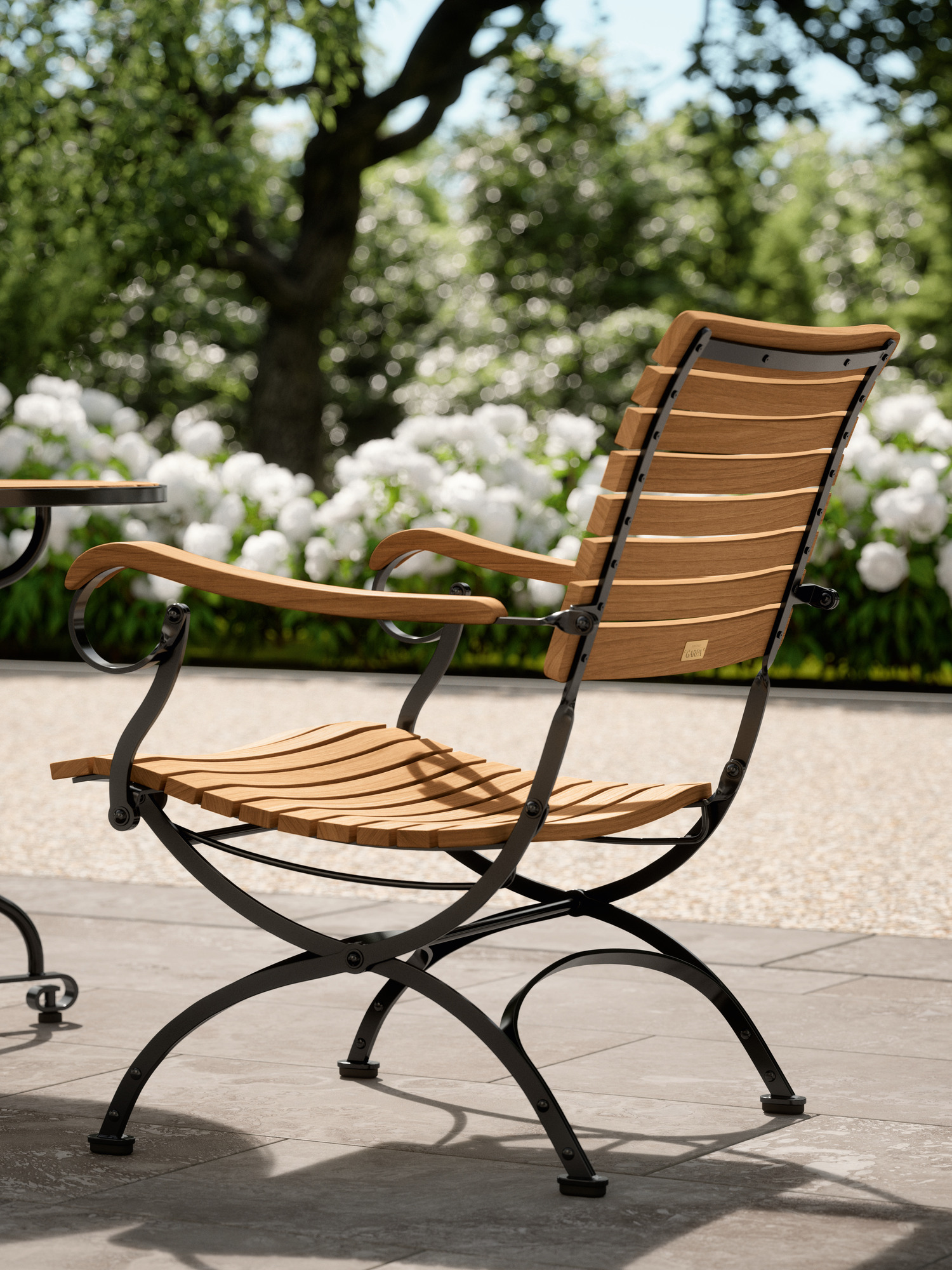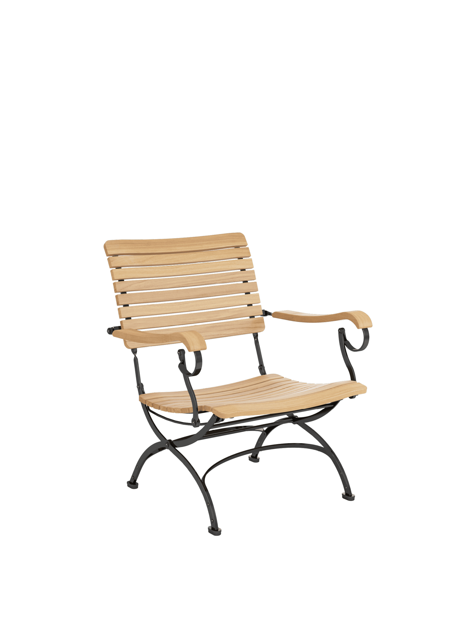 Avec un espace nettement plus généreux entre ses accoudoirs, ce classique repliable en lattes de teck et acier thermolaqué révèle des qualités exceptionnelles de meuble de salon. Véritable caresse pour les mains, les accoudoirs en teck de culture délestent le corps. La grande surface d'assise de ce fauteuil de jardin en teck possède une structure tridimensionnelle, de sorte qu'elle épouse agréablement les formes du corps. Le bord de l’assise est délicatement arrondi pour mieux soutenir les jambes. Des garnitures de différentes teintes augmentent encore le confort des meubles tout en leur apportant une touche de raffinement.