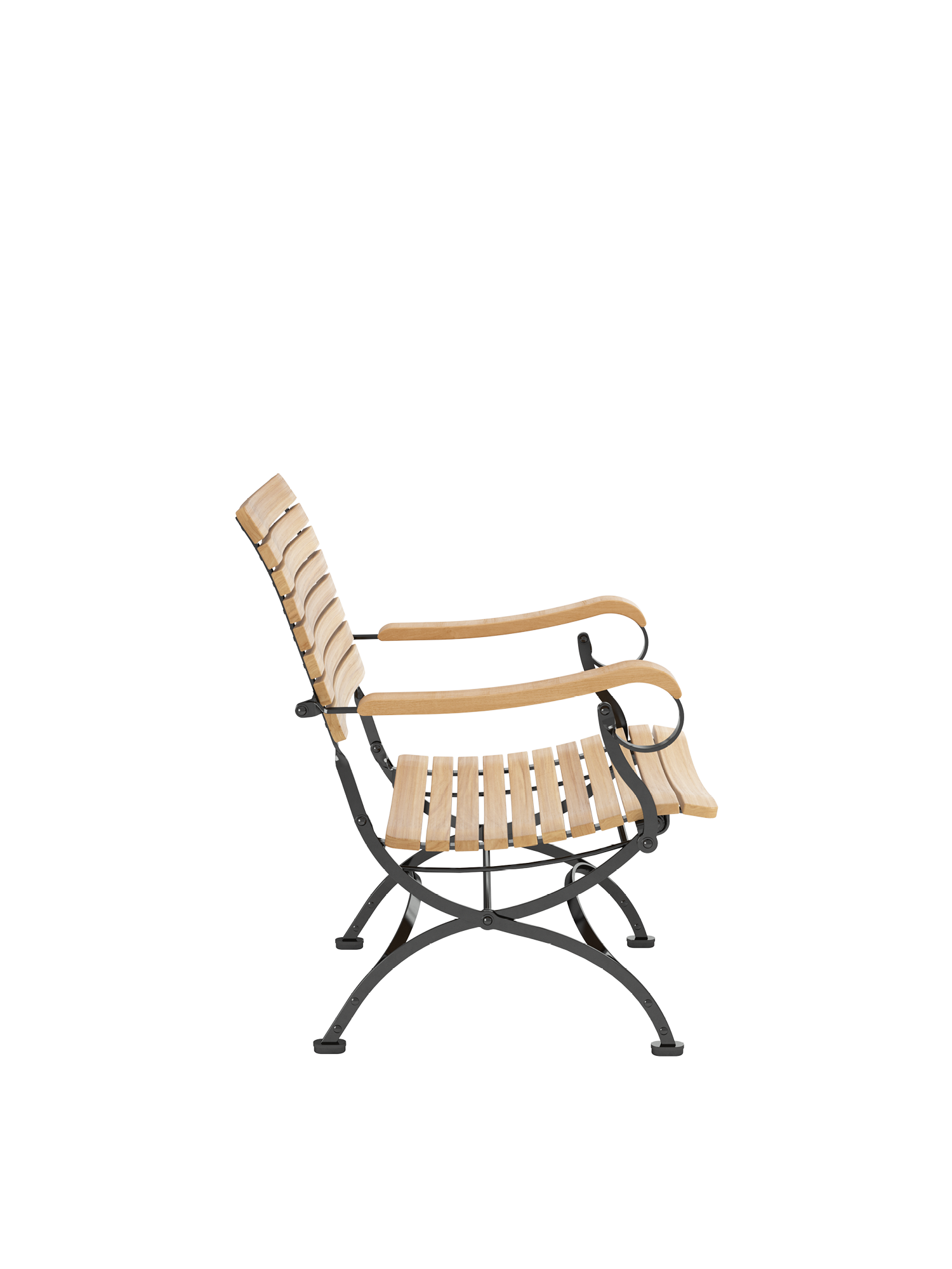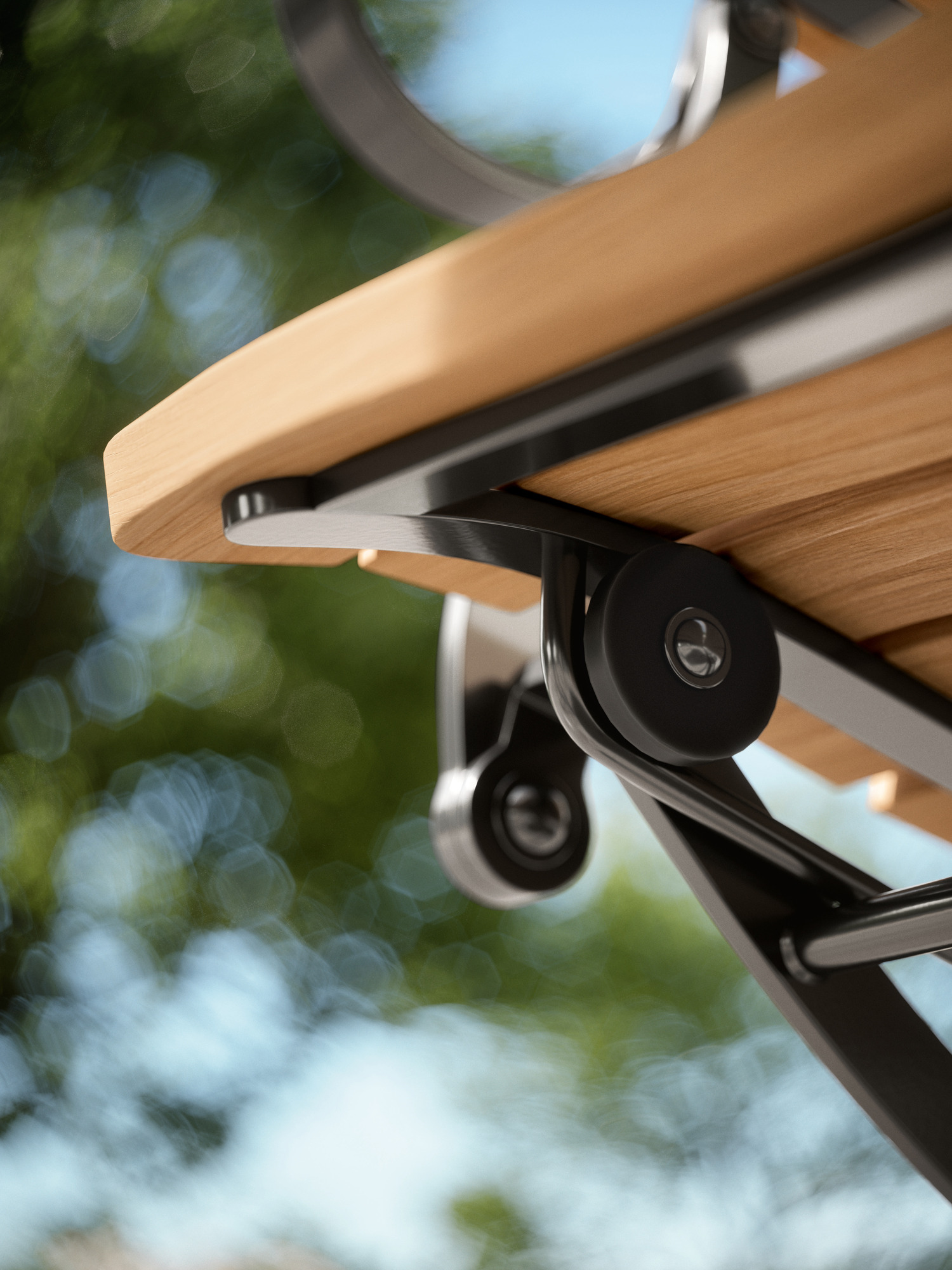 Pour assurer une fonctionnalité durable en plein air, toutes les articulations anticorrosion sont dotées de boulons en acier inoxydable. Les roulettes en polyamide de haute qualité montées sous l'assise favorisent un pliage en souplesse et ménagent les parties métalliques revêtues. Le châssis est en acier galvanisé thermolaqué noir graphite et donc protégé contre la rouille. Replié, le fauteuil ne mesure que 23 cm de large. Des patins résistants à l'abrasion protègent les sols fragiles contre les rayures.