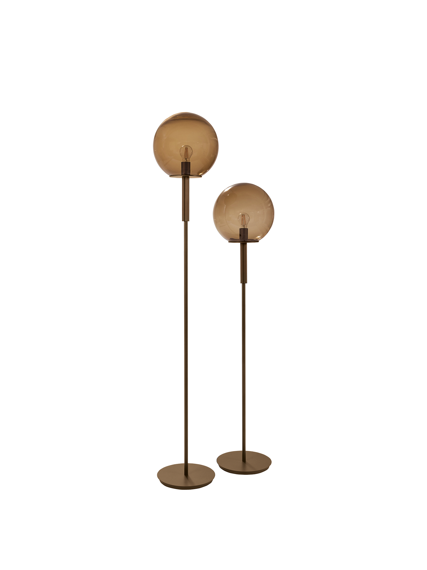 Les matériaux nobles des luminaires Lumio font référence aux formes classiques et les interprètent de manière tout à fait contemporaine. L'élément rainuré sous le corps en verre s'inspire d'une colonne corinthienne, le métal de couleur bronze dans lequel il est fabriqué lui confère une modernité presque sobre. La douille et l'ampoule apparaissent délibérément dans la coupole en verre, dont le brun fumé éclaire l'espace environnant de manière évocatrice.