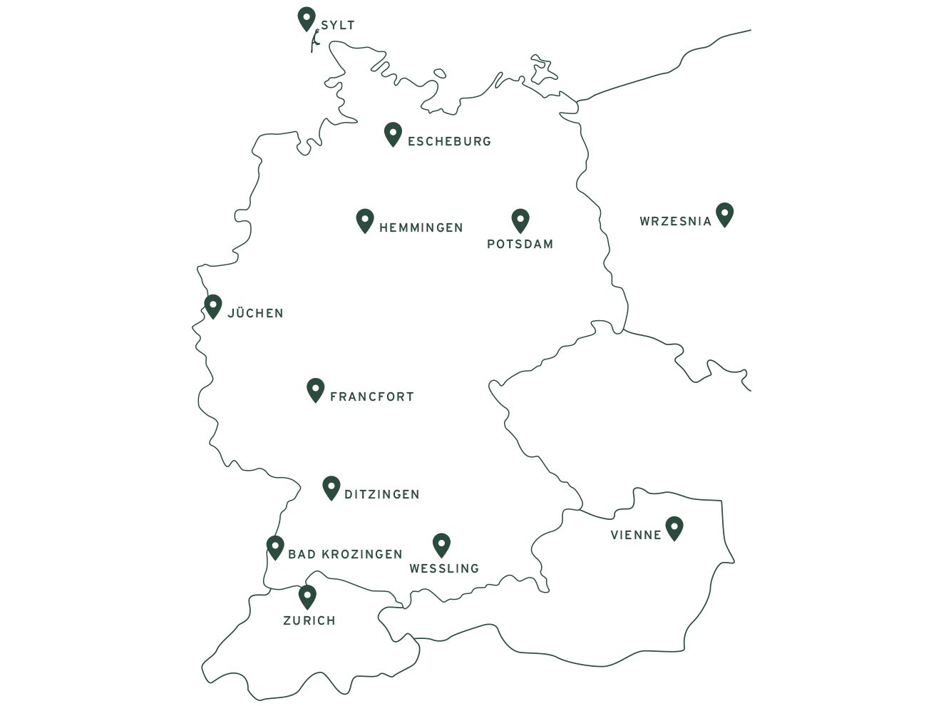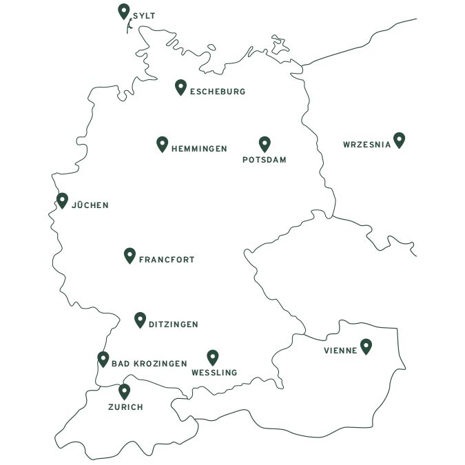 Vous êtes en voyage ou profitez du week-end pour une escapade ? La carte ci-contre indique les implantations régionales de nos showrooms en Allemagne, en Autriche, en Suisse et en Pologne.