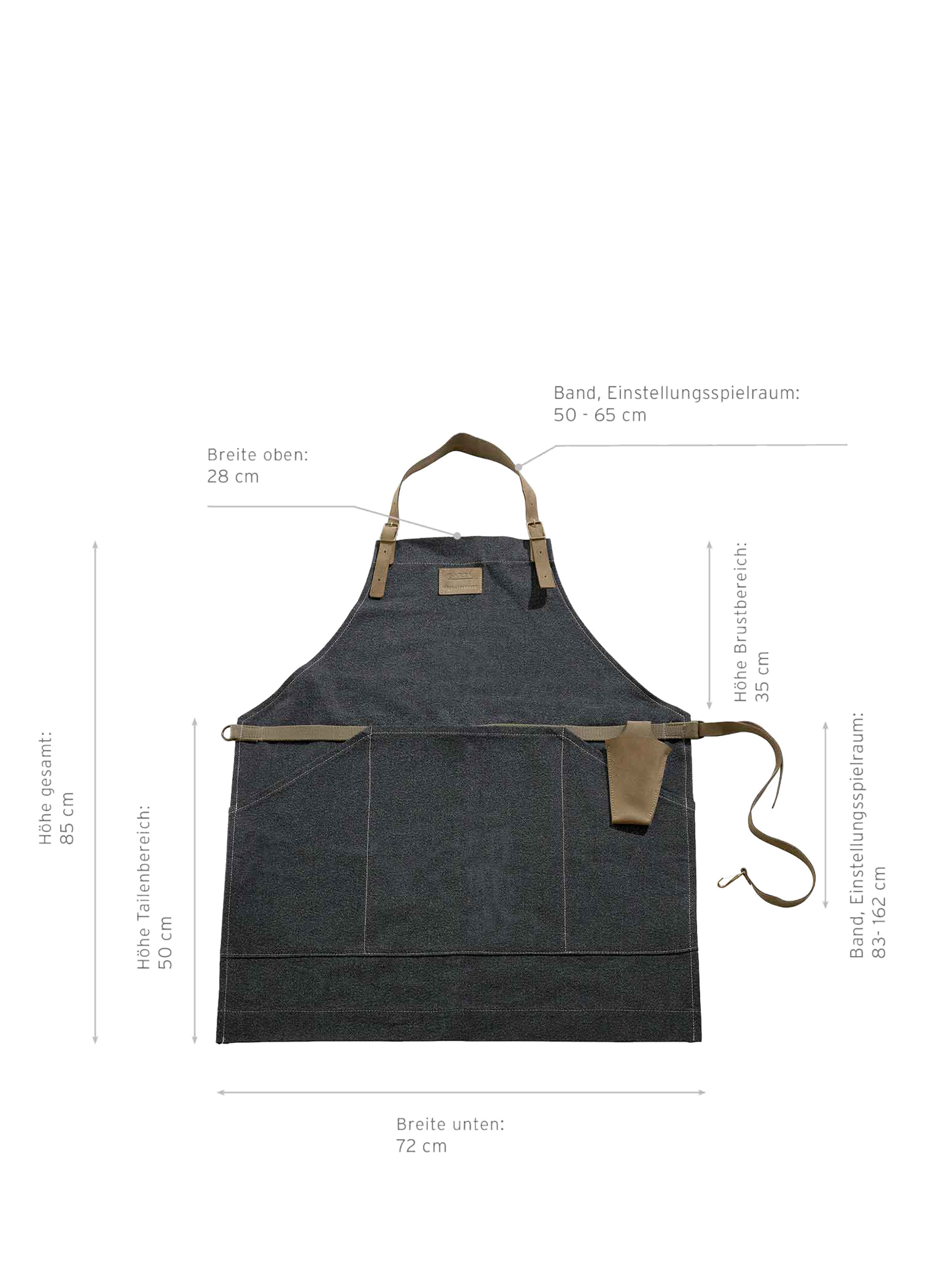One size fit’s all – die Gartenschürze sollte also in jedem Fall passen. Falls Sie sich für die einzelnen Längen interessieren – z. B. des Gürtels oder Halsgurts – haben wir diese im obigen Bild zu den Massangaben für Sie zusammengefasst.