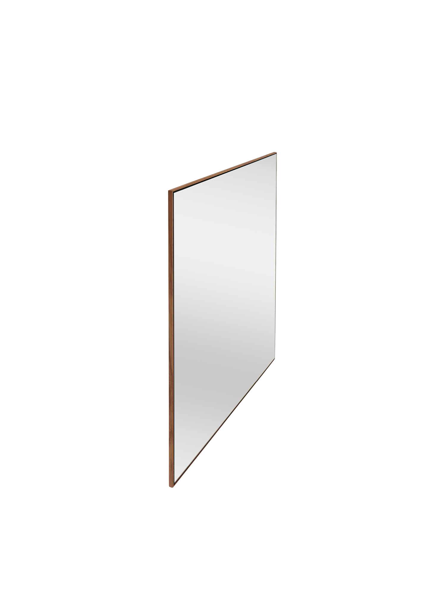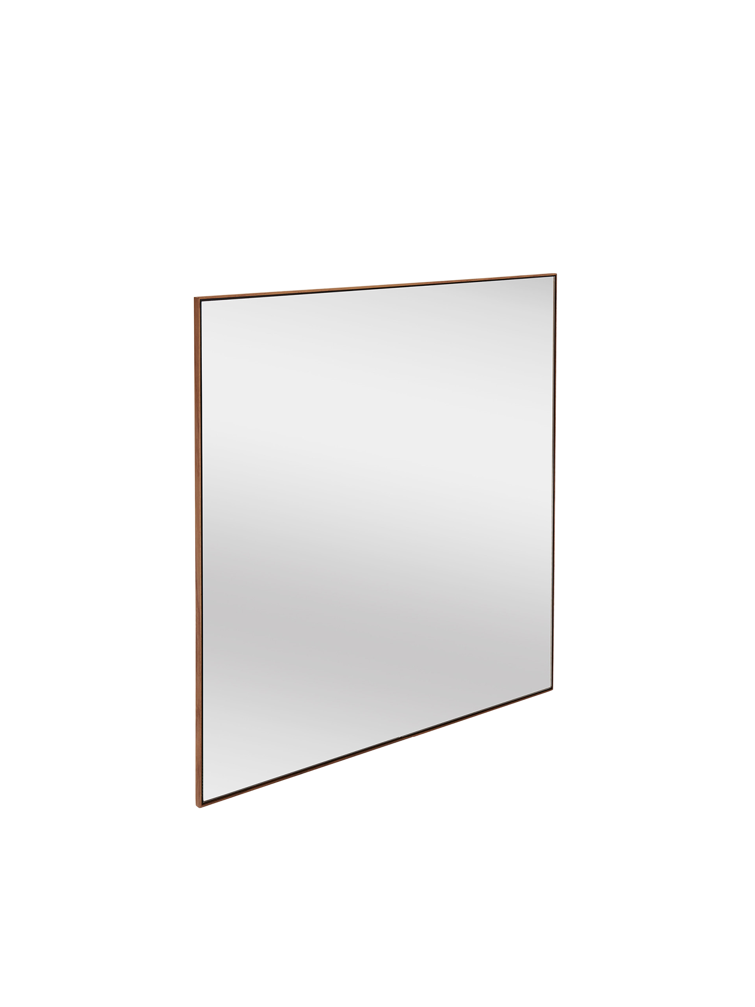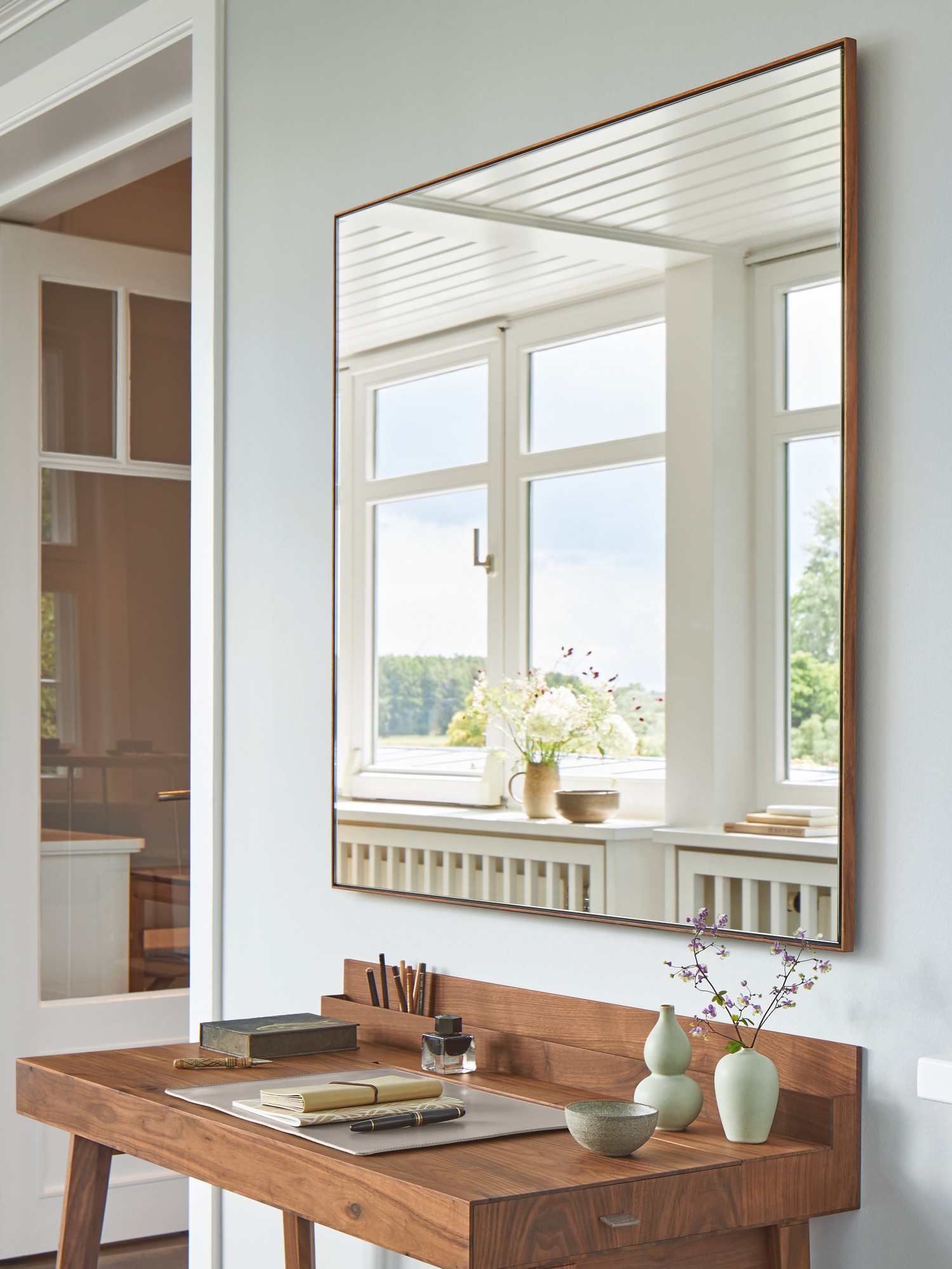 Ein Blickfang in wohnlichen Innenräumen: Der grosse quadratische Spiegel der Garvo Serie hat einen schmalen Rahmen aus amerikanischem Nussbaum.