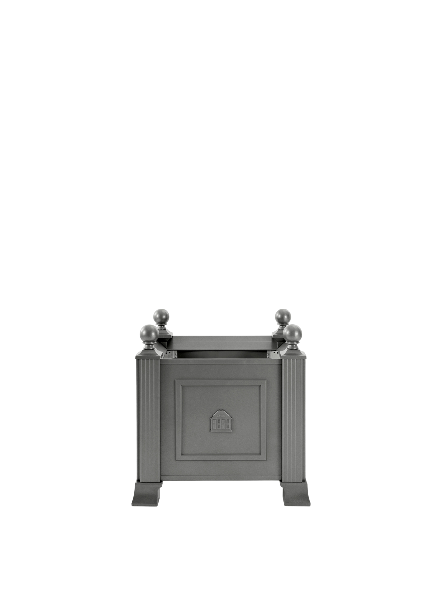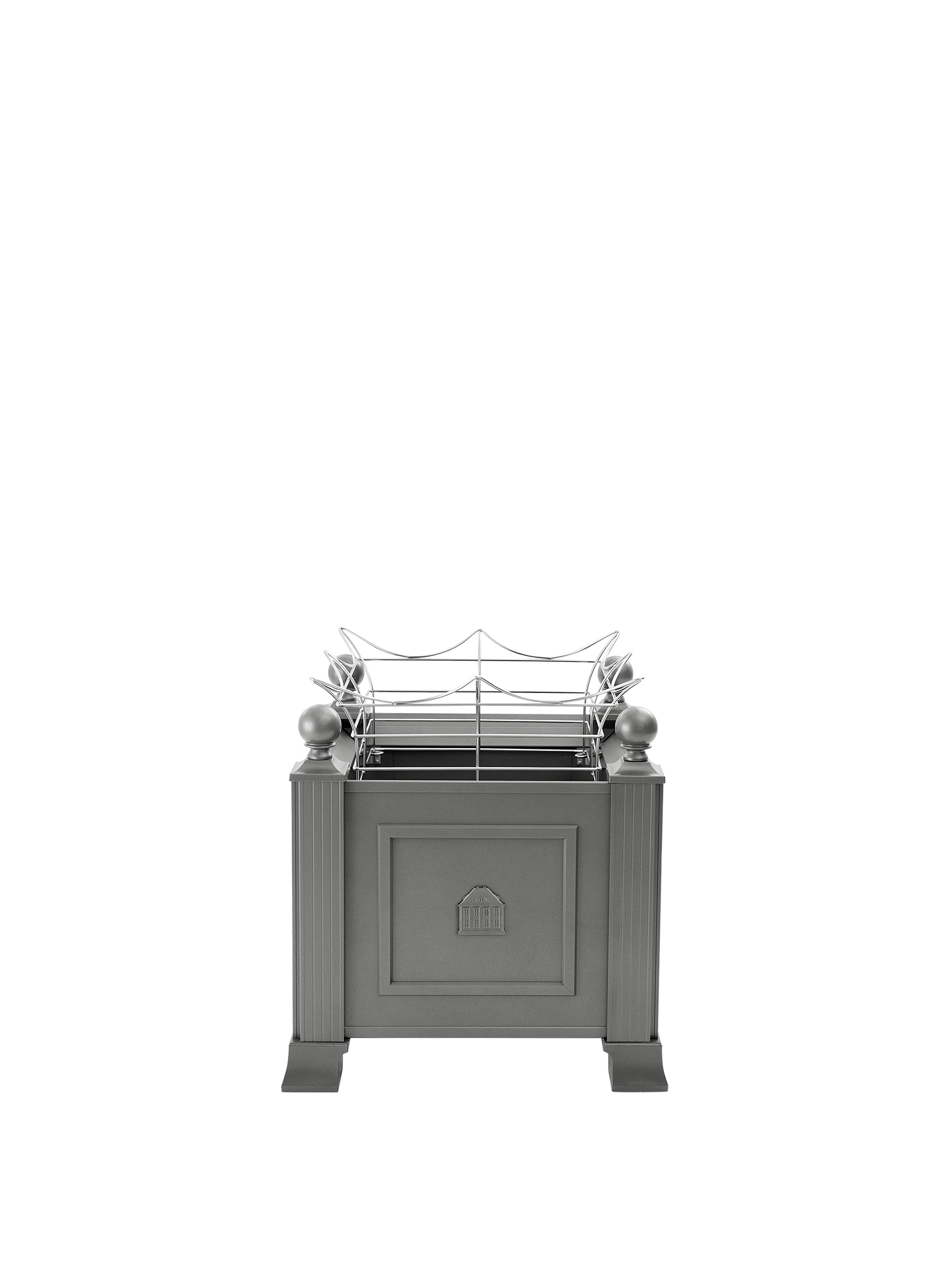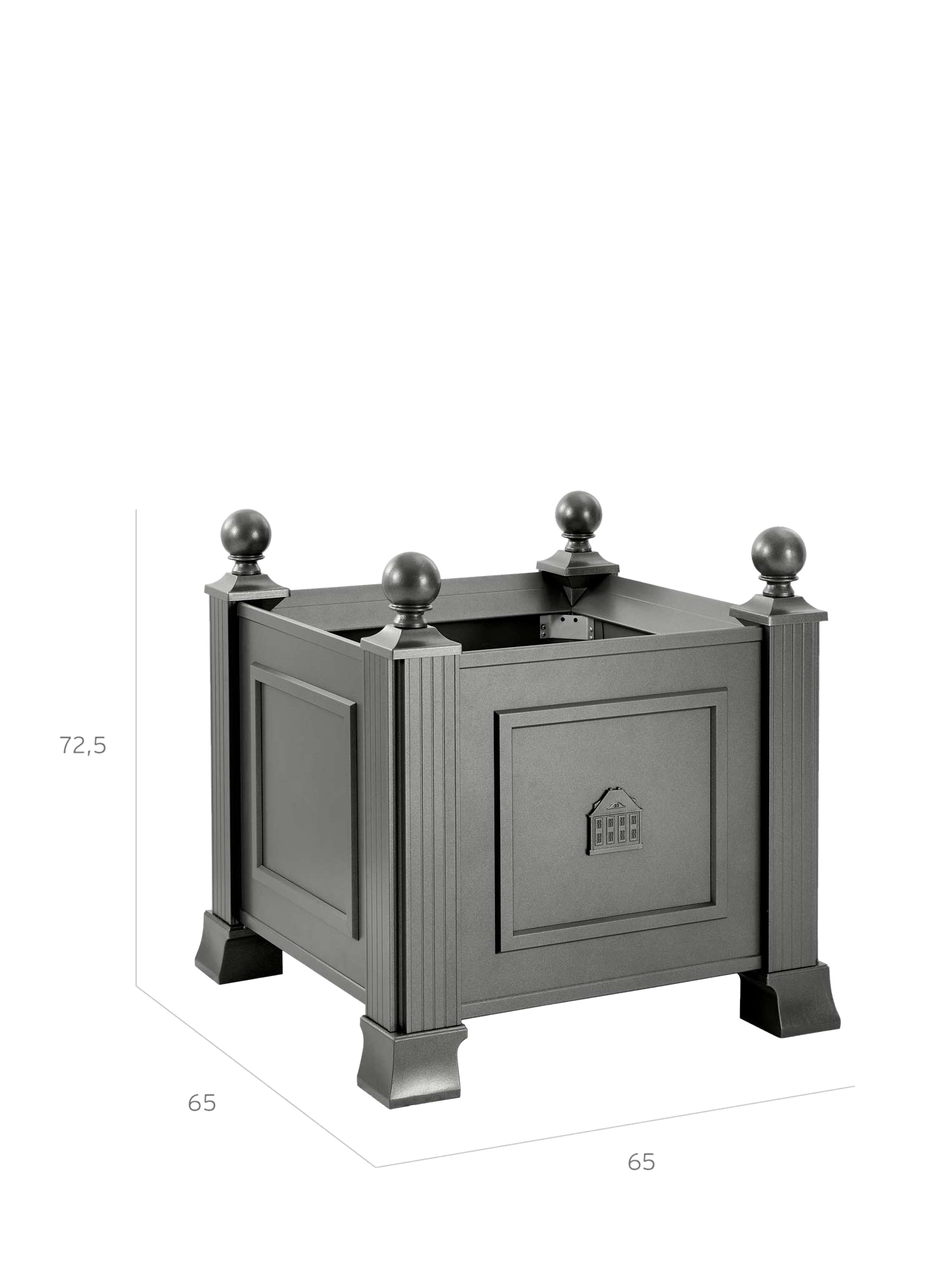 Von Kugeln gekrönt und von starken Füssen getragen demonstrieren die säulenartigen Eckelemente des Grenoble Pflanzkübels Standfestigkeit. Elegant und robust wirkt der Blumenkübel dank des grauen pulverbeschichteten Aluminiums. Ein filigranes Hochrelief auf der Vorderseite zeigt das Garpa Stammhaus.