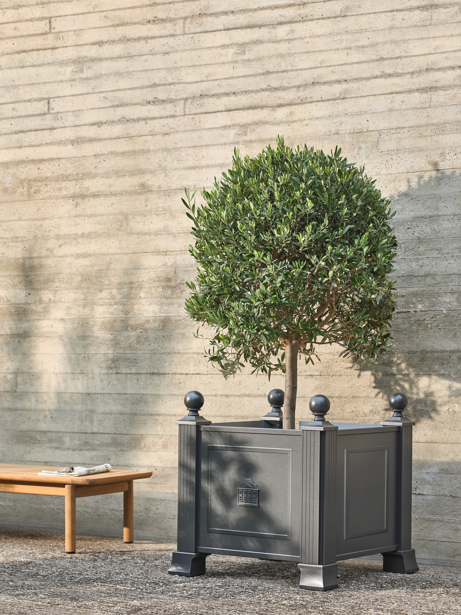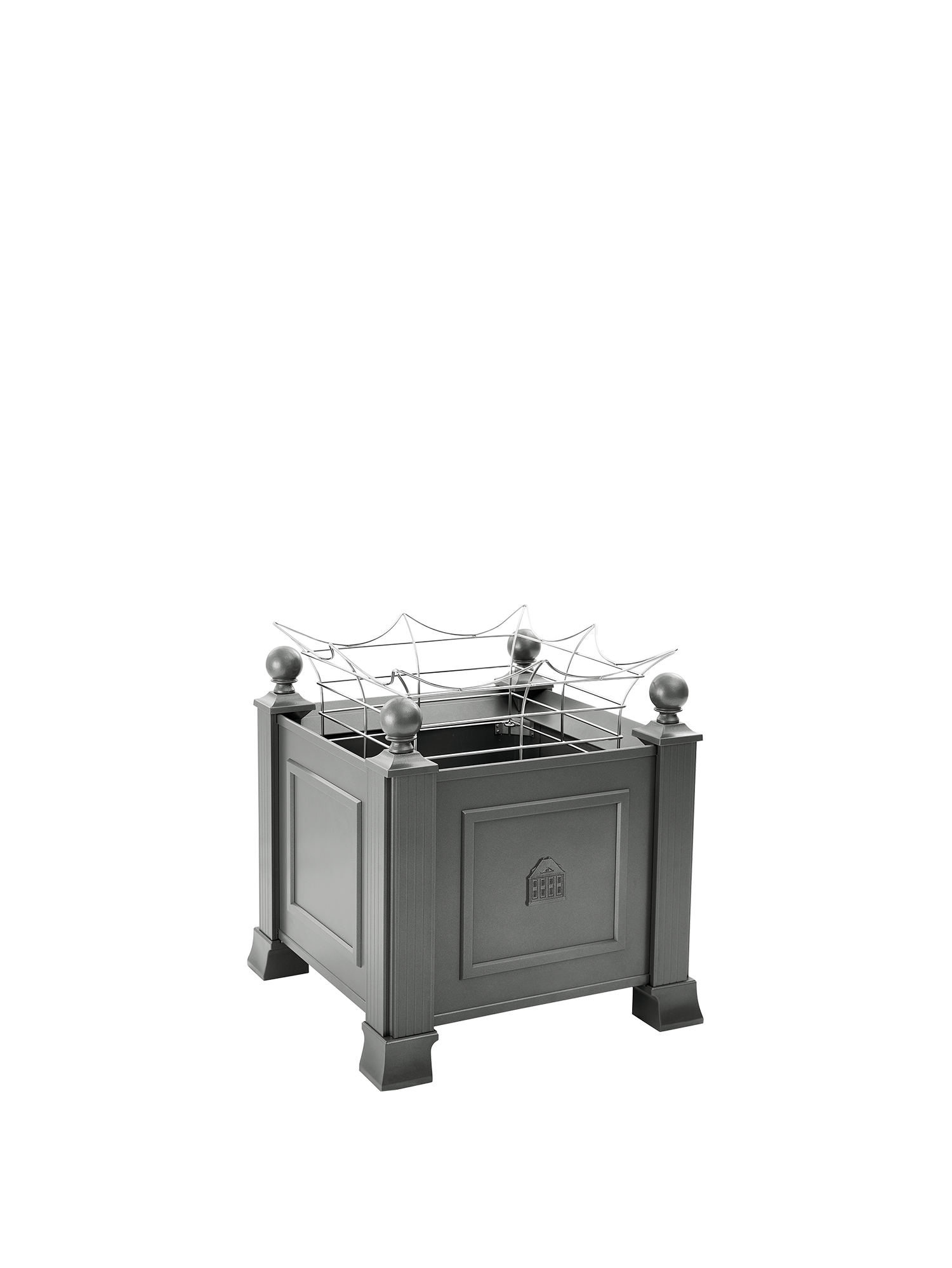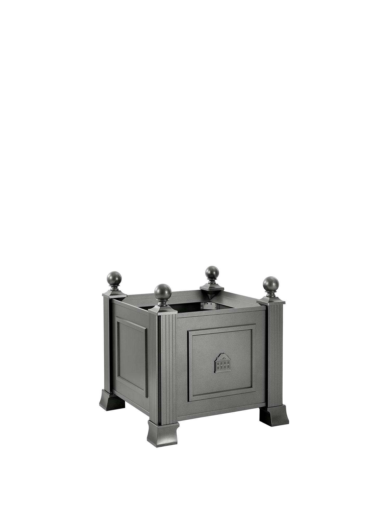 Von Kugeln gekrönt und von starken Füssen getragen demonstrieren die säulenartigen Eckelemente des Grenoble Pflanzkübels Standfestigkeit. Elegant und robust wirkt der Blumenkübel dank des grauen pulverbeschichteten Aluminiums. Ein filigranes Hochrelief auf der Vorderseite zeigt das Garpa Stammhaus.