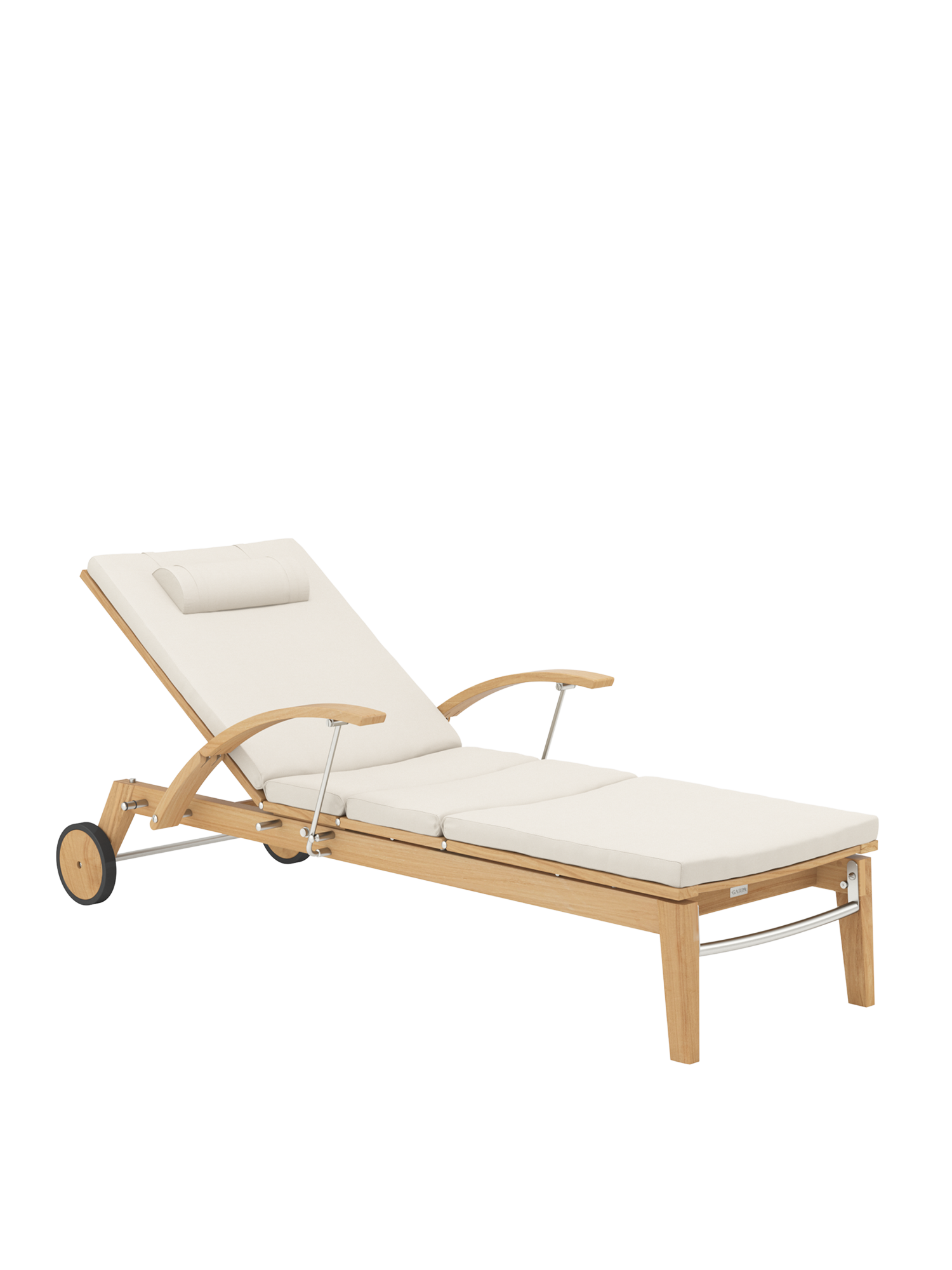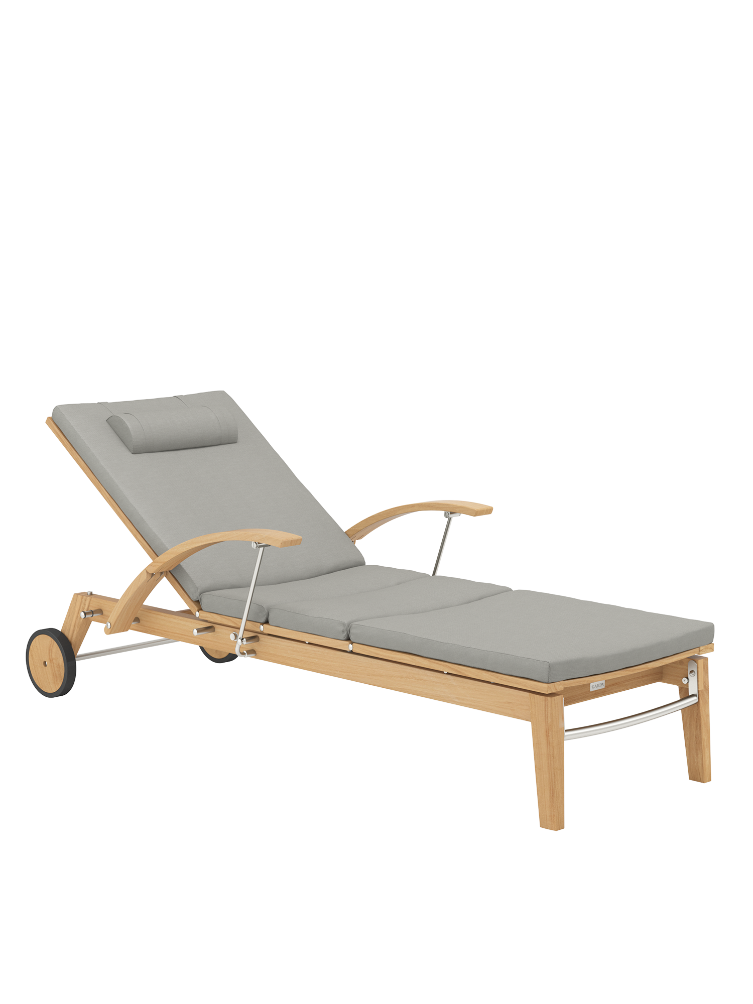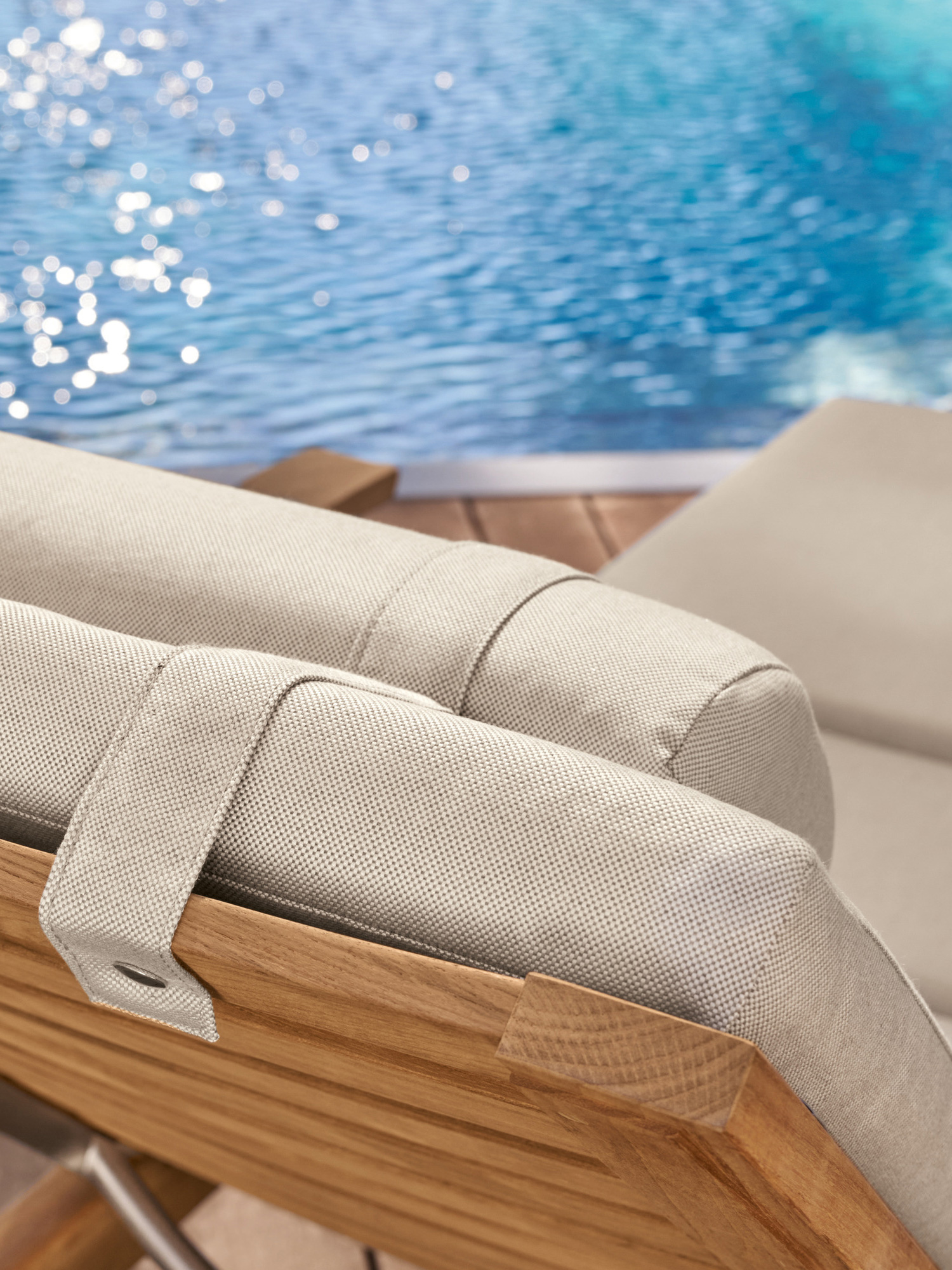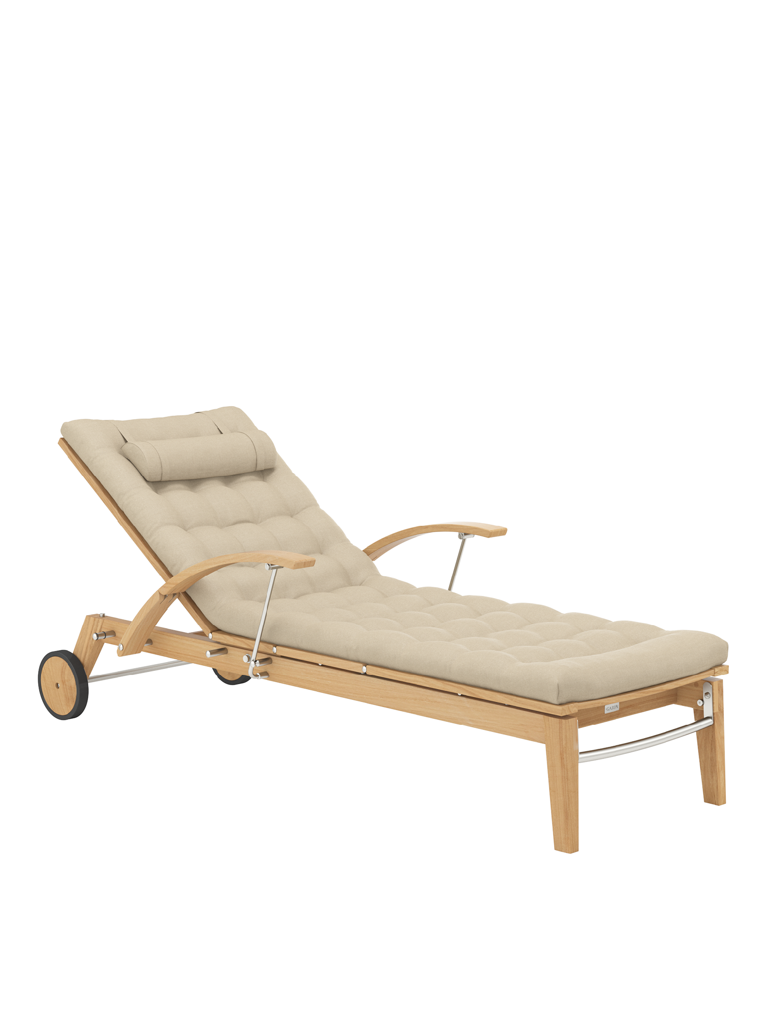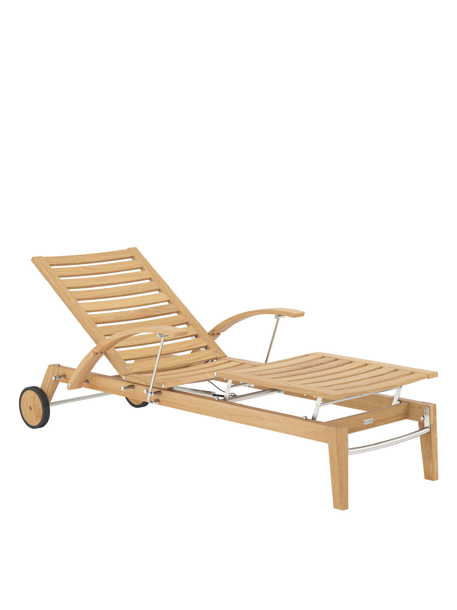Hamptons vereint schlichte Eleganz mit einem Höchstmass an Komfort und technischer Raffinesse. Die Rückenlehne der Liege aus Teak lässt sich dank einer Gasdruckfeder einfach per Knopfdruck bedienen. Dezent unter dem Sitz verborgen übernimmt sie die stufenlose Einstellung der gewünschten Liegeposition. Zum bequemen Aus- und Einstieg können die Armlehnen einzeln nach hinten geklappt werden.