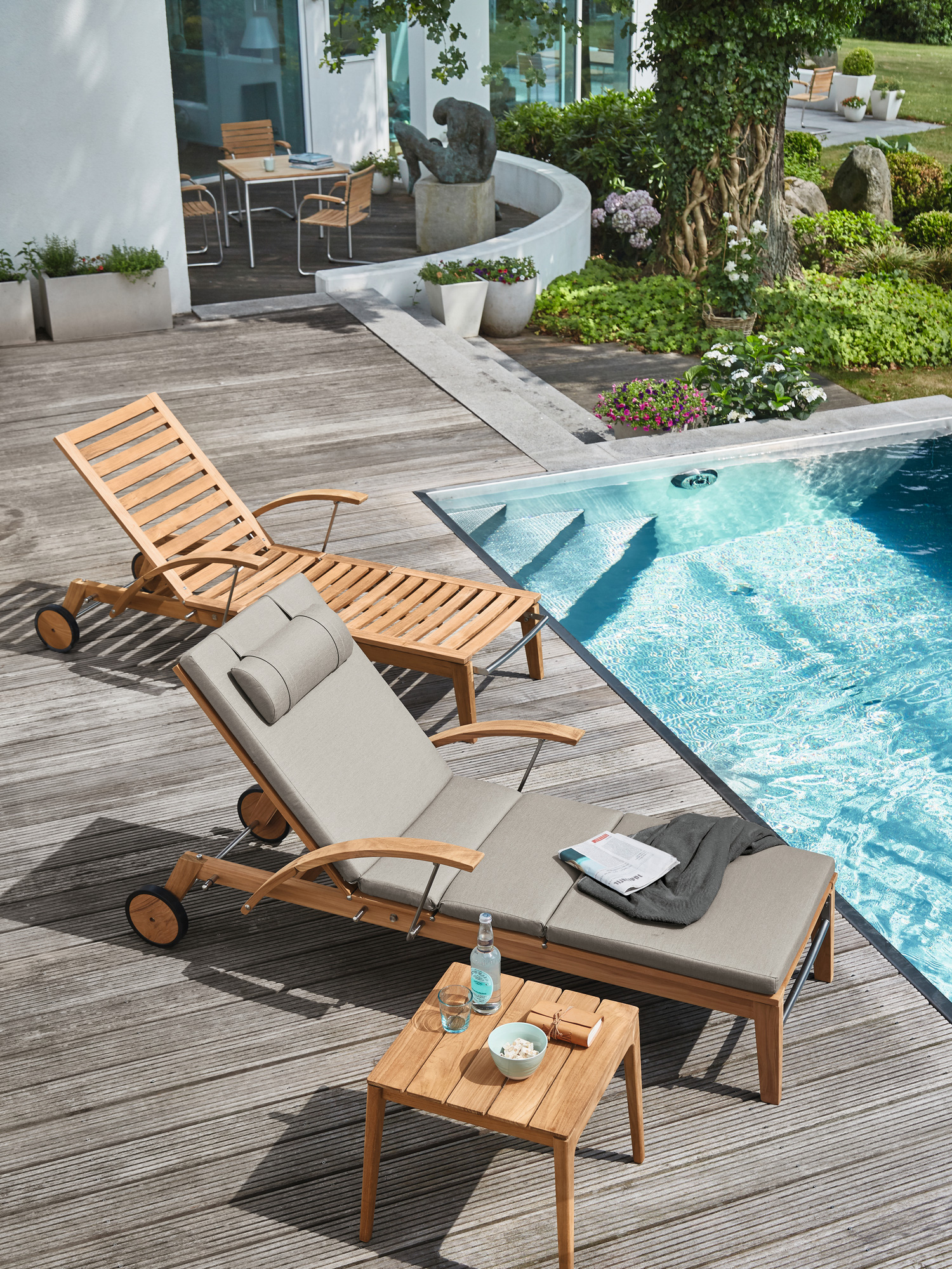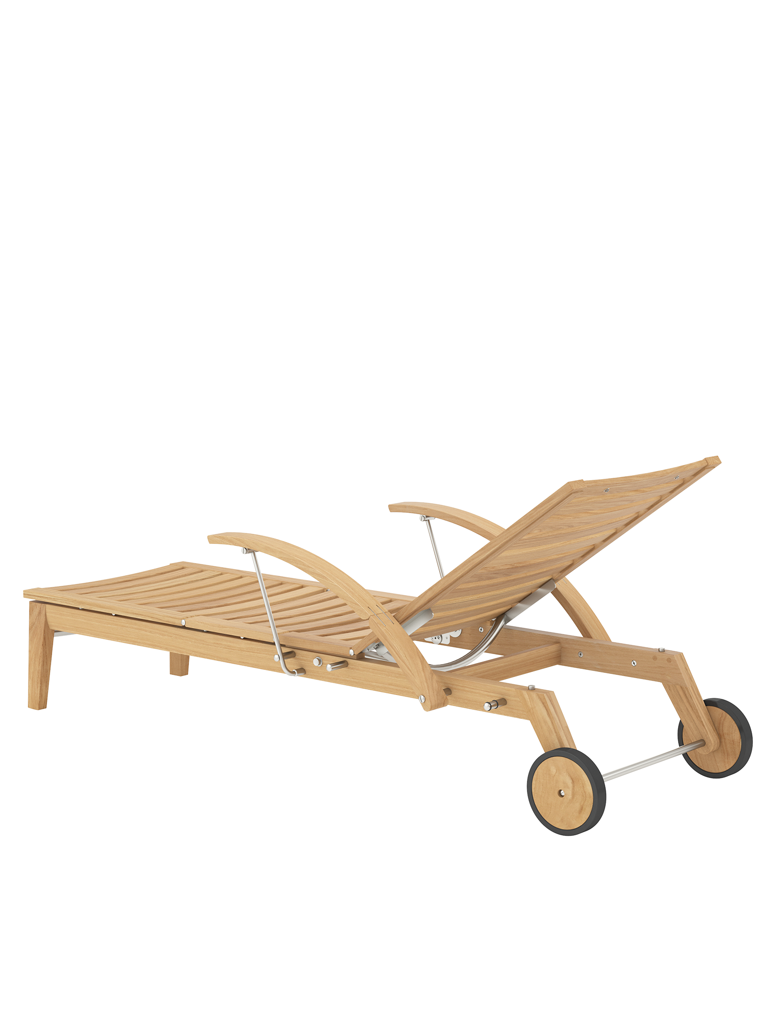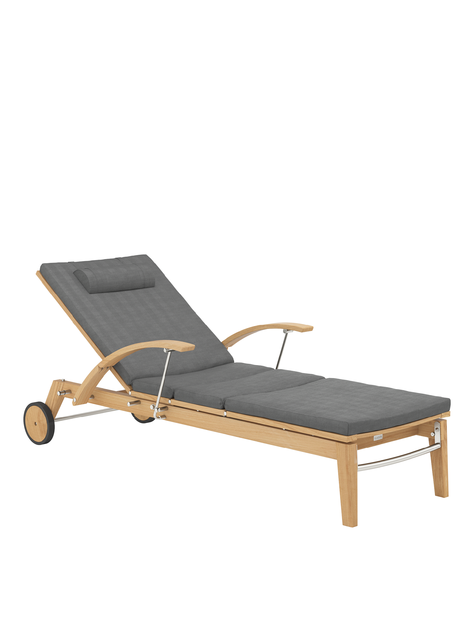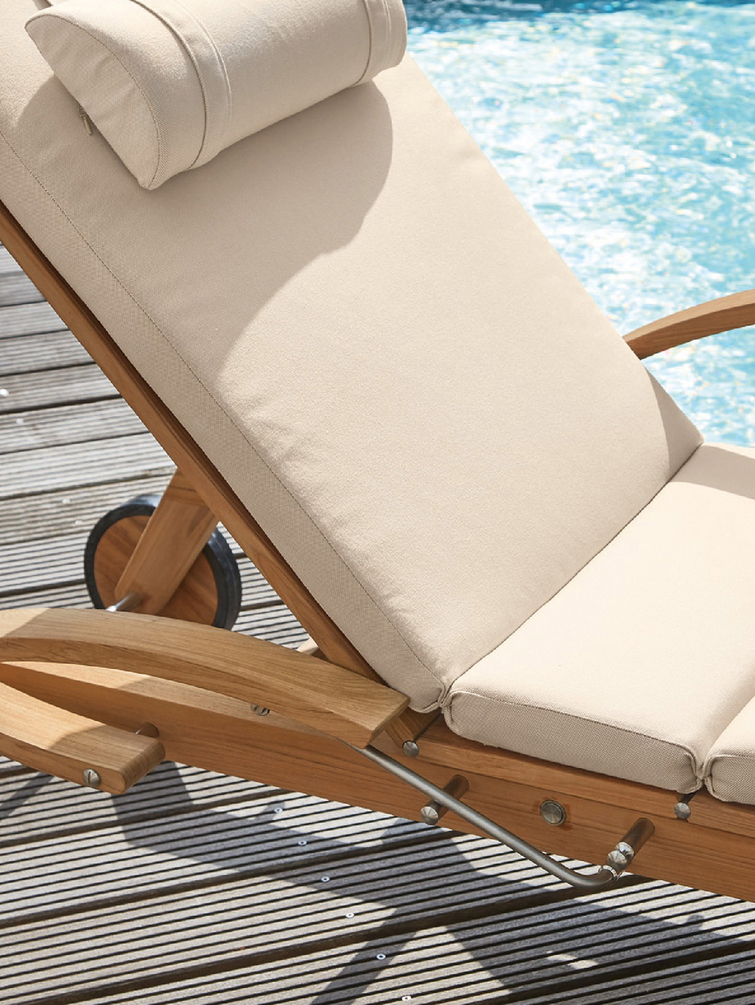 Hamptons vereint schlichte Eleganz mit einem Höchstmass an Komfort und technischer Raffinesse. Die Rückenlehne der Liege aus Teak lässt sich dank einer Gasdruckfeder einfach per Knopfdruck bedienen. Dezent unter dem Sitz verborgen übernimmt sie die stufenlose Einstellung der gewünschten Liegeposition. Zum bequemen Aus- und Einstieg können die Armlehnen einzeln nach hinten geklappt werden.