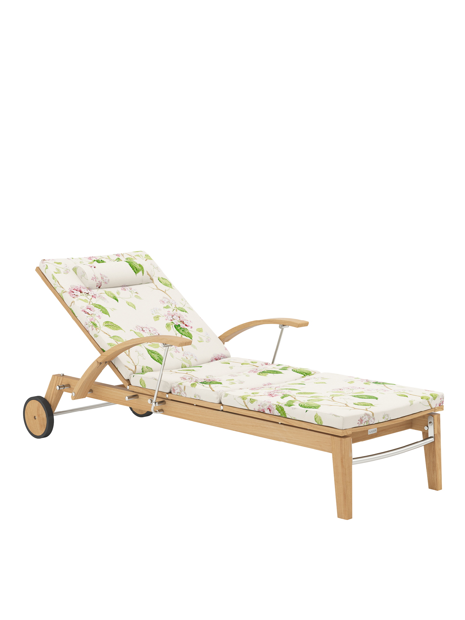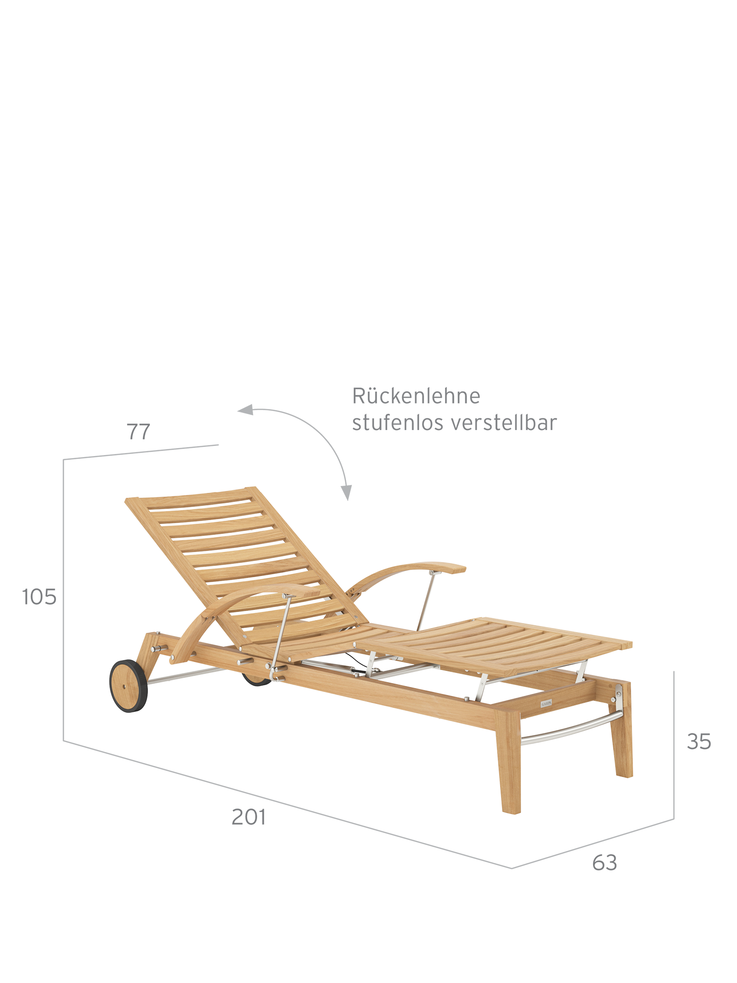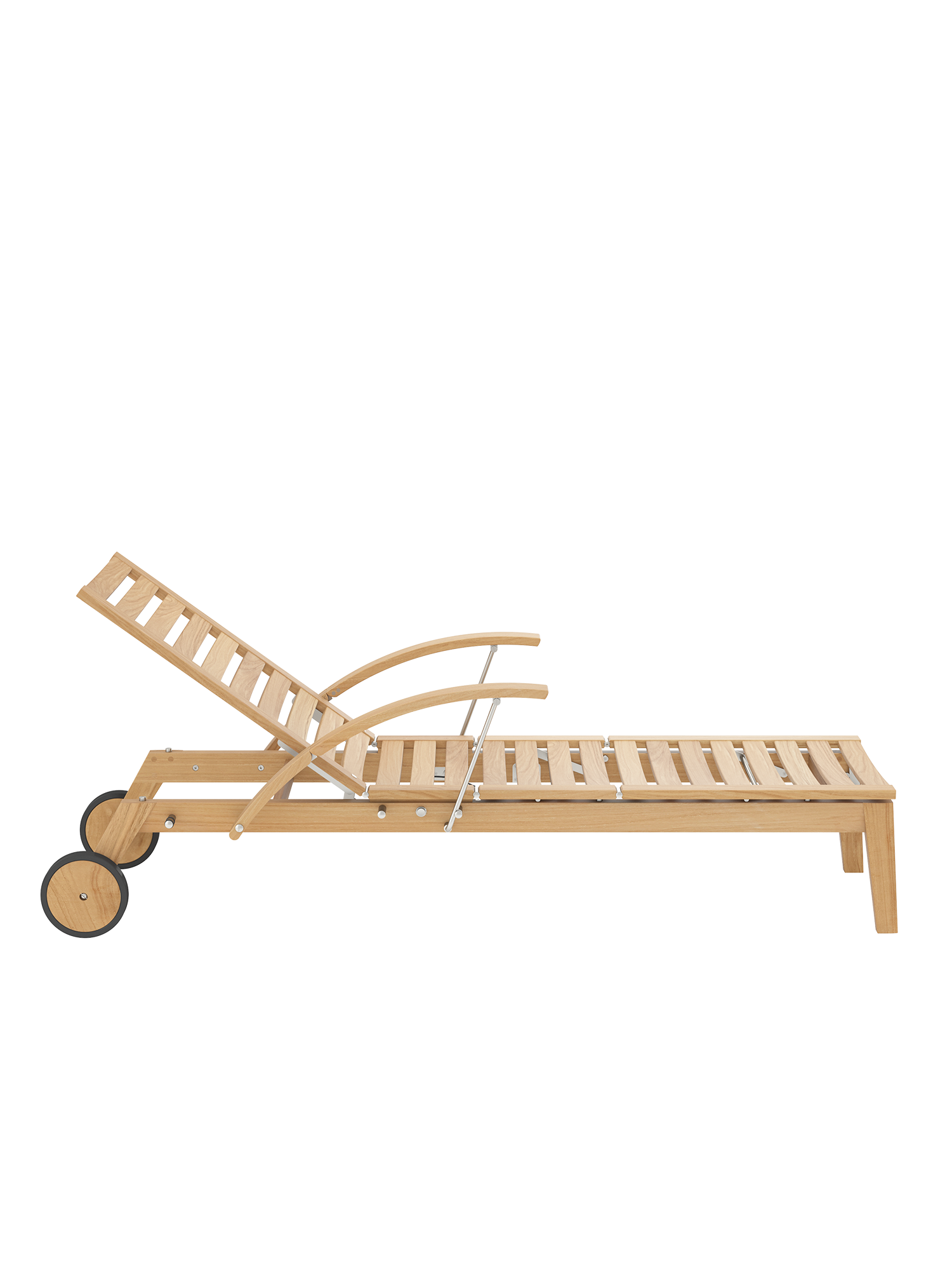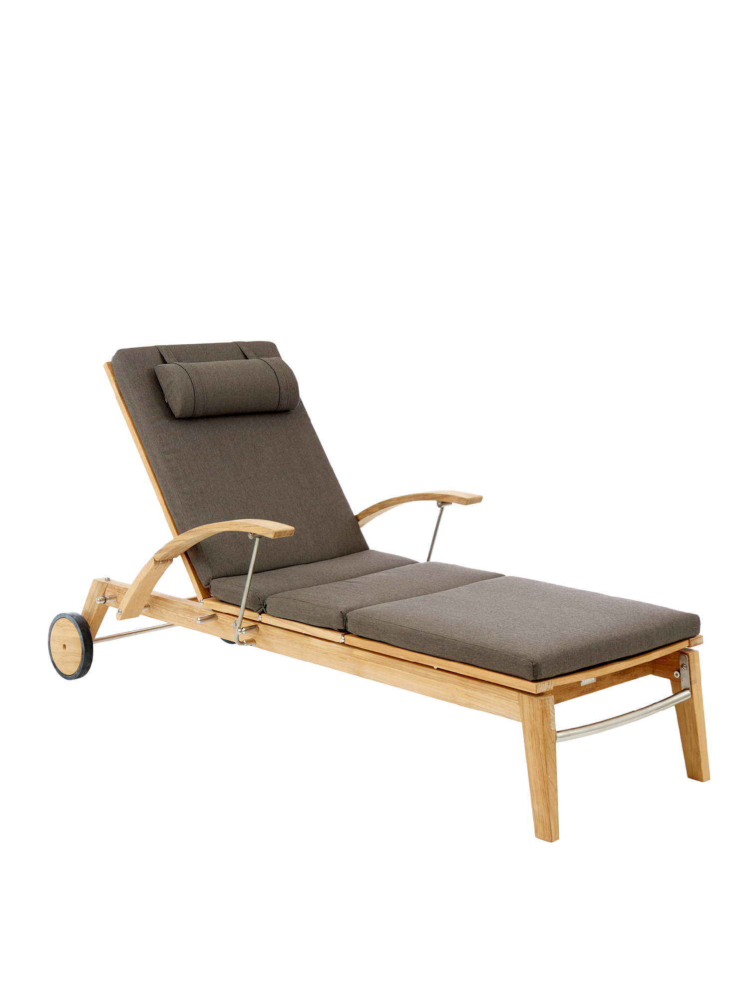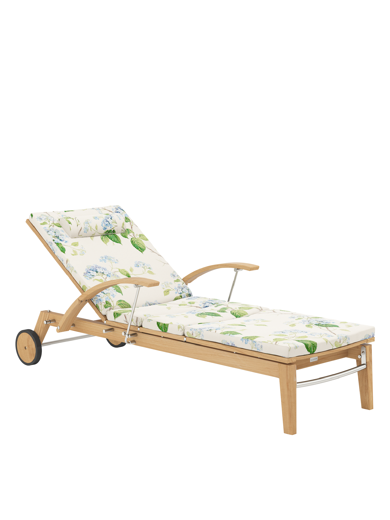 Hamptons vereint schlichte Eleganz mit einem Höchstmass an Komfort und technischer Raffinesse. Die Rückenlehne der Liege aus Teak lässt sich dank einer Gasdruckfeder einfach per Knopfdruck bedienen. Dezent unter dem Sitz verborgen übernimmt sie die stufenlose Einstellung der gewünschten Liegeposition. Zum bequemen Aus- und Einstieg können die Armlehnen einzeln nach hinten geklappt werden.