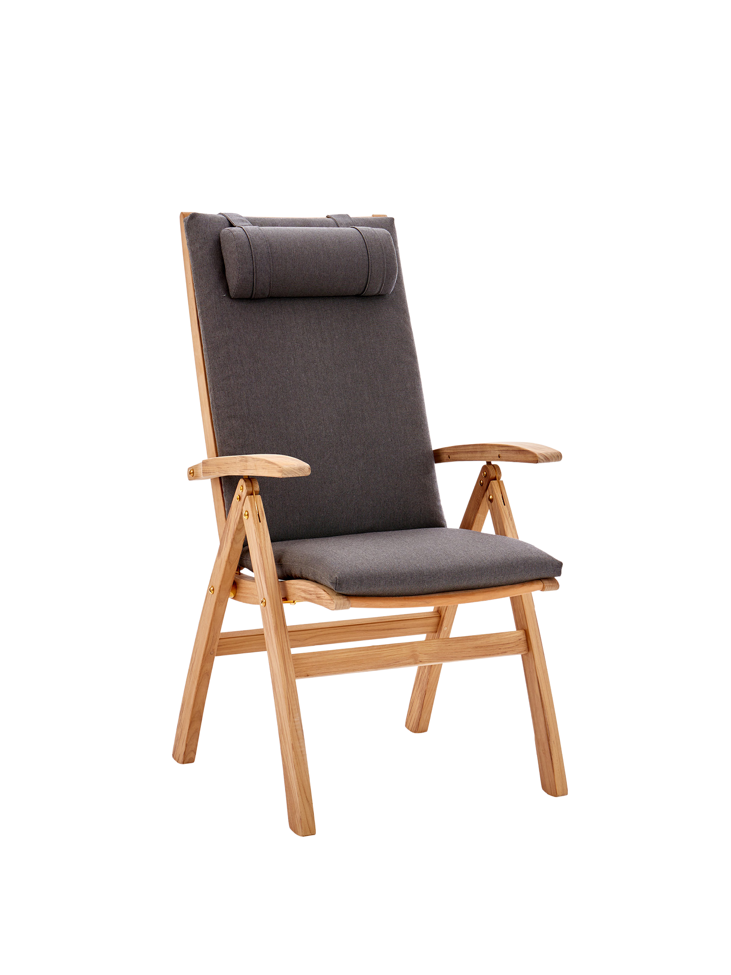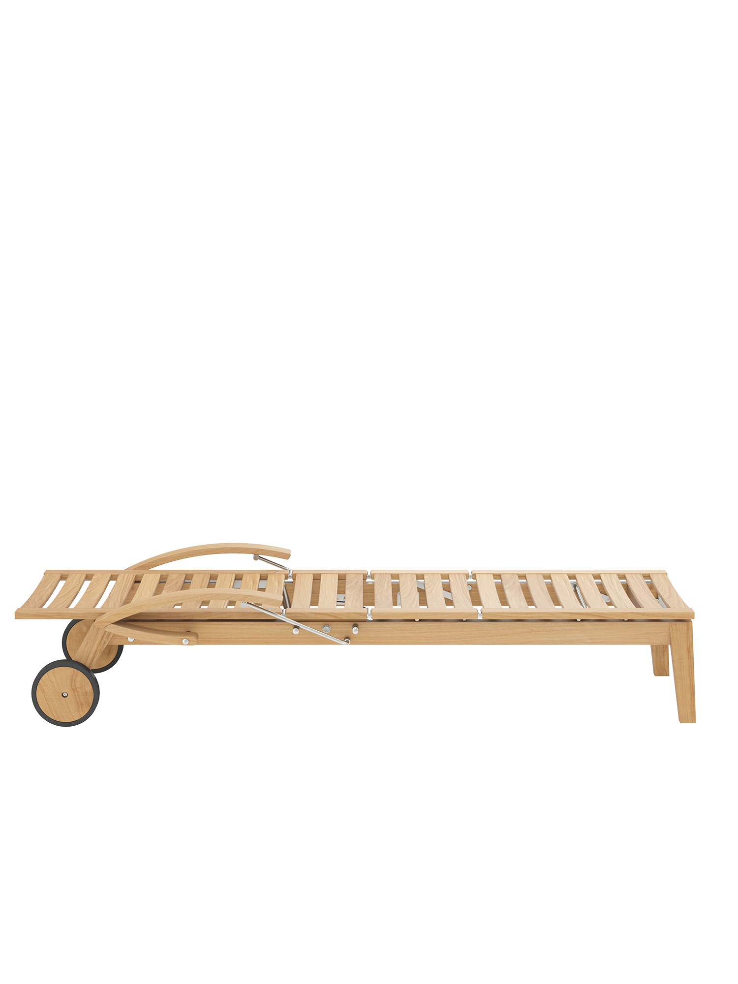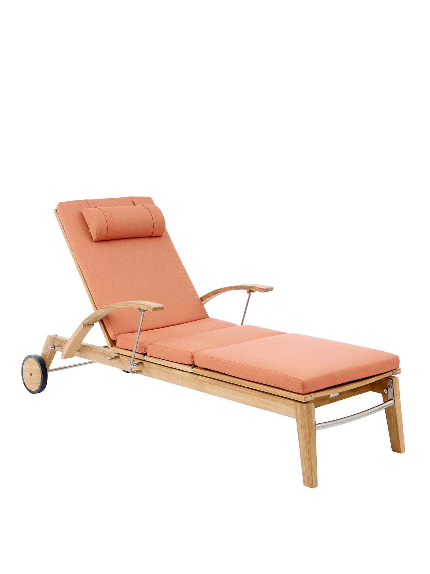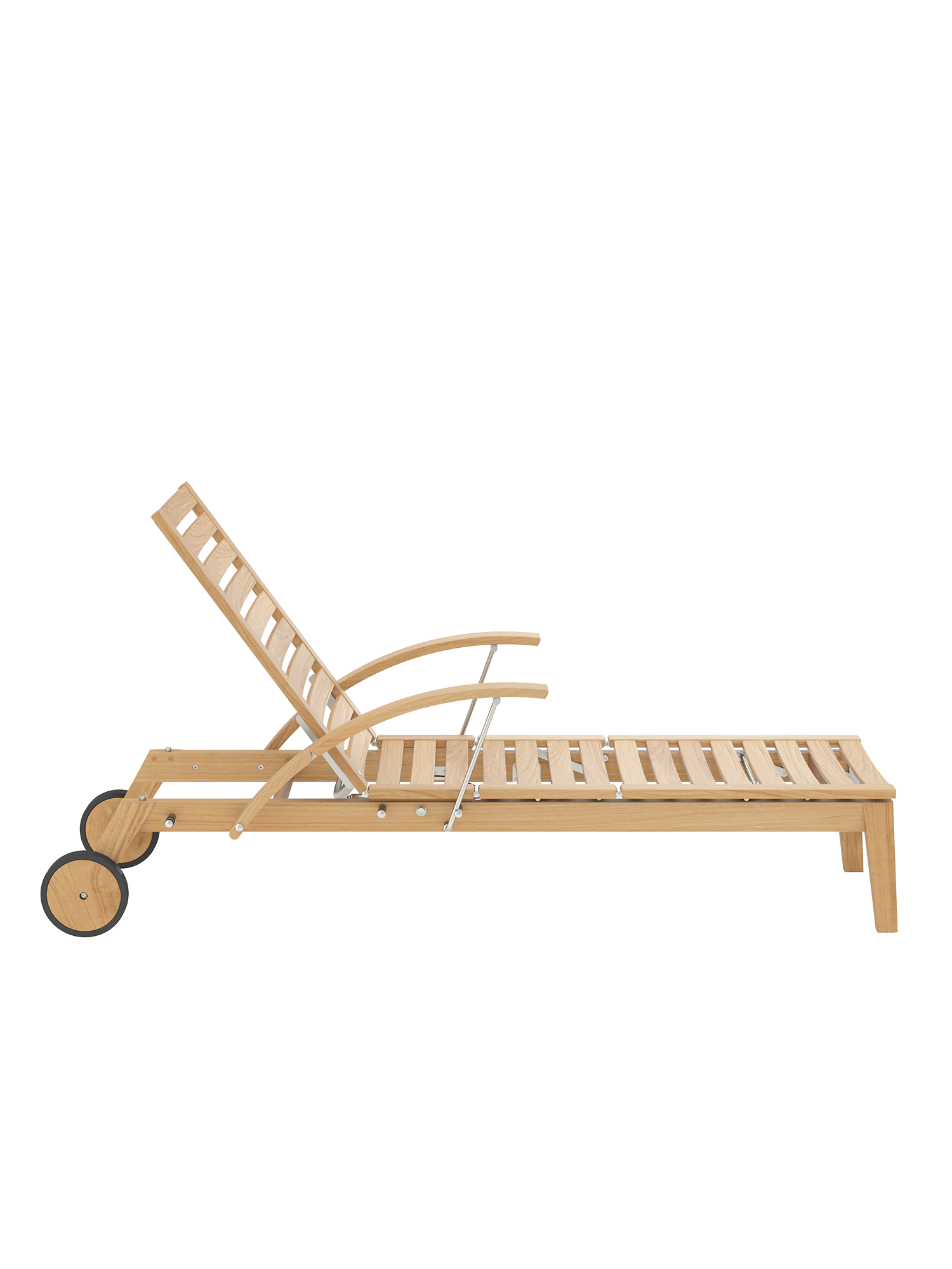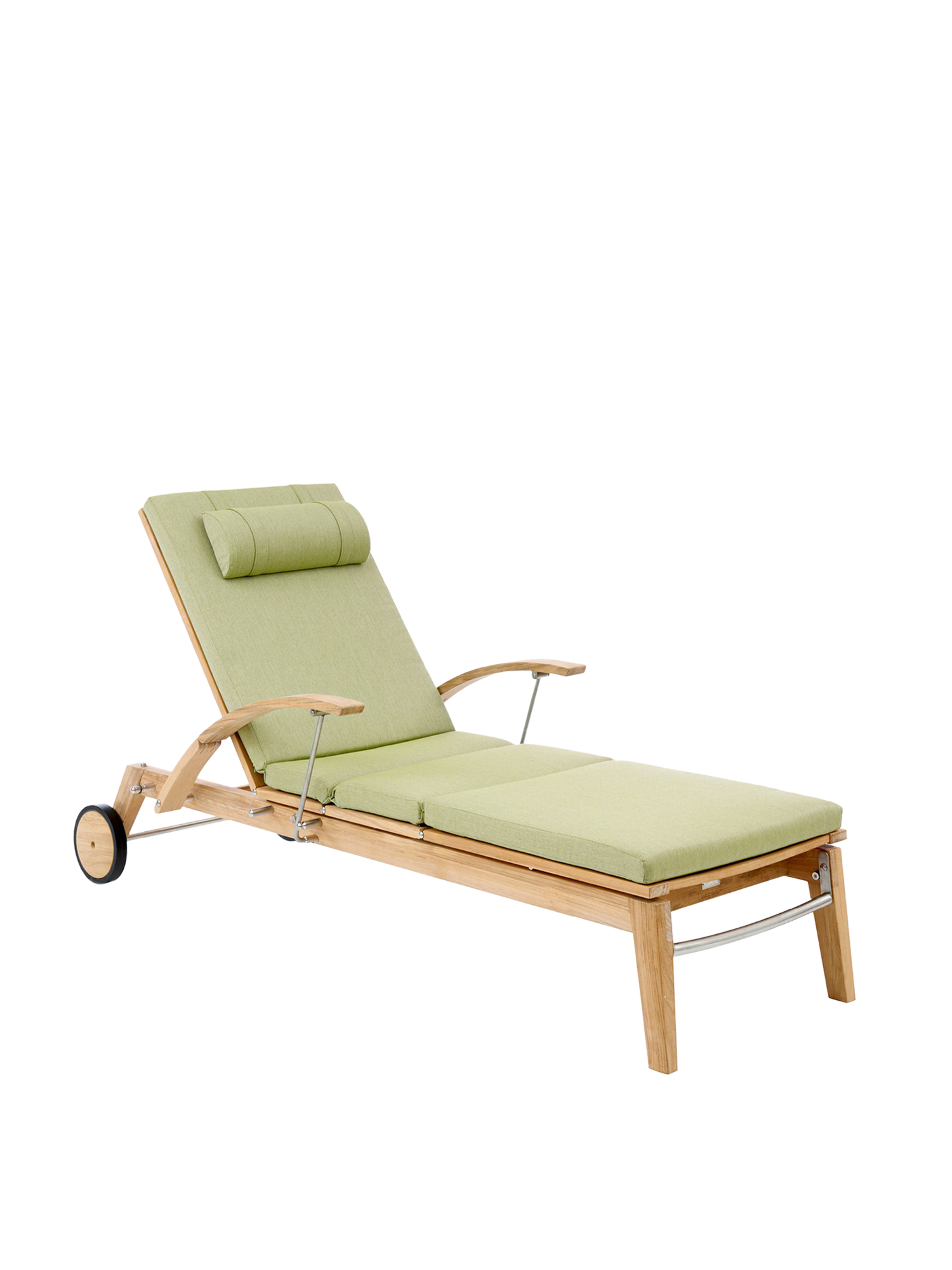 Hamptons vereint schlichte Eleganz mit einem Höchstmass an Komfort und technischer Raffinesse. Die Rückenlehne der Liege aus Teak lässt sich dank einer Gasdruckfeder einfach per Knopfdruck bedienen. Dezent unter dem Sitz verborgen übernimmt sie die stufenlose Einstellung der gewünschten Liegeposition. Zum bequemen Aus- und Einstieg können die Armlehnen einzeln nach hinten geklappt werden.