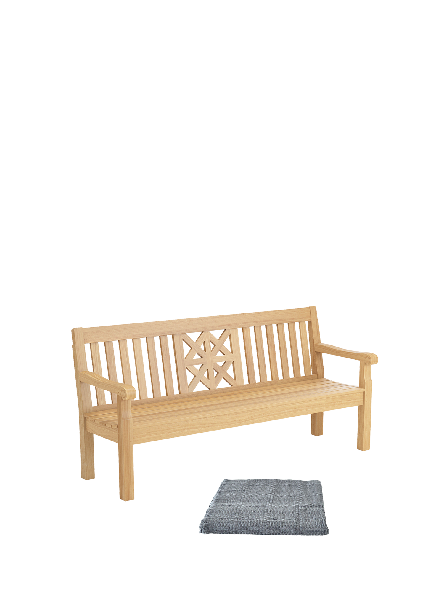 Die Gartenbank hat eine grosszügige Sitzfläche aus eng gestellten Leisten und eine geneigte Lehne. Ihr ausdrucksvolles Sternmuster beweist höchste handwerkliche Fertigkeit. Das zu 100 Prozent aus Wolle gefertigte Plaid Clamart potenziert den Komfort und setzt einen charmanten Akzent.