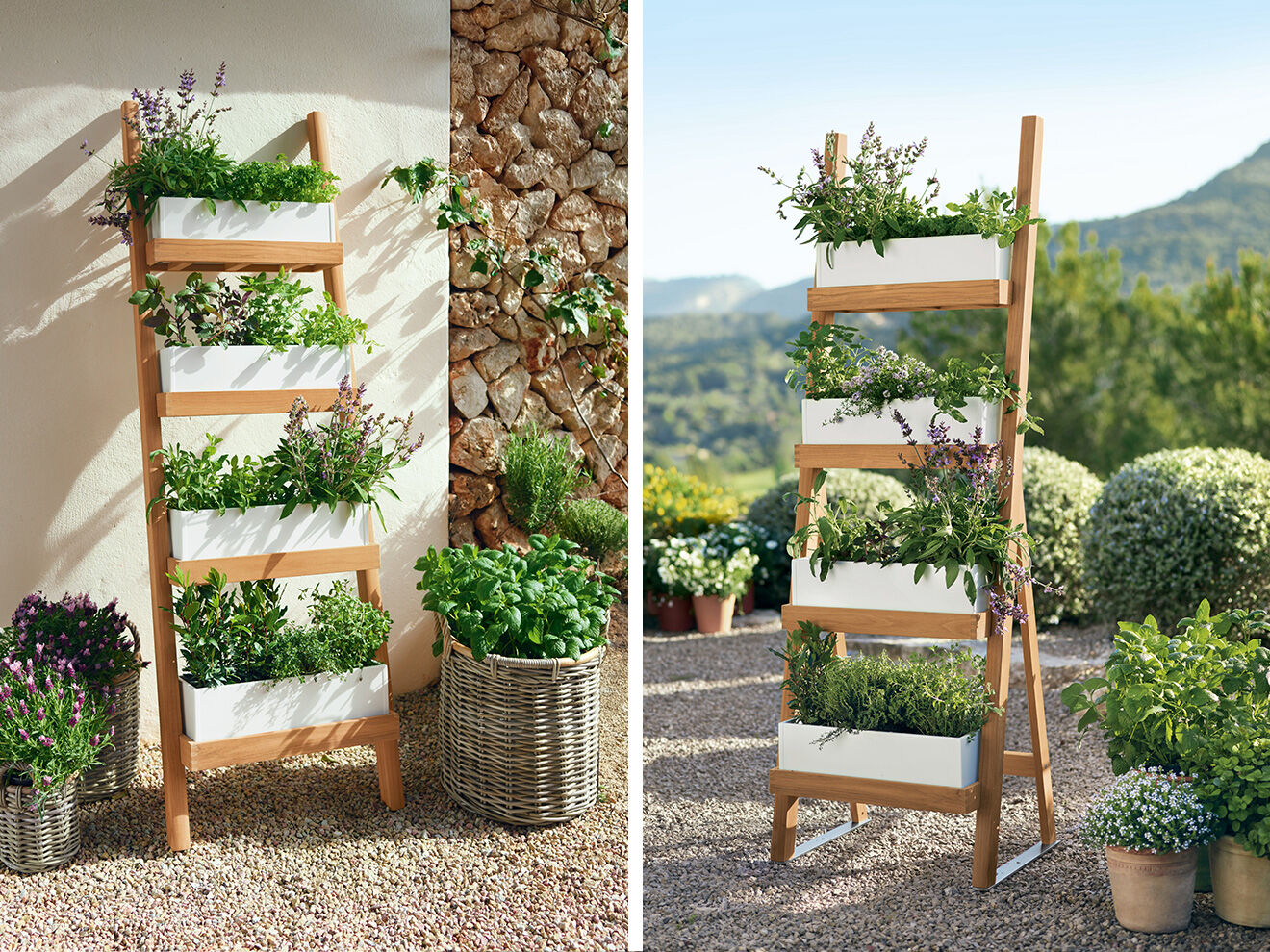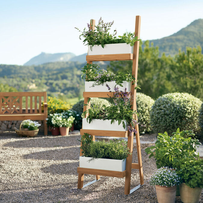 Gut aufgestellt: Mit jeder Stufe der aufstrebenden Normandie Pflanzleiter steigert sich der Genuss. Insbesondere Kräuter und niedrige Sommerblumen finden hier ideale Wachstumsbedingungen. Das Pflanzregal aus Teak mit vier mitgelieferten Pflanzkästen aus pulverbeschichtetem Aluminium in Weiss oder Graphit kann direkt an eine stabile Wand gelehnt oder mit einem optional erhältlichen Aufstellset frei platziert werden.