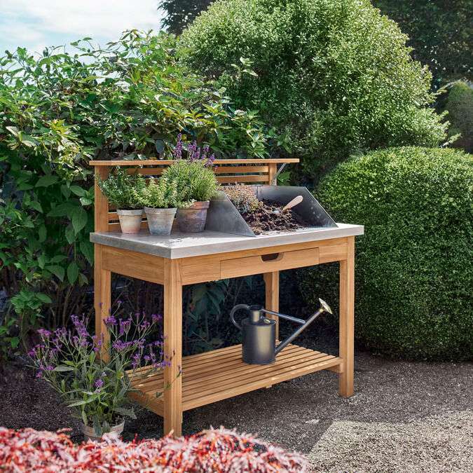 Für alle vorbereitenden Massnahmen empfiehlt sich der Pflanztisch mit einer bequemen Höhe von 90 Zentimetern. Wetterfest, aus hochwertigem Plantagenteak und mit einer Platte aus Zink bietet die klassische „Potting Bench“ eine komfortable Basis zum Umtopfen, Säen und Pikieren. Eine Schublade unter der Arbeitsfläche hat viel Platz für Schaufeln, Scheren und Samentütchen. Giesskannen, Pflanzgefässe und andere Hilfsmittel können auf dem unteren Regal verstaut werden. Eine Schütte aus Titanzink dient zum Anmischen der Gartenerde.