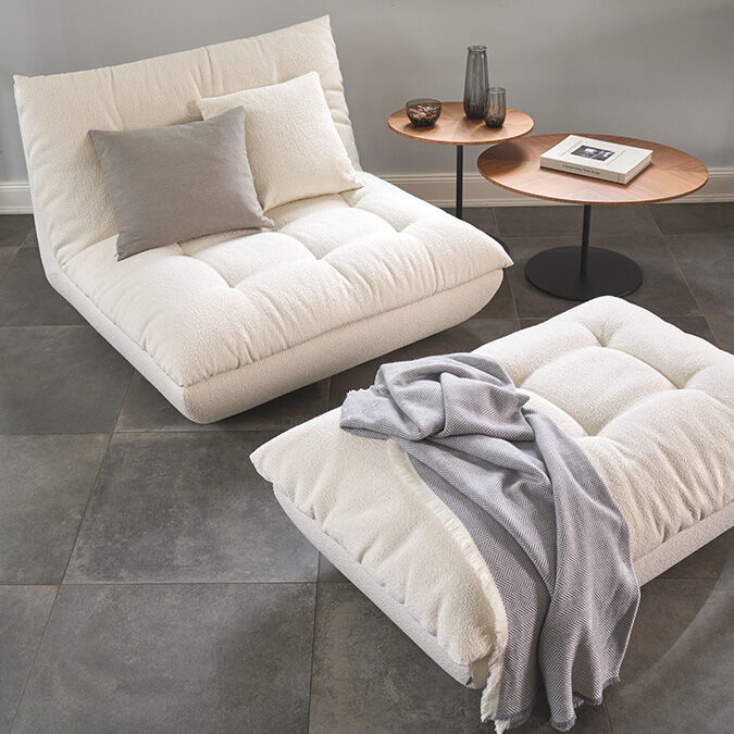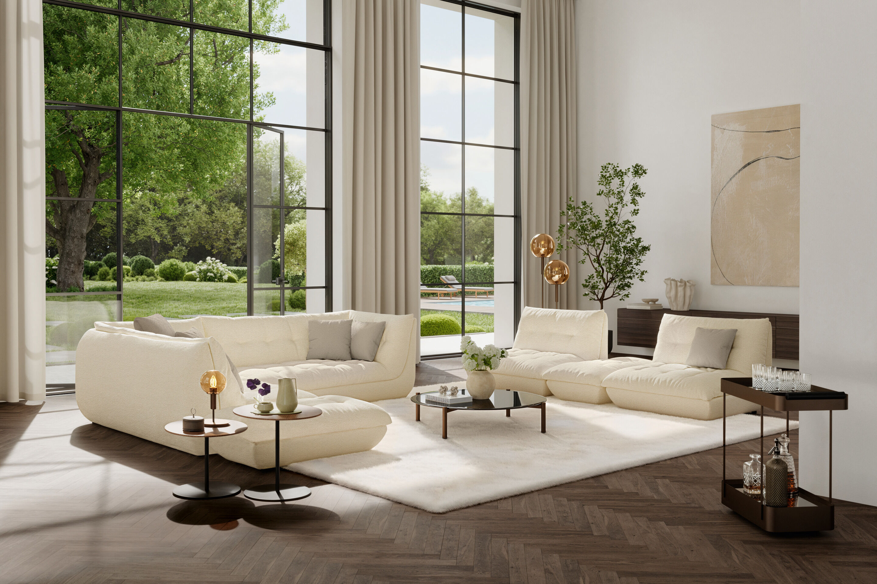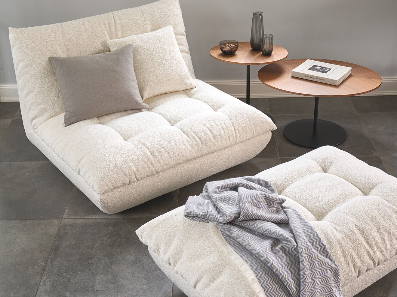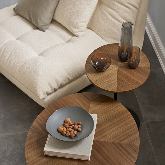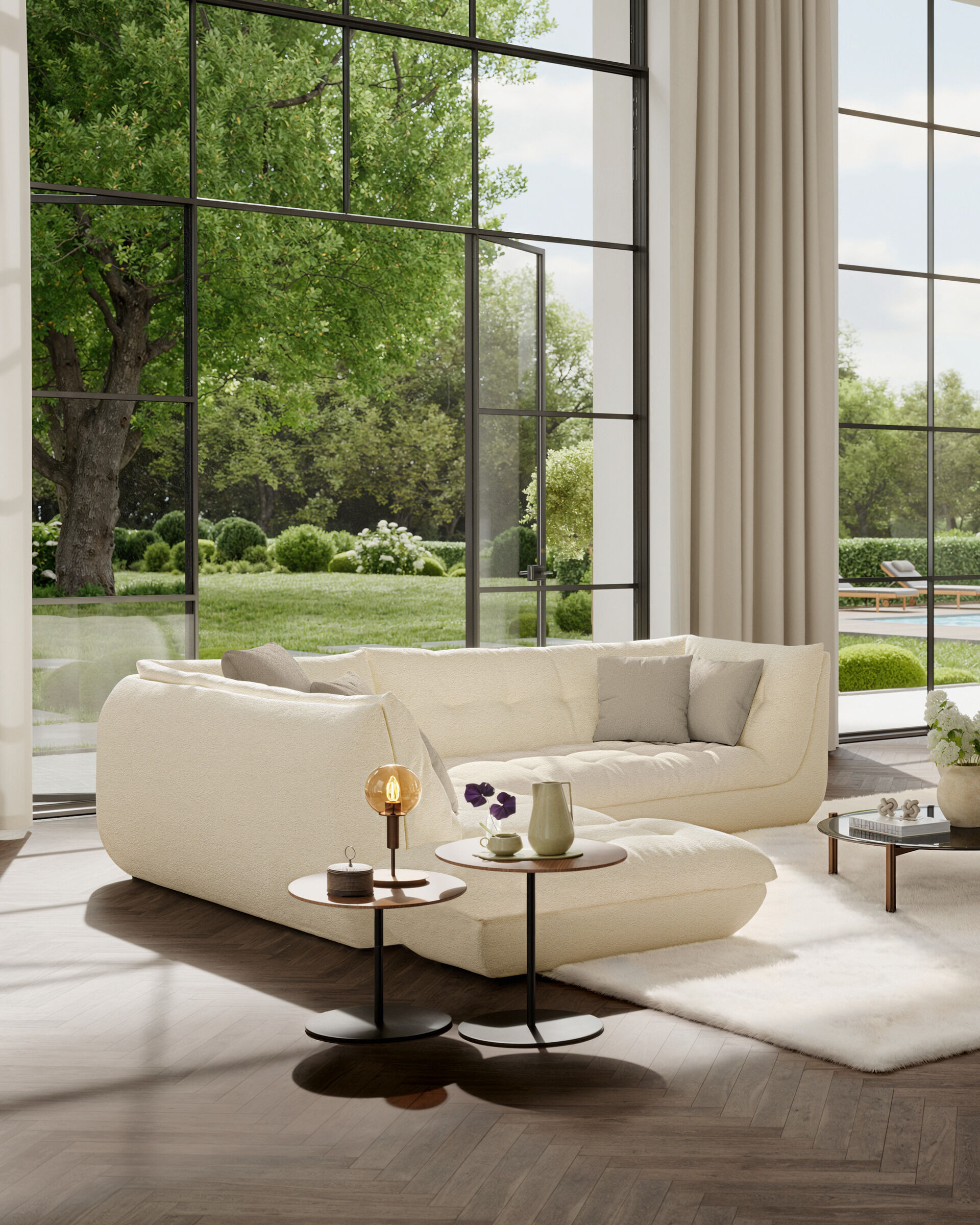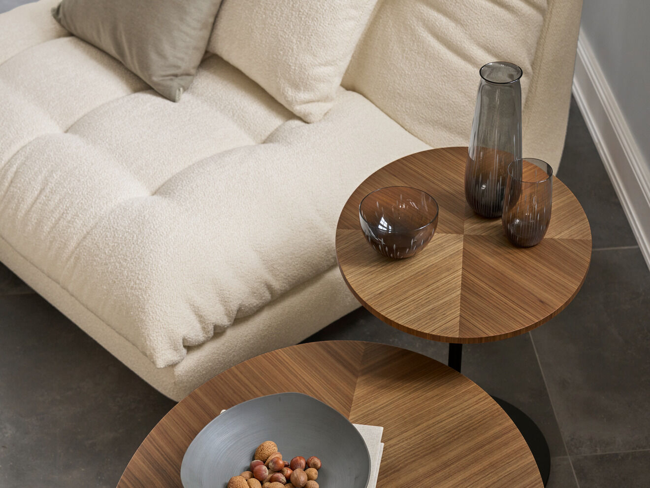 Das moderne Design mit ausgewogenen Proportionen und organischen Strukturen verleiht der Lounge nonchalant-skulpturalen Charakter. Beistelltische mit ovalen oder runden Oberflächen aus Holz oder Glas komplettieren jedes Ensemble.