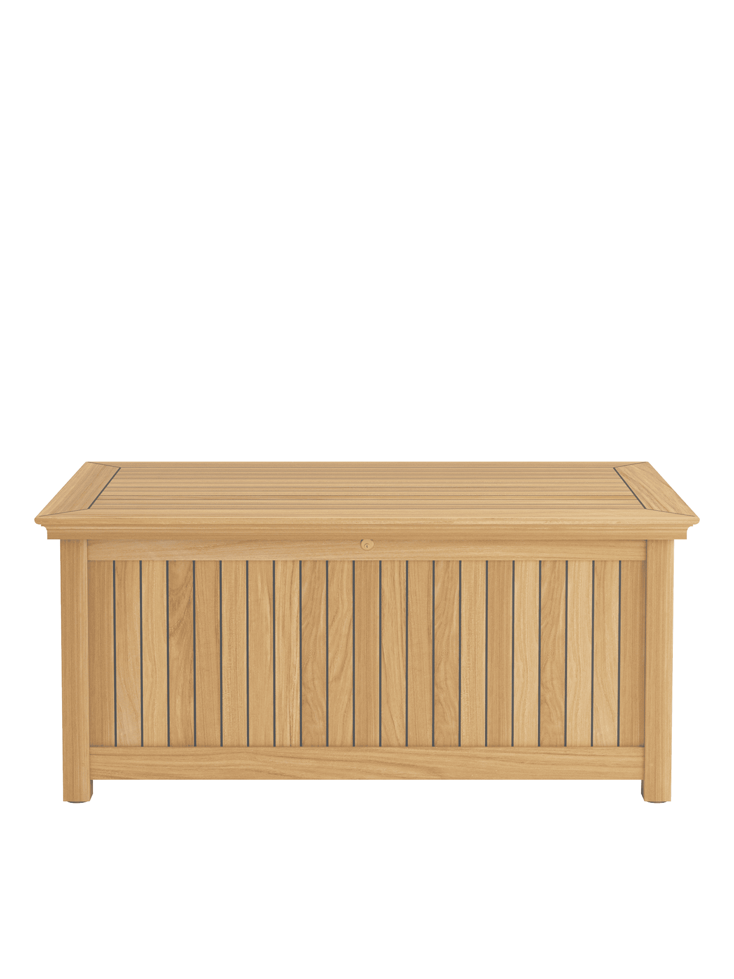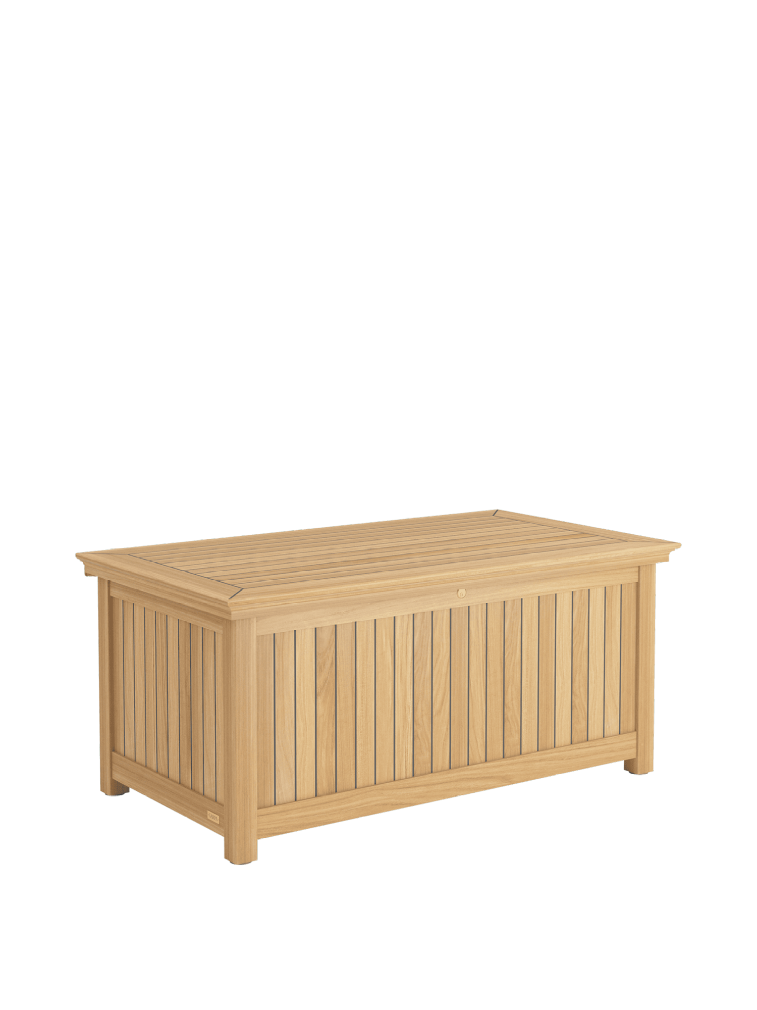Die Kissentruhen für die Auflagen der Garpa Gartenmöbel zeigen sich perfekt in Form und Funktion. Alle konstruktiven Bauteile sind aus massivem Teak. Die Seiten und der Deckel bestehen aus wetterfestem Schichtholz, das mit 2,5 mm starkem Teak furniert und wie die Decksplanken von Hochseeyachten verfugt ist. Schloss und Scharniere sind aus hochwertigem Messing.