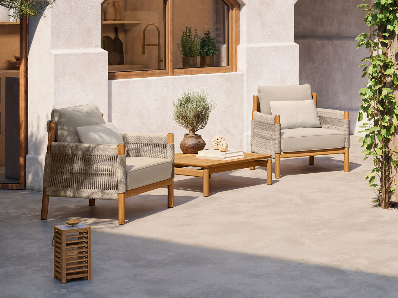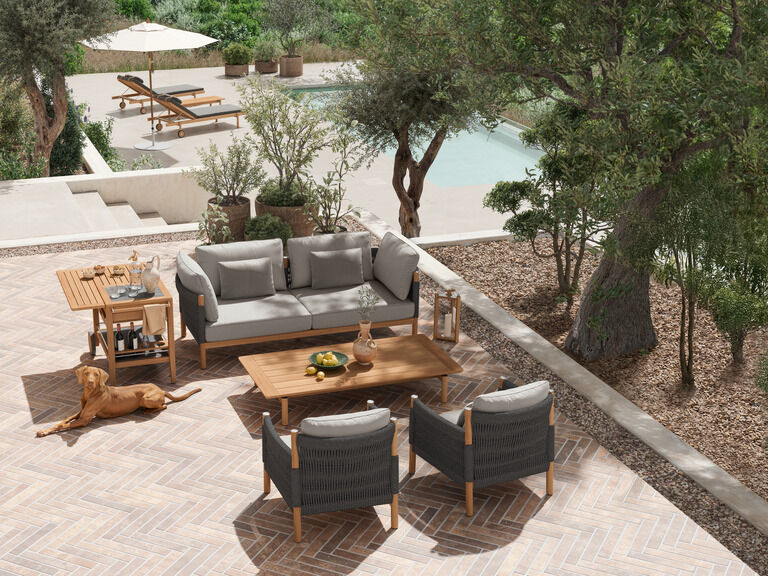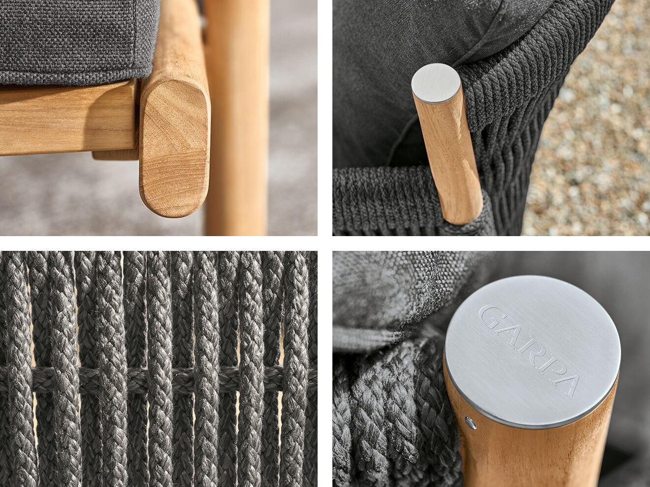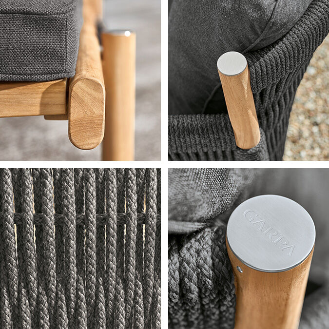 Italienische Designer haben, exklusiv für Garpa, ein wohnliches Szenario entworfen. Teakholz übernimmt den klassischen Part in fein gedrechselter Gestalt. Eine wetterfeste Kordel in edlem Beige oder Anthrazit, die von Hand zu einem so markanten wie anschmiegsamen Geflecht verarbeitet wird, schafft innovative Eleganz. Einladend weiche Polster und Kissen vollenden den Komfort. Durch ihre eigenständige Formgebung scheinen die Teakplatten der niedrigen Couchtische über den Tischbeinen zu schweben. Unterschiedliche Formate schaffen Platz für nützliche und dekorative Requisiten.