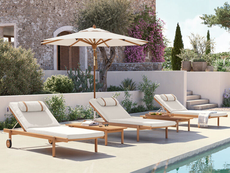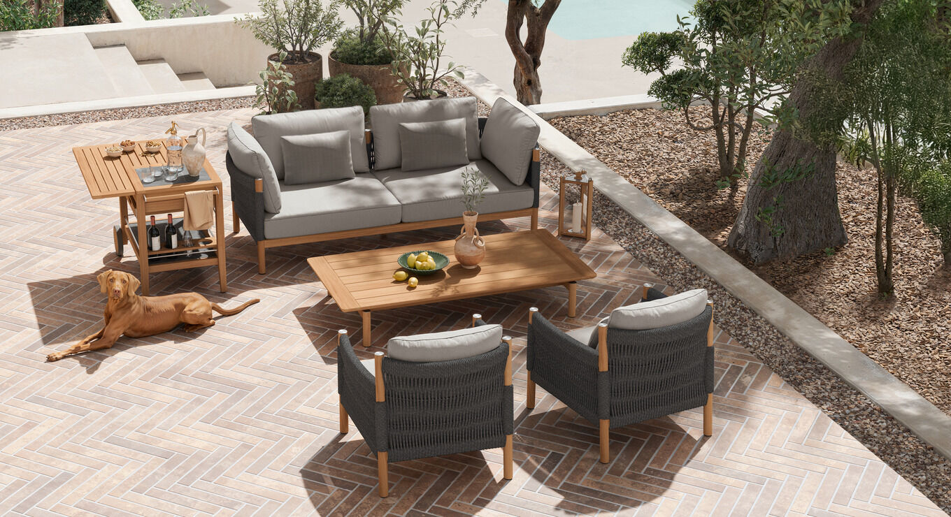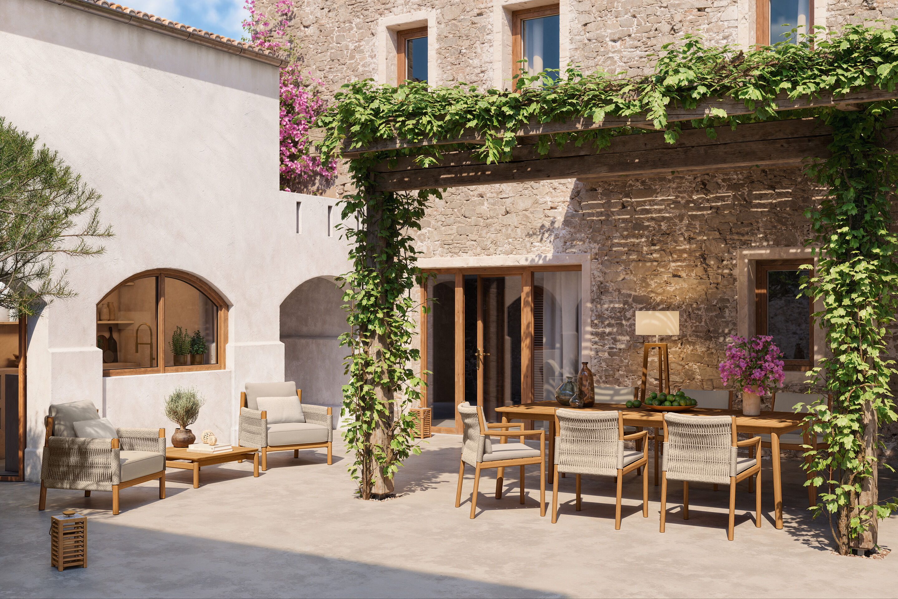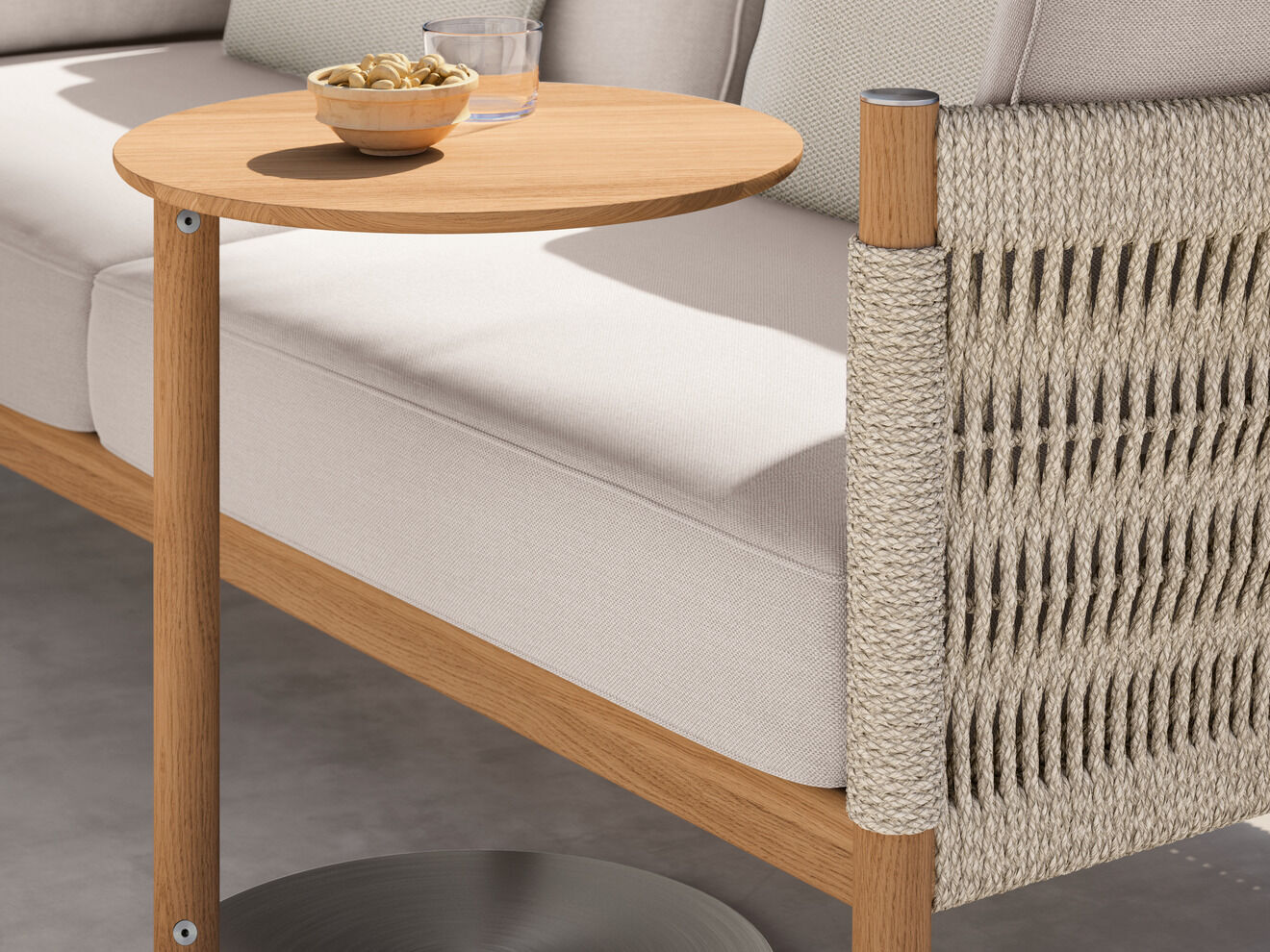 Italienische Designer haben, exklusiv für Garpa, ein wohnliches Szenario entworfen. Teakholz übernimmt den klassischen Part in fein gedrechselter Gestalt. Eine wetterfeste Kordel in edlem Beige oder Anthrazit, die von Hand zu einem so markanten wie anschmiegsamen Geflecht verarbeitet wird, schafft innovative Eleganz. Einladend weiche Polster und Kissen vollenden den Komfort. Durch ihre eigenständige Formgebung scheinen die Teakplatten der niedrigen Couchtische über den Tischbeinen zu schweben. Unterschiedliche Formate schaffen Platz für nützliche und dekorative Requisiten.