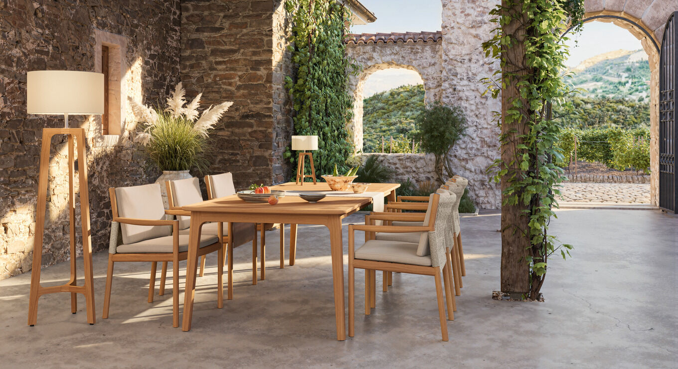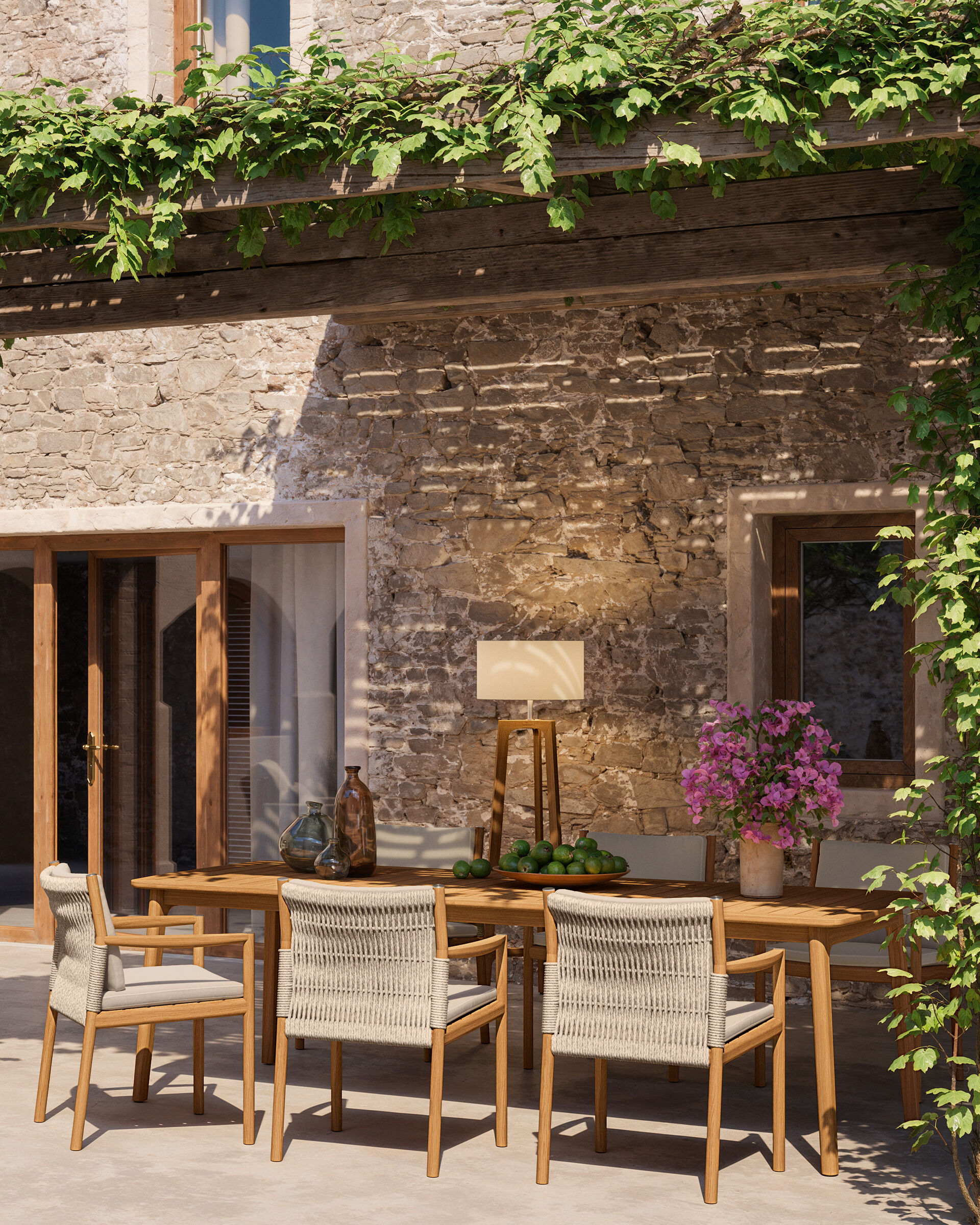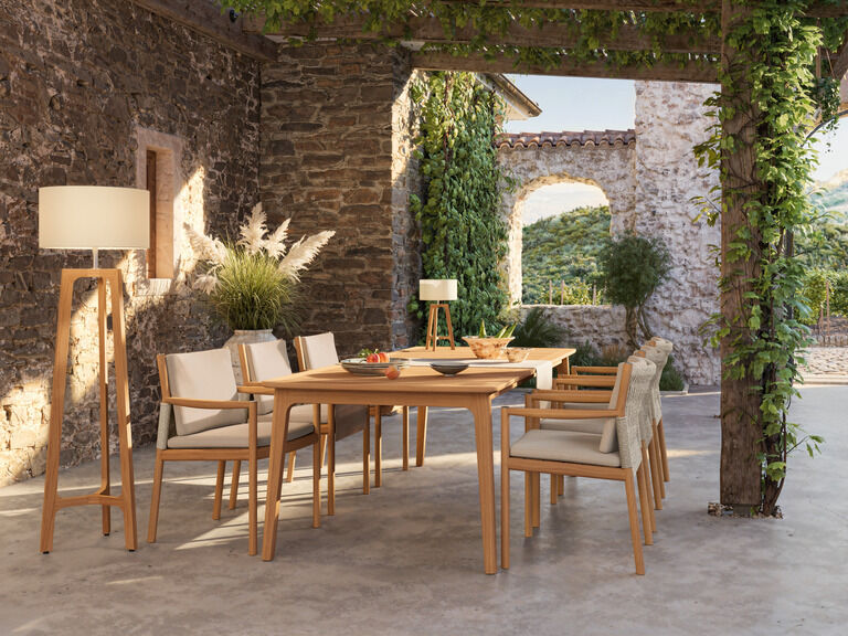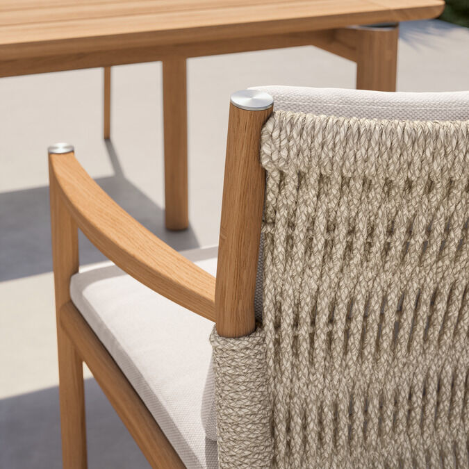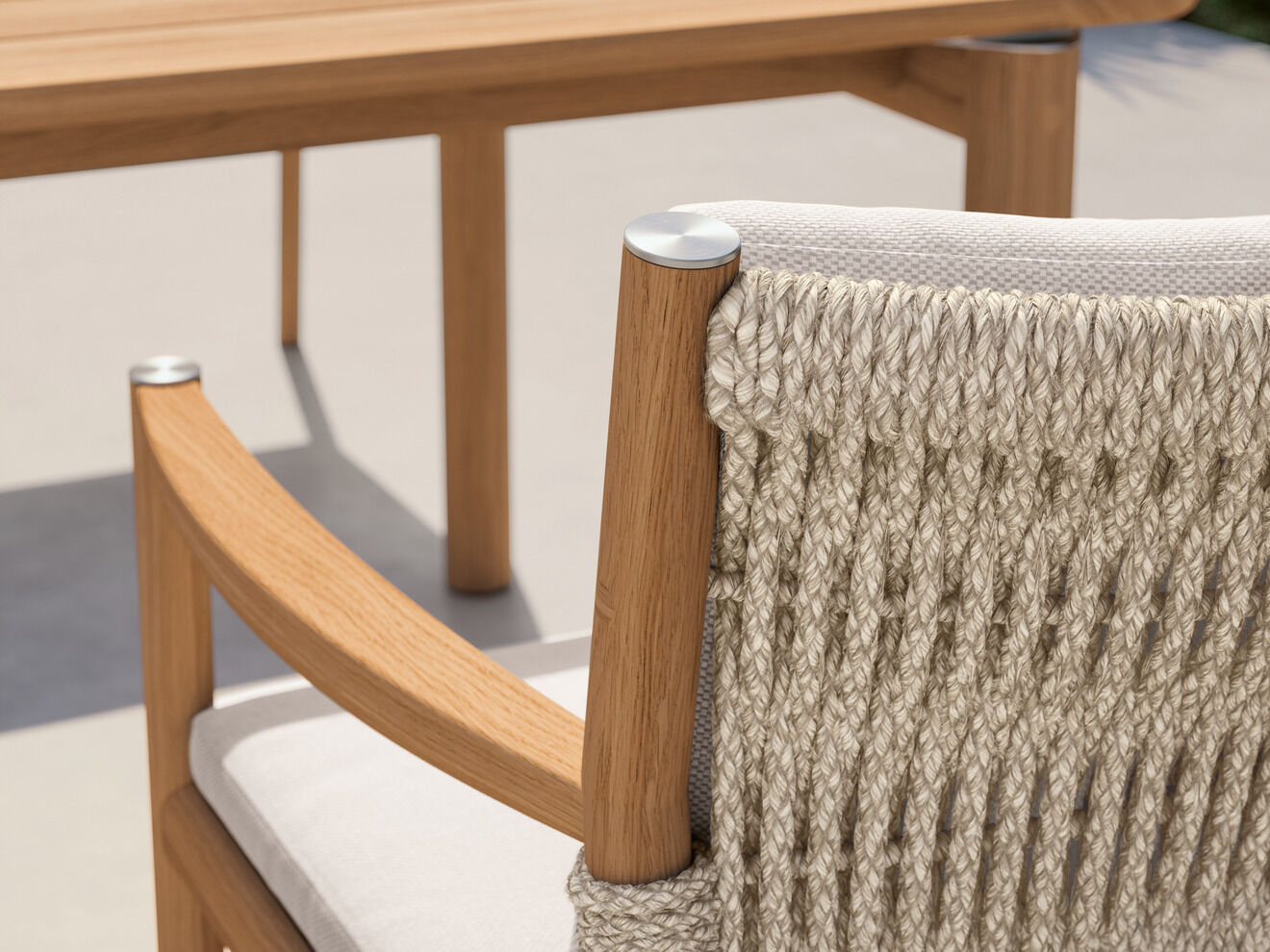 Im markanten Design, aus hochwertigen Materialien und von einladender Ergonomie verheisst der Armlehnstuhl der Cavo Kollektion überragenden Komfort. Das straffe Kordelgeflecht seiner Rückenlehne bietet Halt und Geborgenheit zugleich. Die Sitzfläche aus Teakleisten ermöglicht auch bei ausgedehnten Tafelgesprächen eine entspannte Haltung. Weiche Auflagen sind optional erhältlich. Als besonders grosszügiger Partner empfiehlt sich der Cavo Esstisch, den wir in einer limitierten Auflage anbieten. Auch die Preston Tische mit eingelegter Keramikplatte komplettieren harmonisch jedes Ensemble.