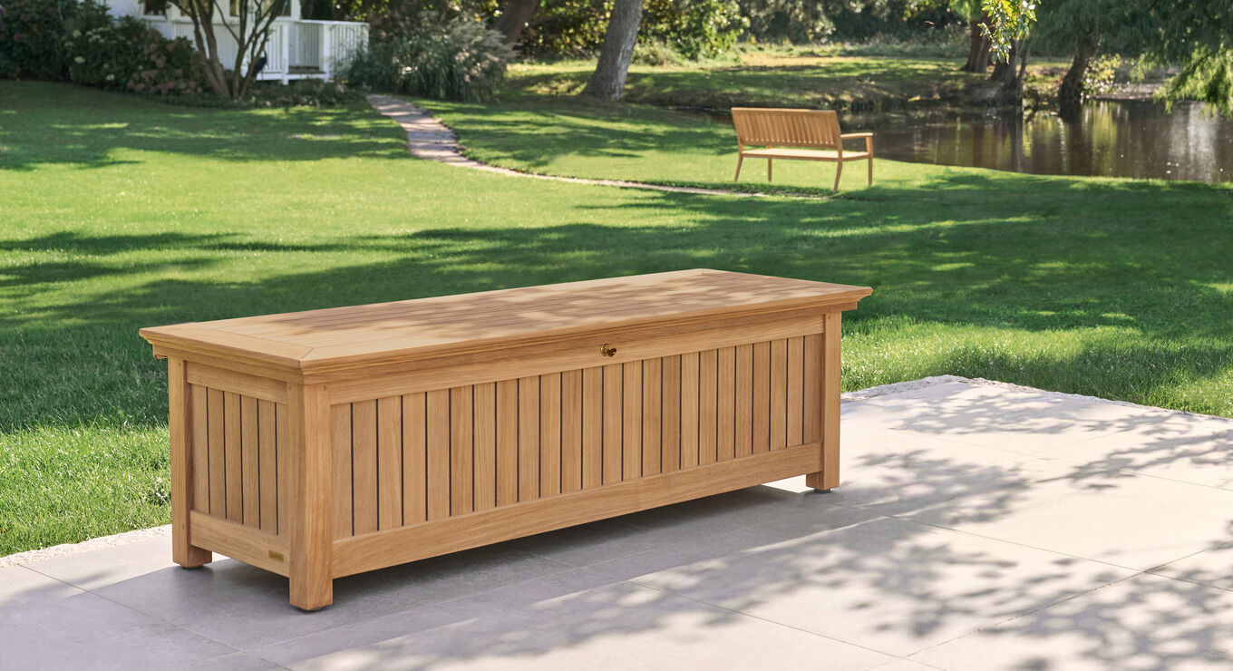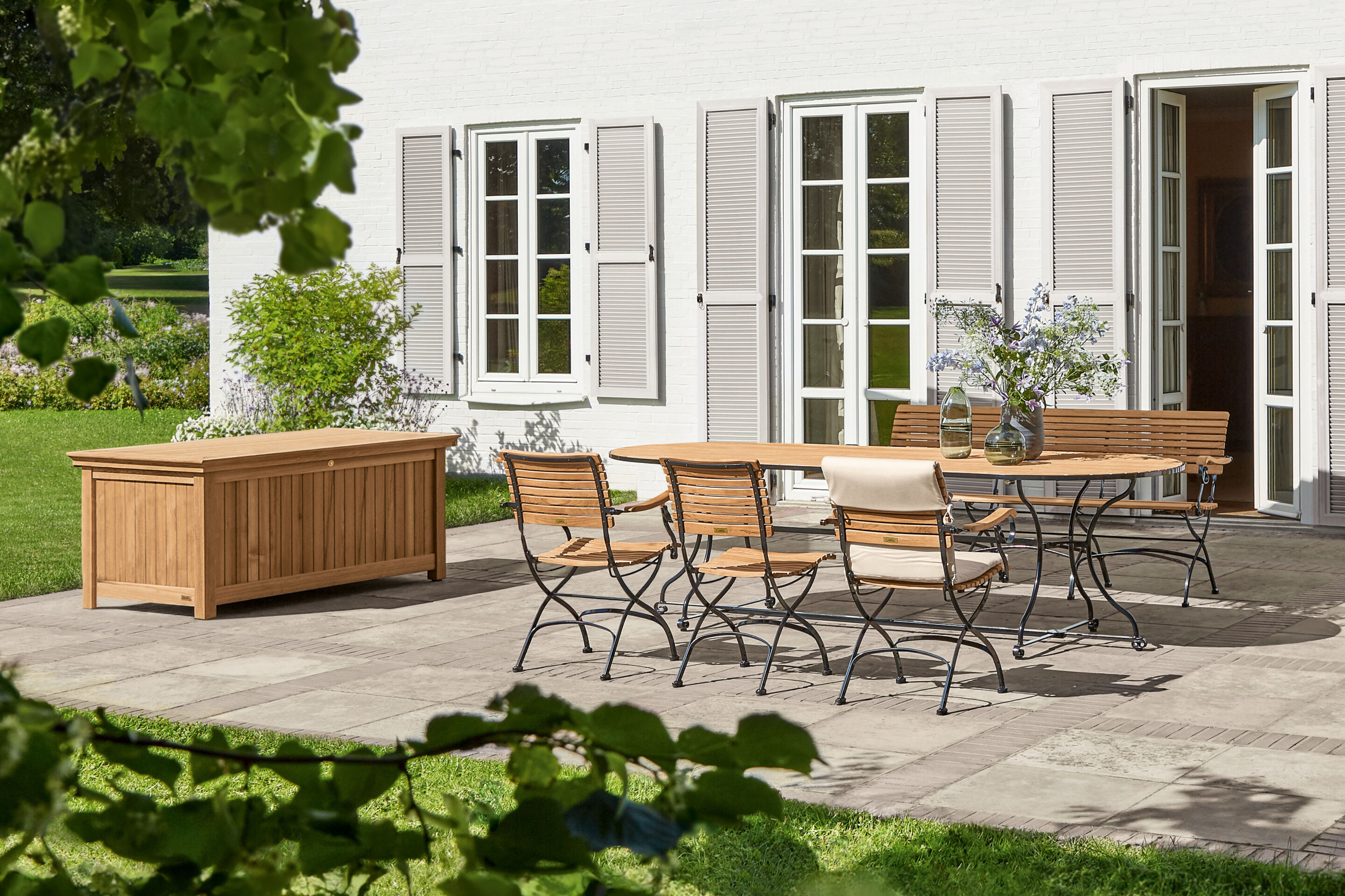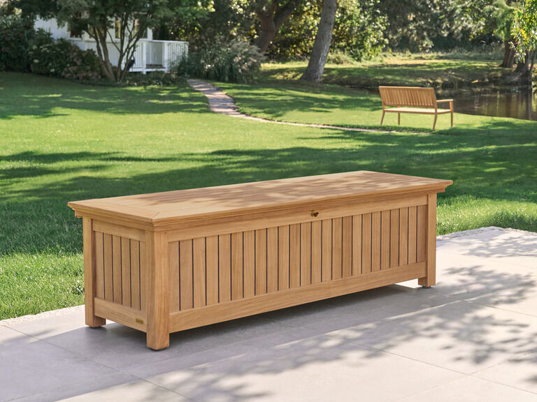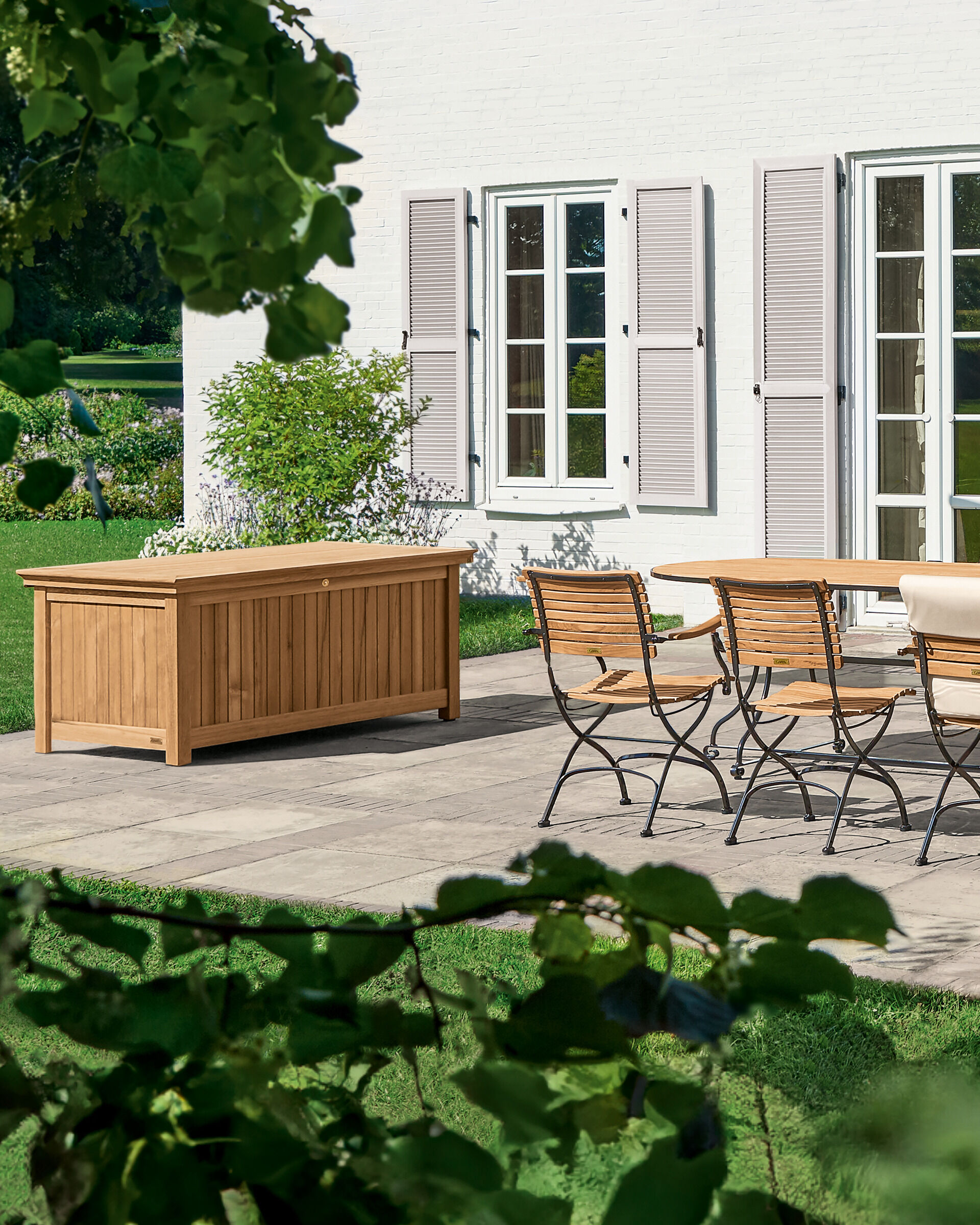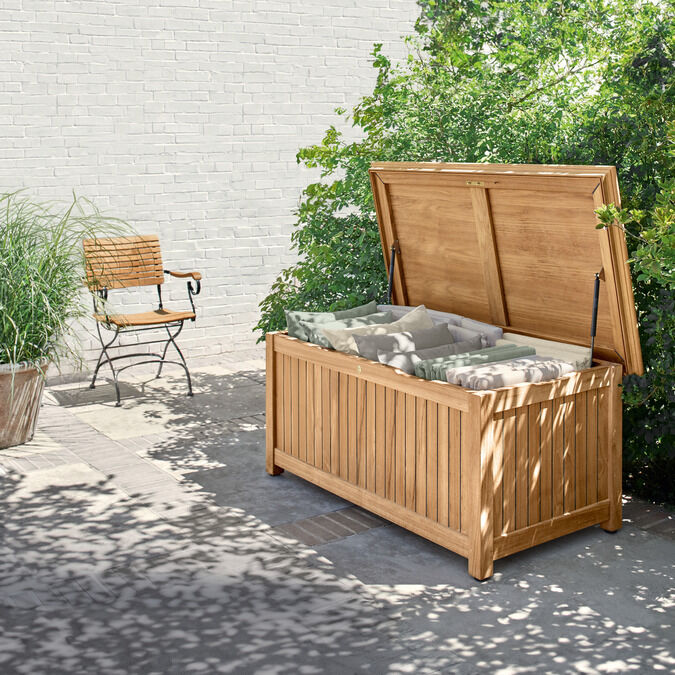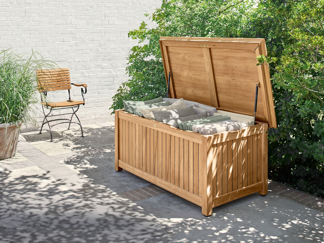 Wann immer die Sonne lockt – die Auflagen für Liegen und Gartenstühle warten schon darauf, ausgepackt zu werden. Kissentruhen aus Teak verwahren alles griffbereit, luftig und trocken.