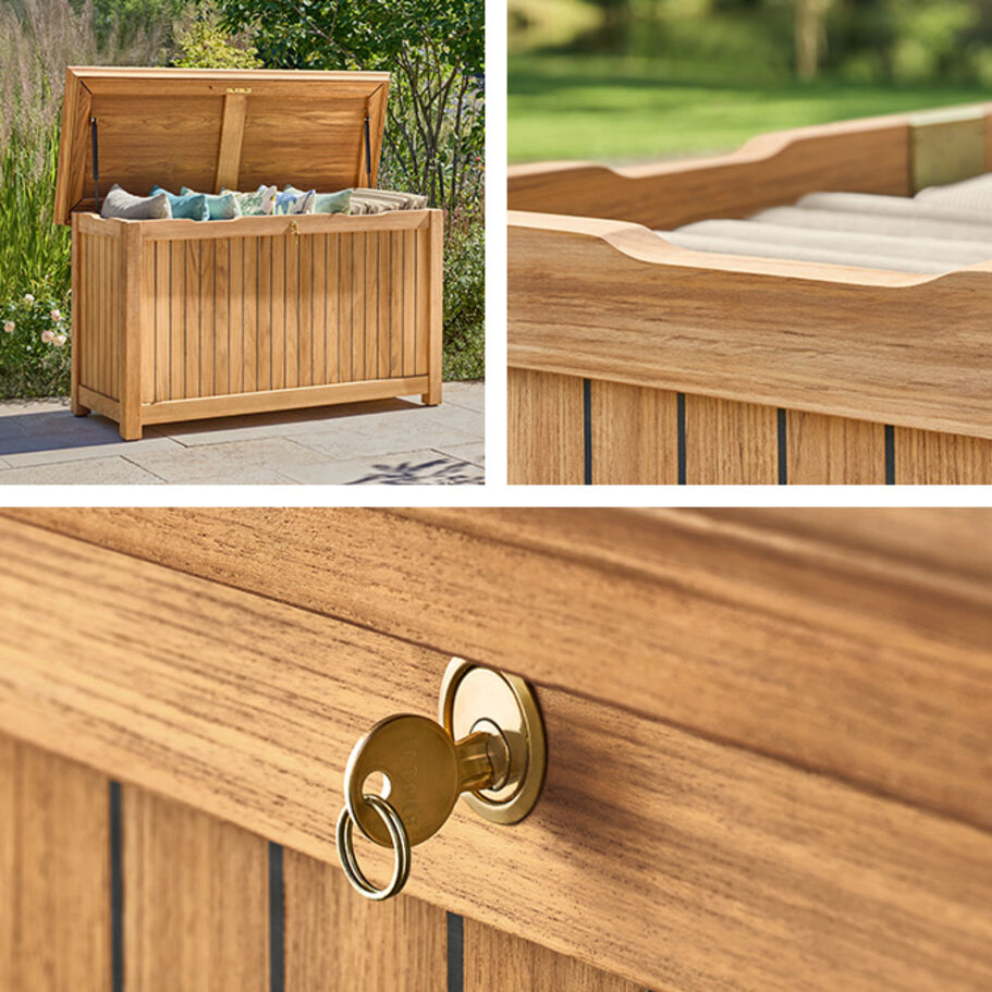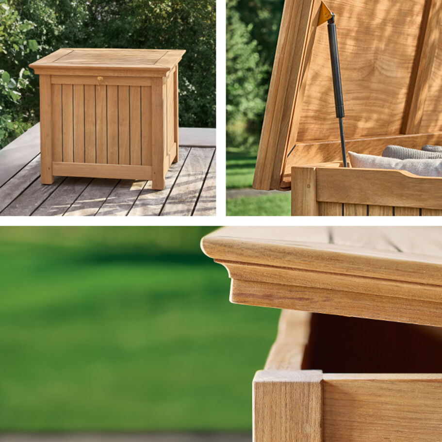 Alle Bauteile der Teaktruhen sind aus massivem Plantagenteak. Alle Deckel haben Abtropfleisten und schützen selbst bei Starkregen.