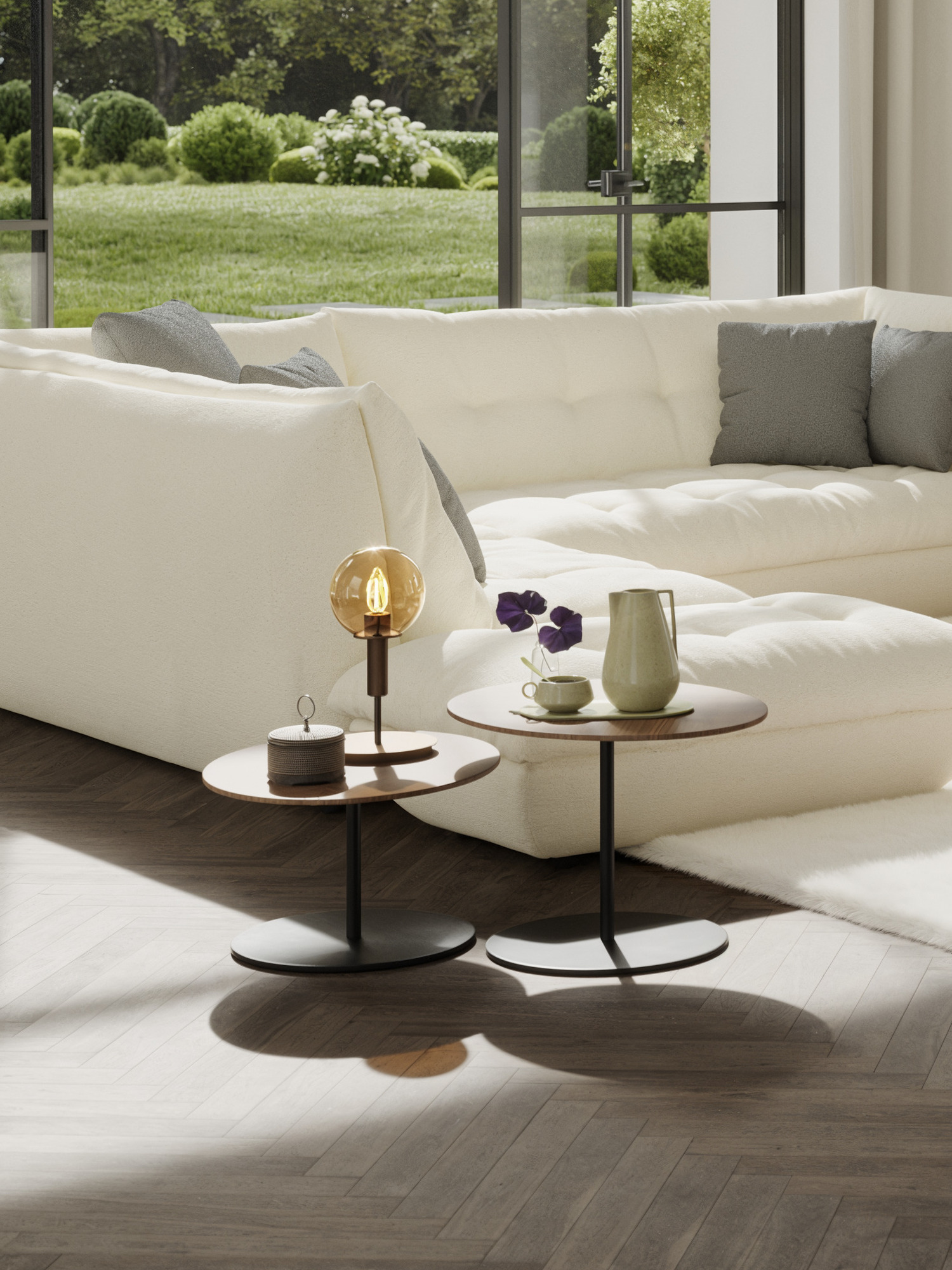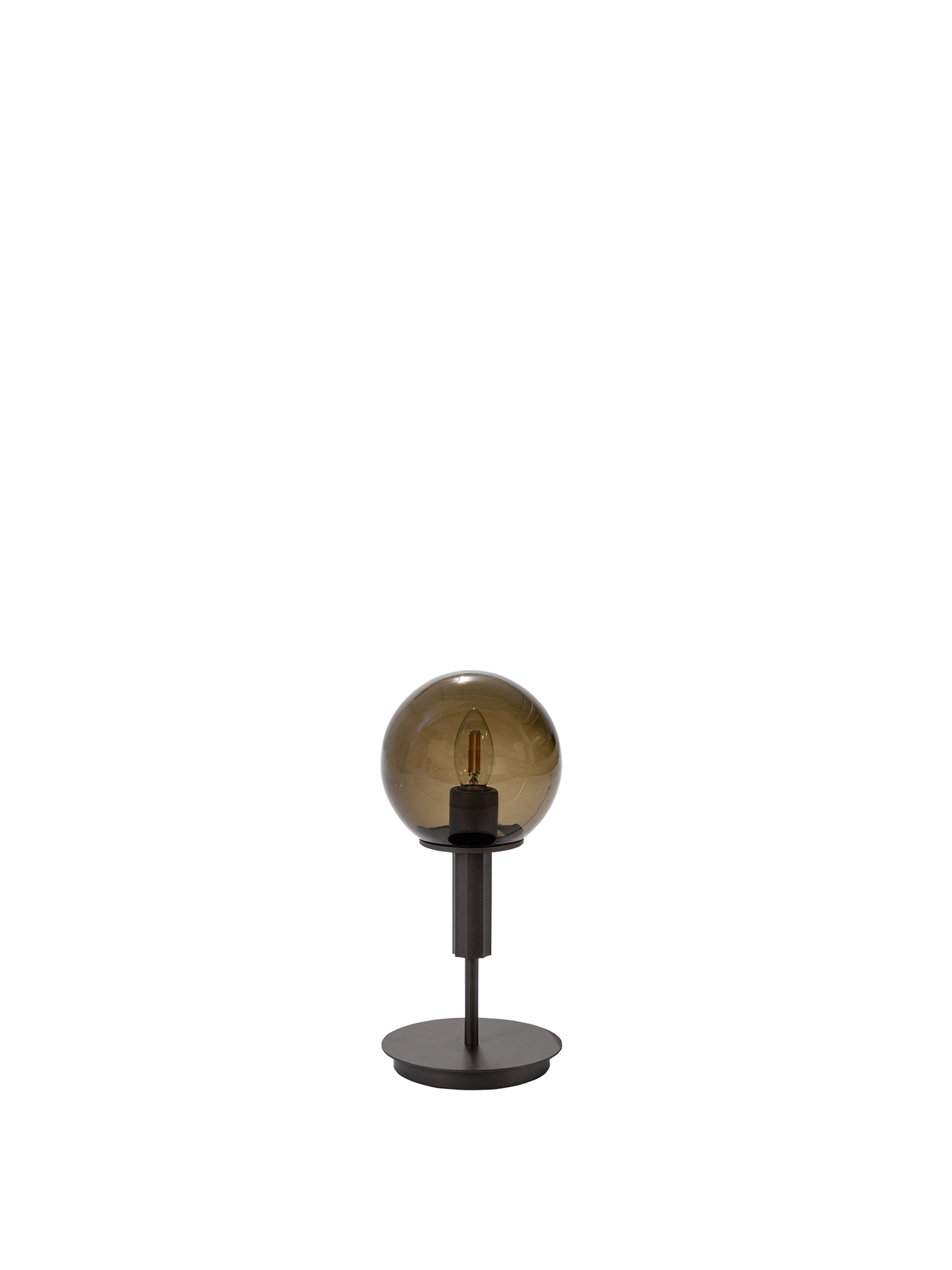 Die edlen Materialien der Lumio Leuchten nehmen Bezug auf klassische Formen und interpretieren diese zeitgemäss. Das gerillte Element unterhalb des Glaskörpers ist einer korinthischen Säule nachempfunden, das bronzefarbene Metall, aus dem es gefertigt ist, verleiht ihm nahezu sachliche Modernität. Bewusst scheinen Fassung und Leuchtmittel in der Glaskuppel auf, deren rauchiges Braun stimmungsvoll den umgebenden Raum erhellt.