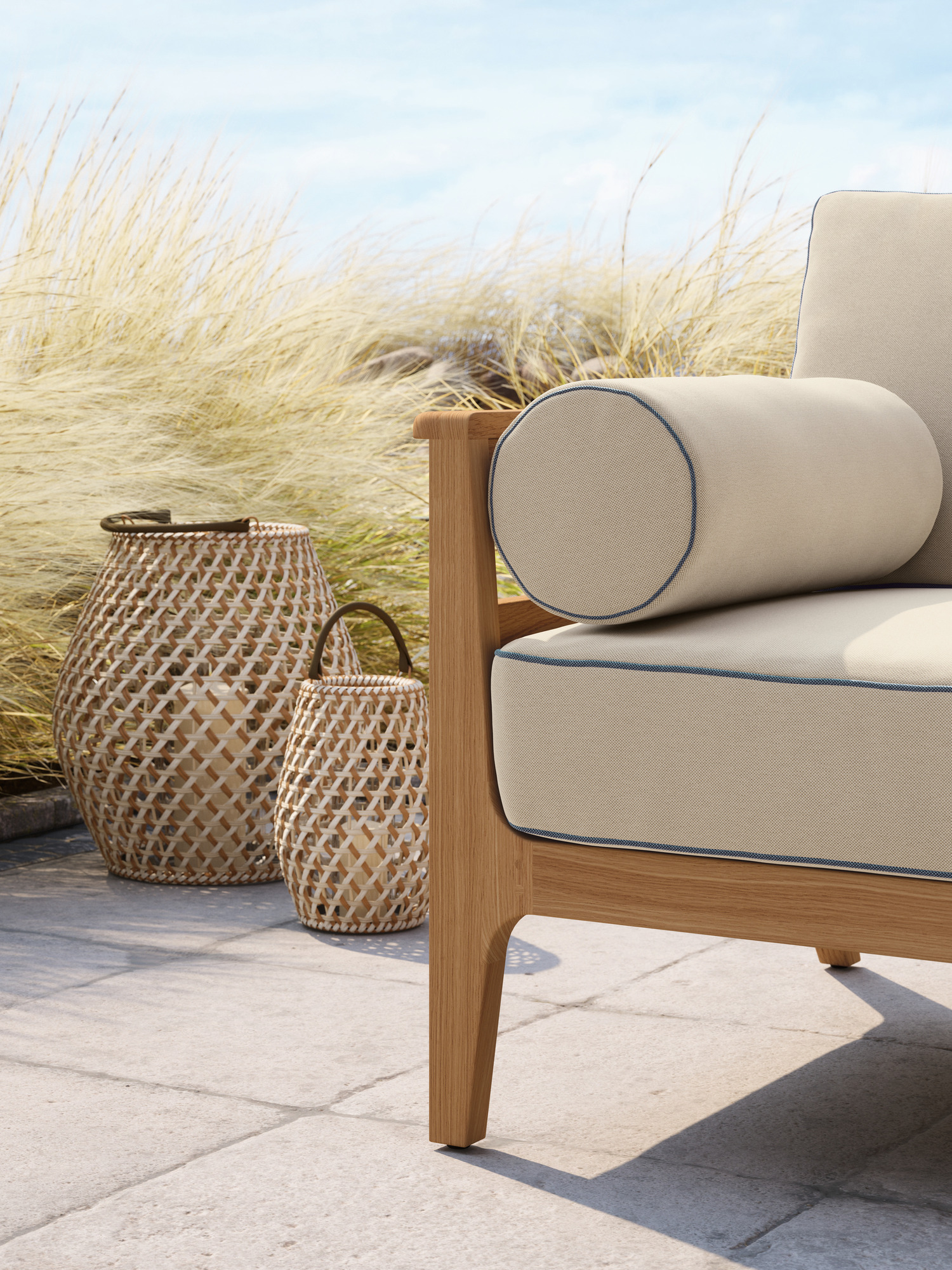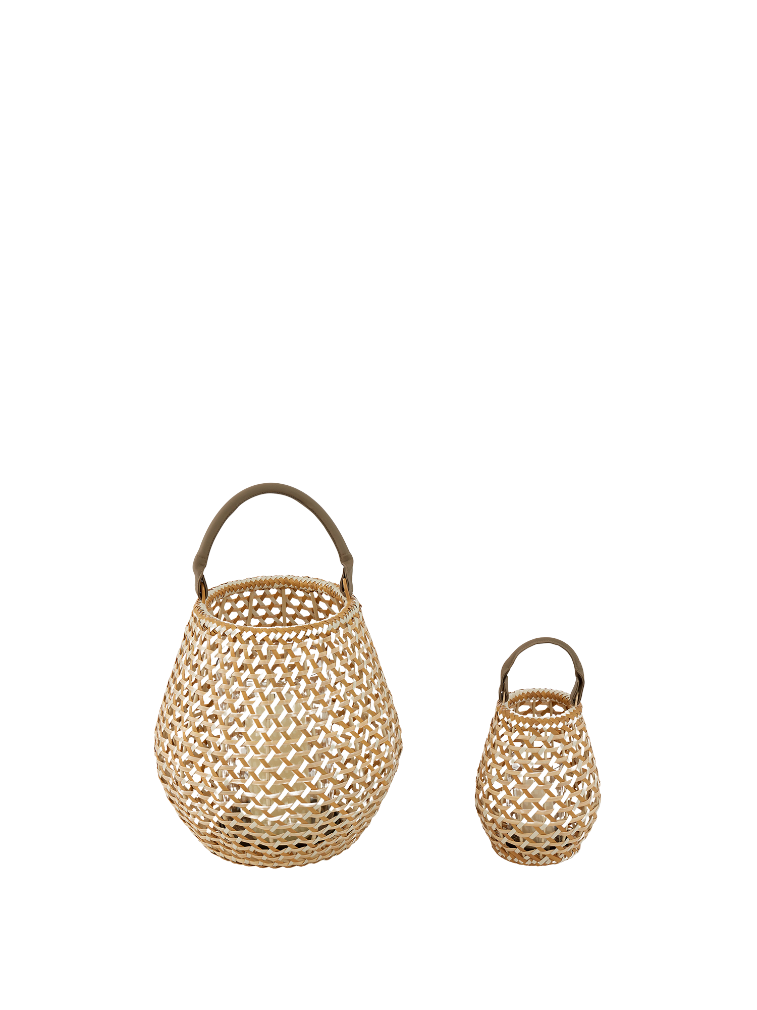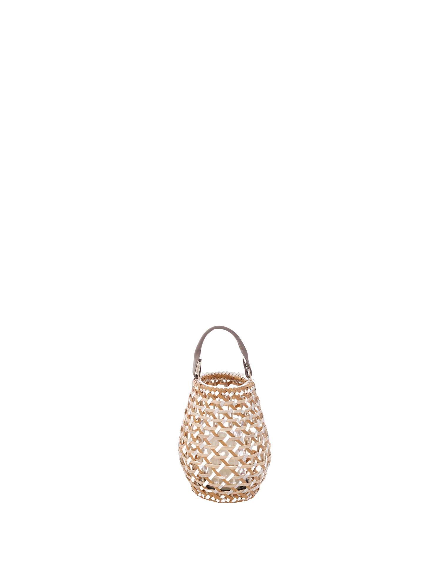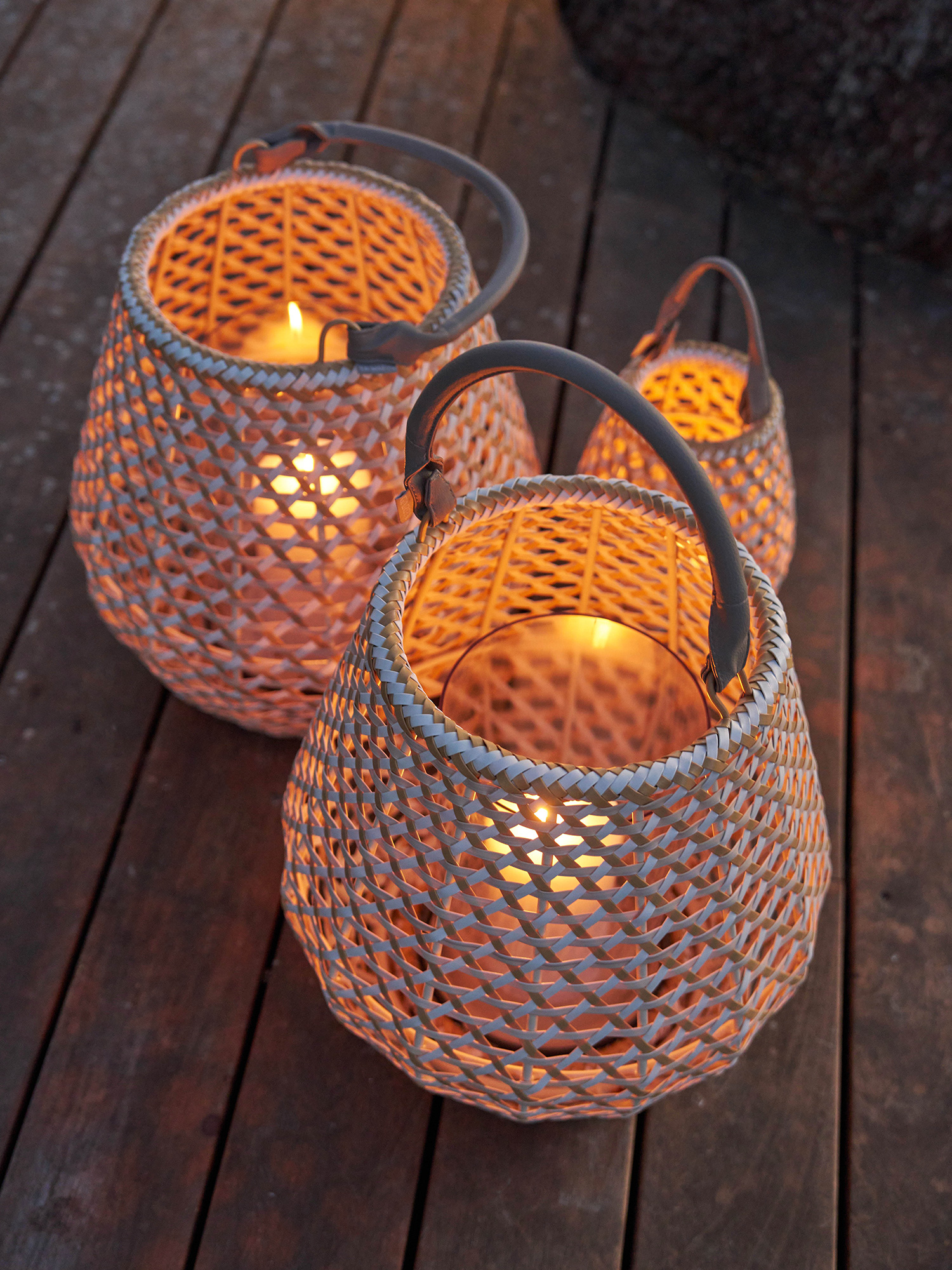 Licht und Sonne scheinen durch das offene Geflecht der Laternen, die in aufwendiger Handarbeit nach traditionellen Formen entstehen. Dafür werden wetterfeste Kunststofffasern in drei Naturtönen miteinander verflochten. Per Druckknopf lässt sich der handgefertigte Lederriemen befestigen, der stabile Boden besteht aus Aluminium.