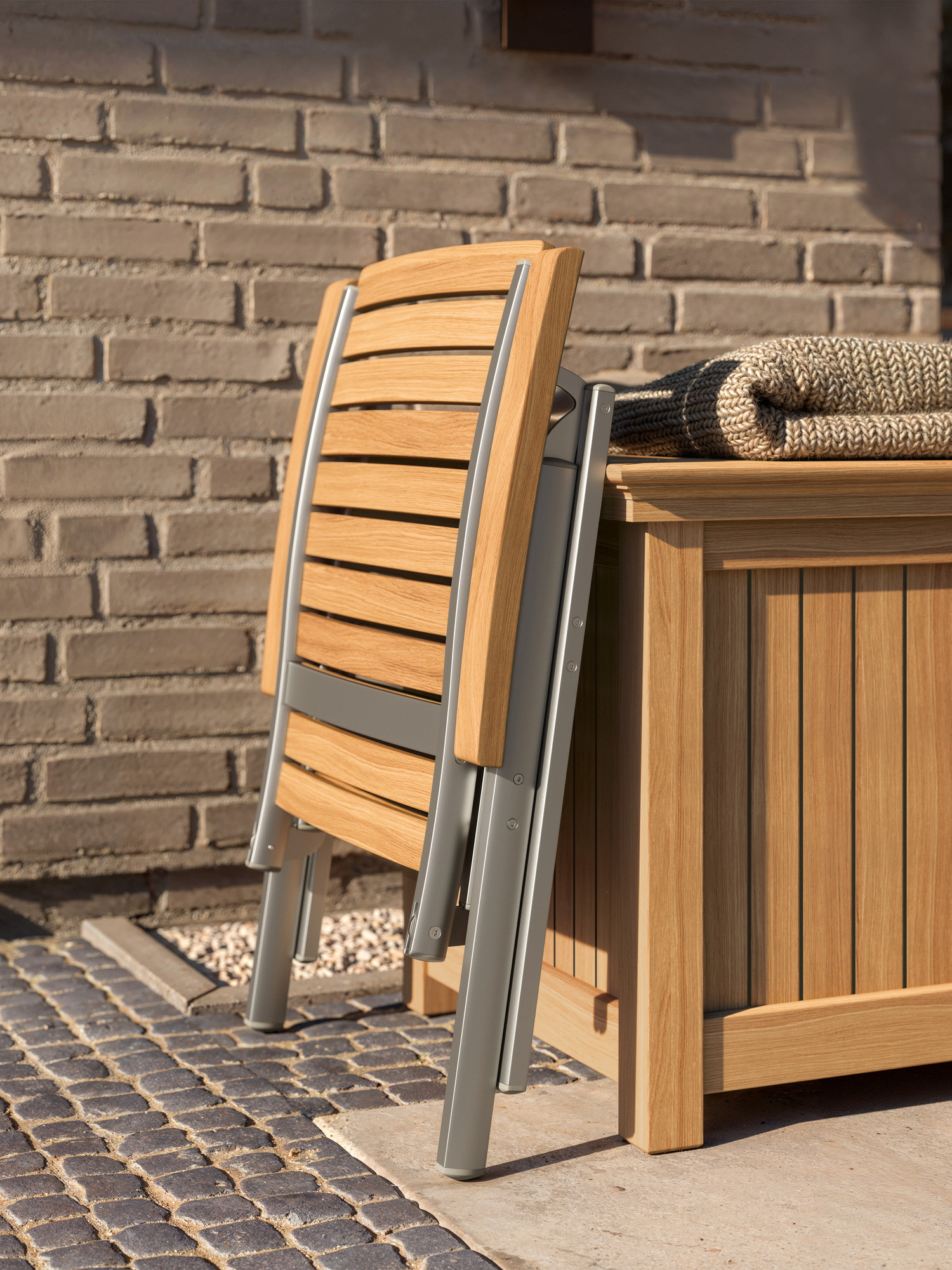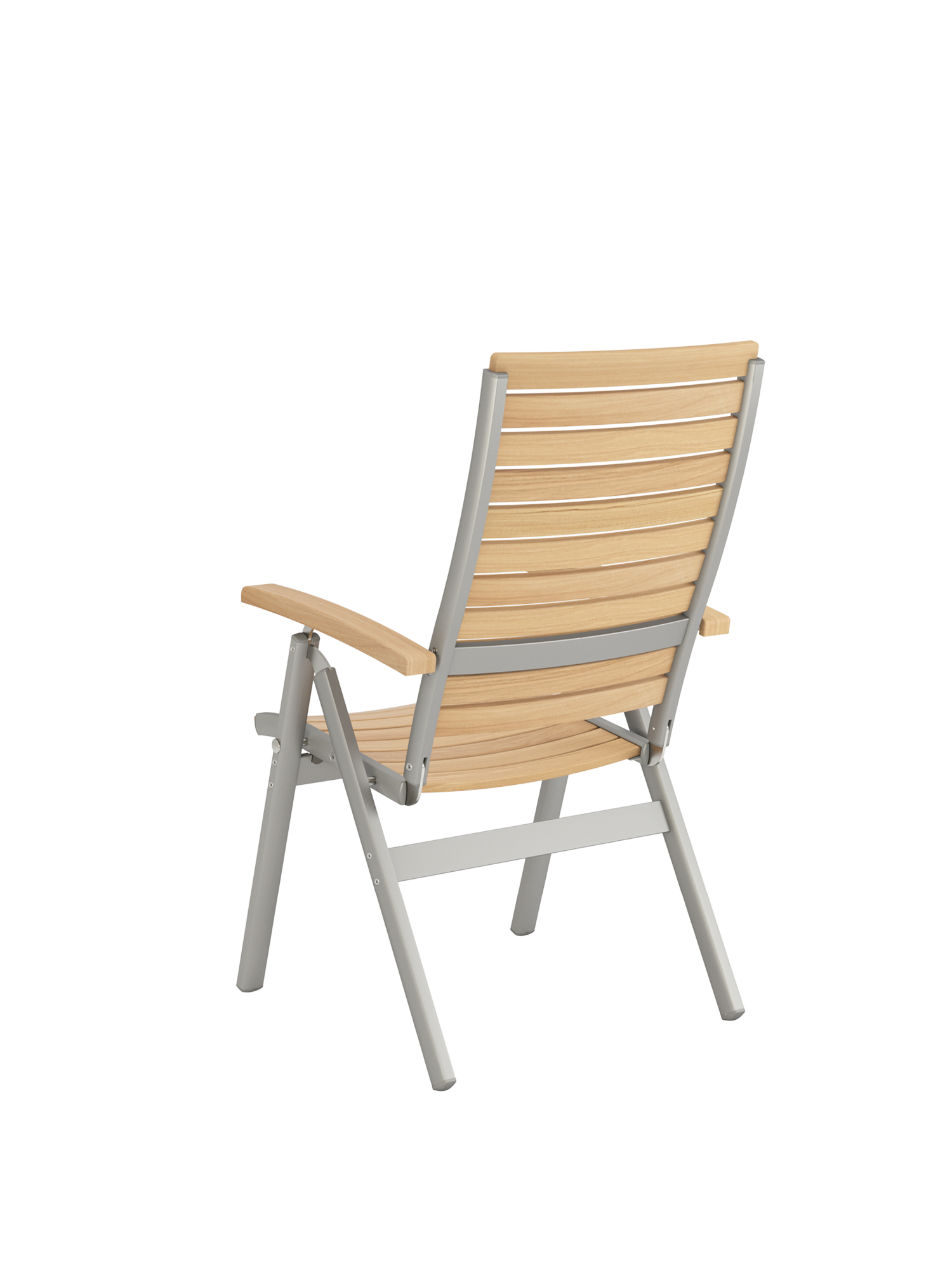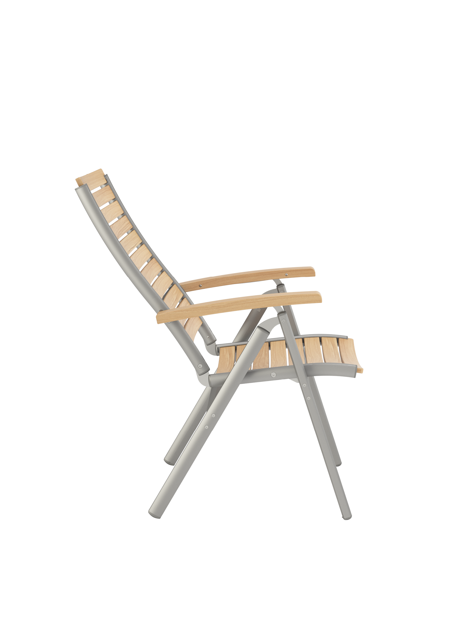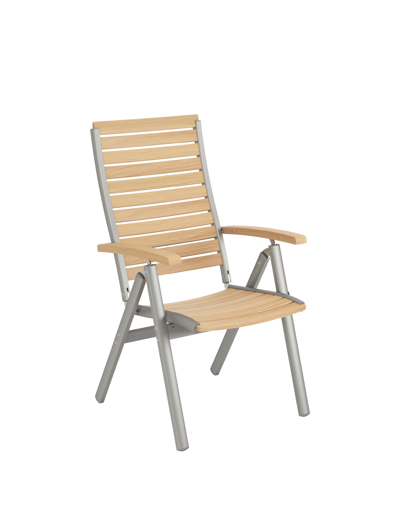 Hier werden langlebige Materialien perfekt in Szene gesetzt: Die eloxierten Profile des seidig glänzenden Aluminiumgestells rahmen bequeme Teakleisten und verleihen dem Designklassiker eine moderne Note. Die Rückenlehne des auf Handbreite zusammenklappbaren Hochlehners ist vierfach verstellbar.