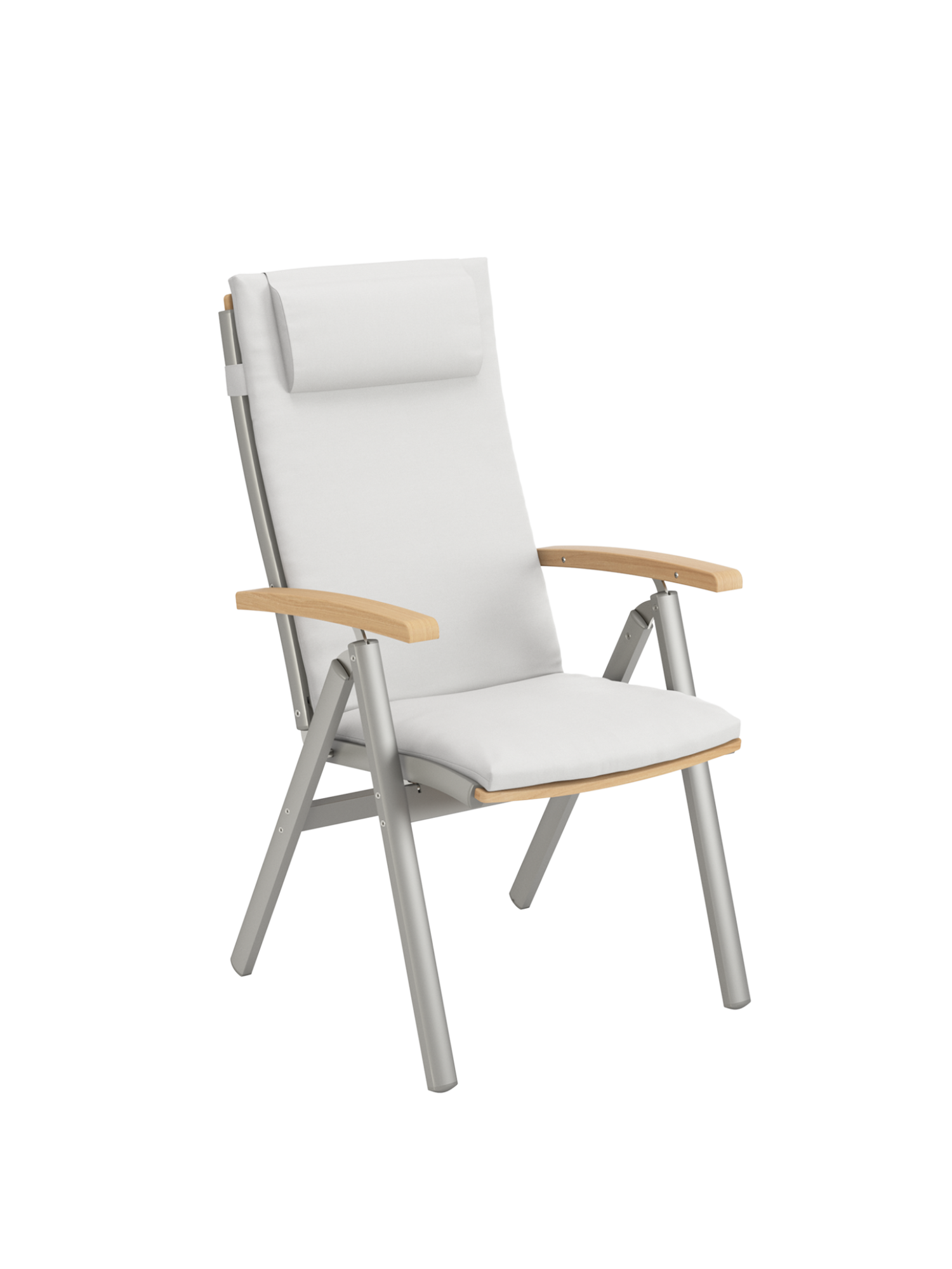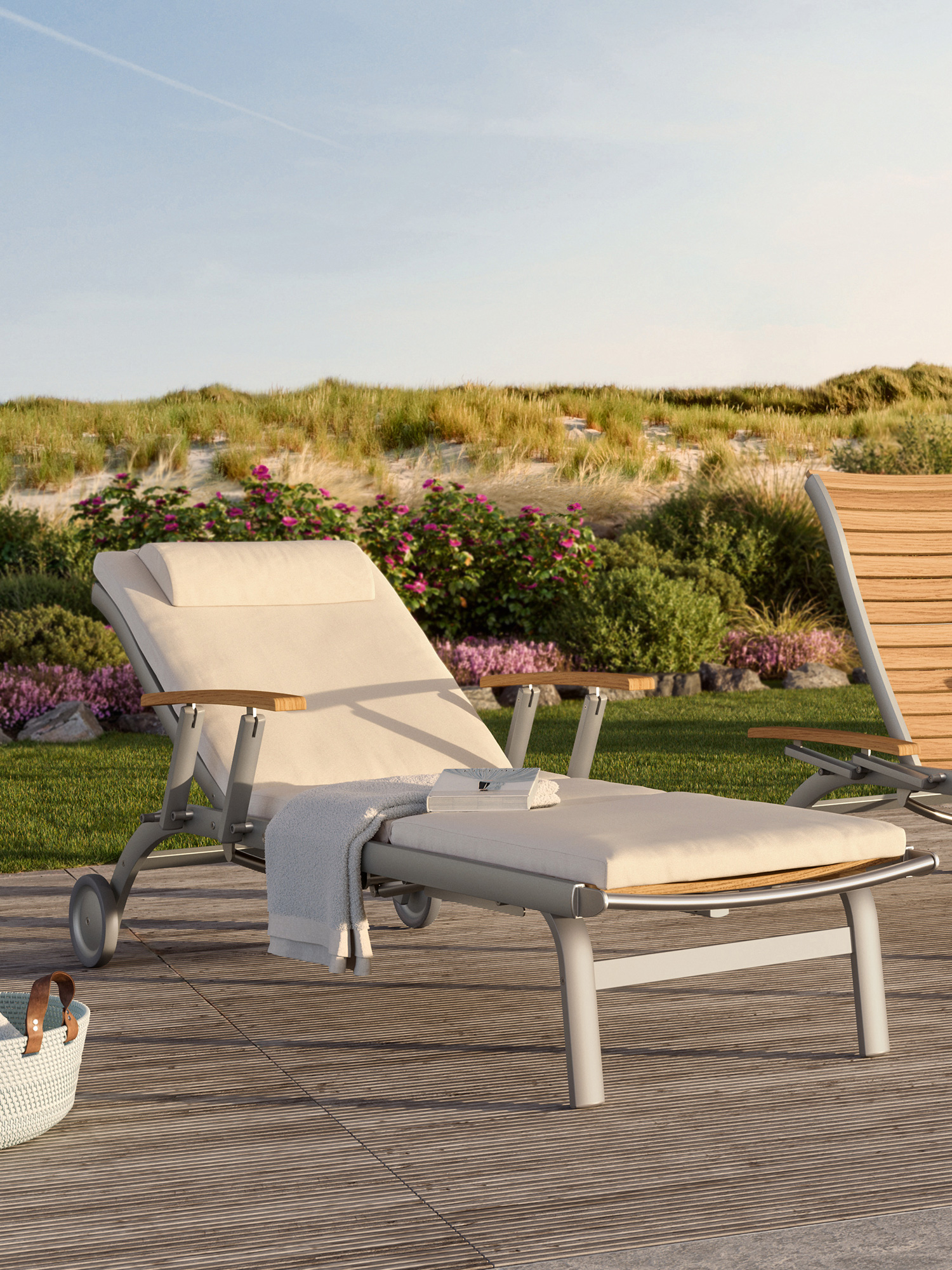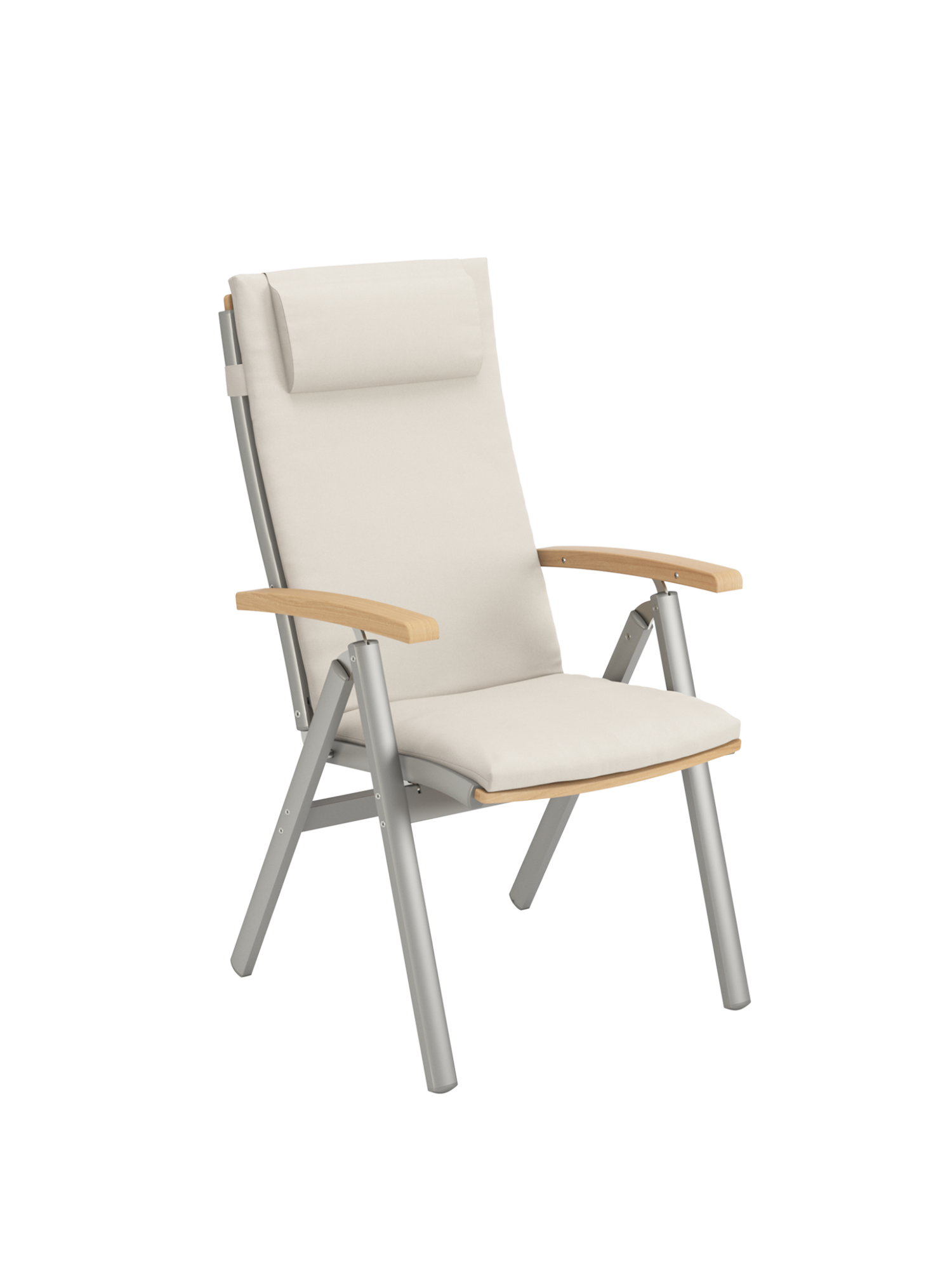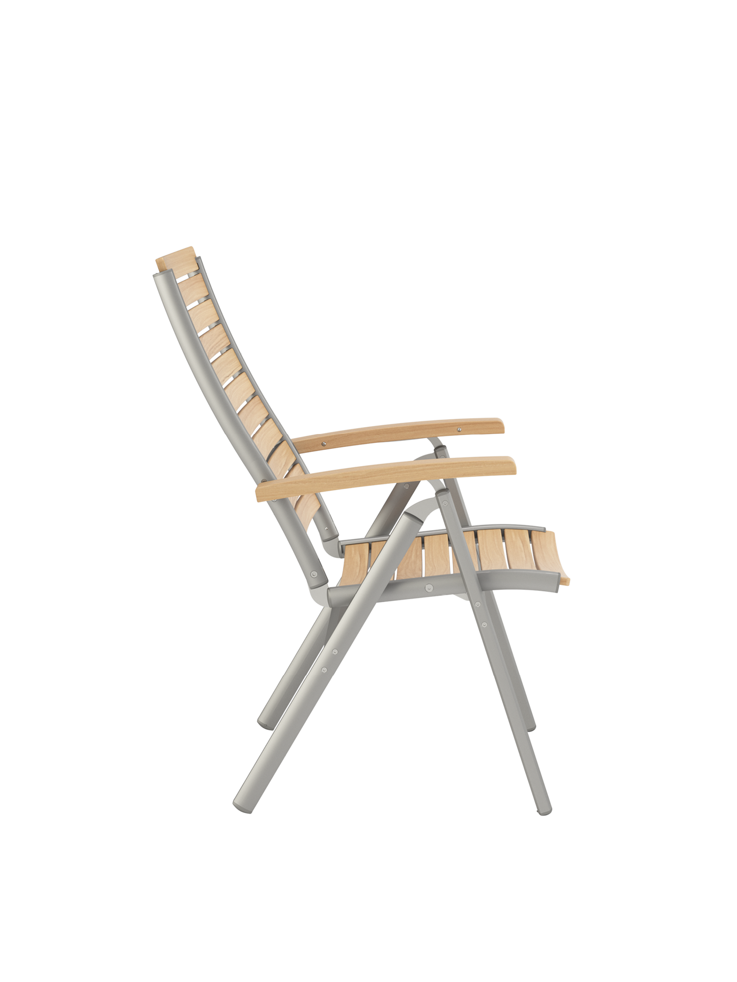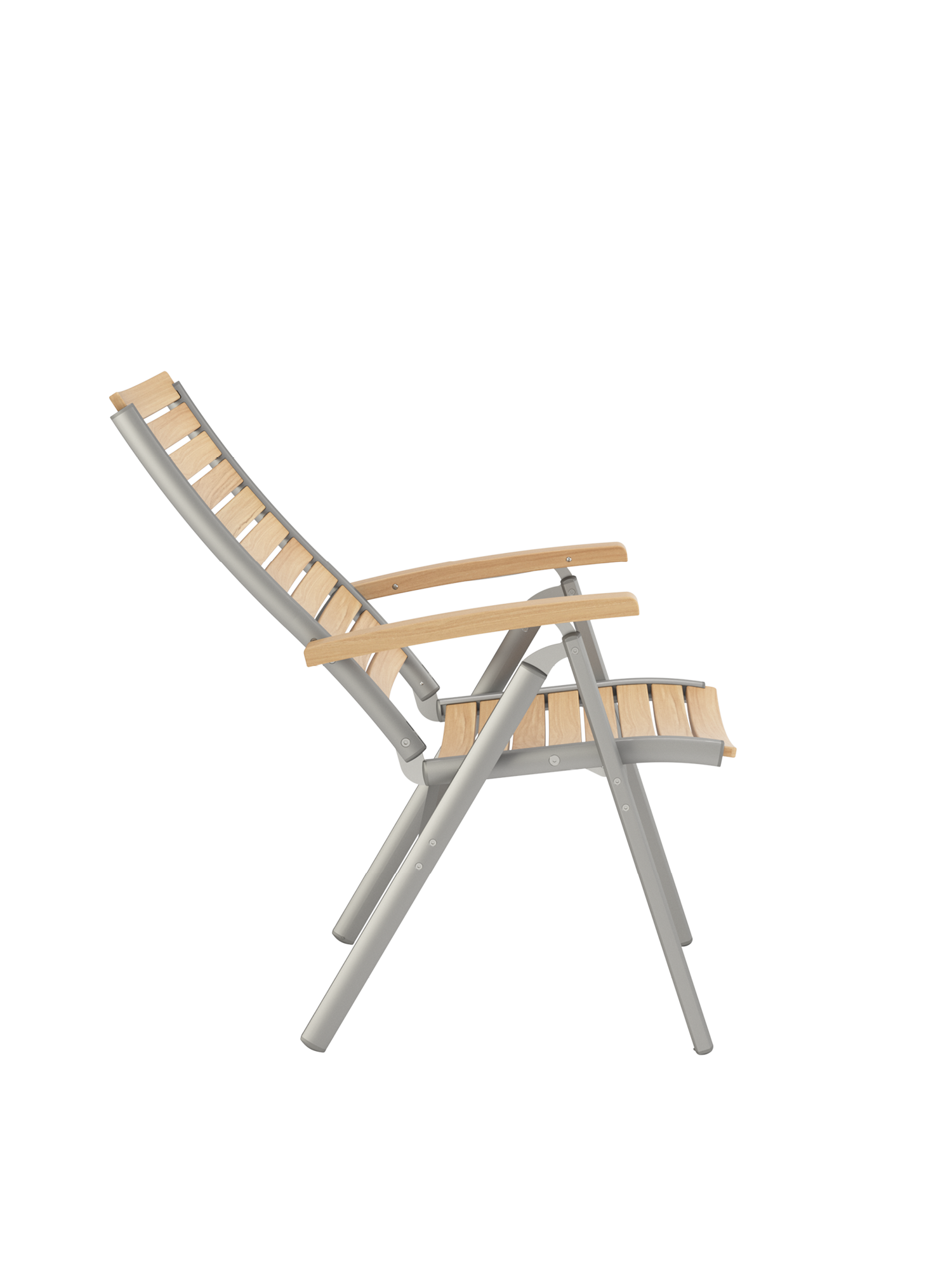 Hier werden langlebige Materialien perfekt in Szene gesetzt: Die eloxierten Profile des seidig glänzenden Aluminiumgestells rahmen bequeme Teakleisten und verleihen dem Designklassiker eine moderne Note. Die Rückenlehne des auf Handbreite zusammenklappbaren Hochlehners ist vierfach verstellbar.