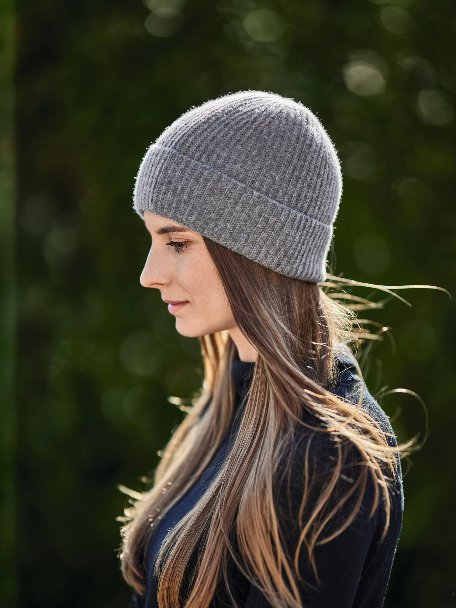 Die aus Eco-Cashmere und Melangegarn gefertigte Mütze kann im Wollwaschgang bei bis zu 30 Grad gereinigt werden und sollte anschliessend im Liegen trocknen.