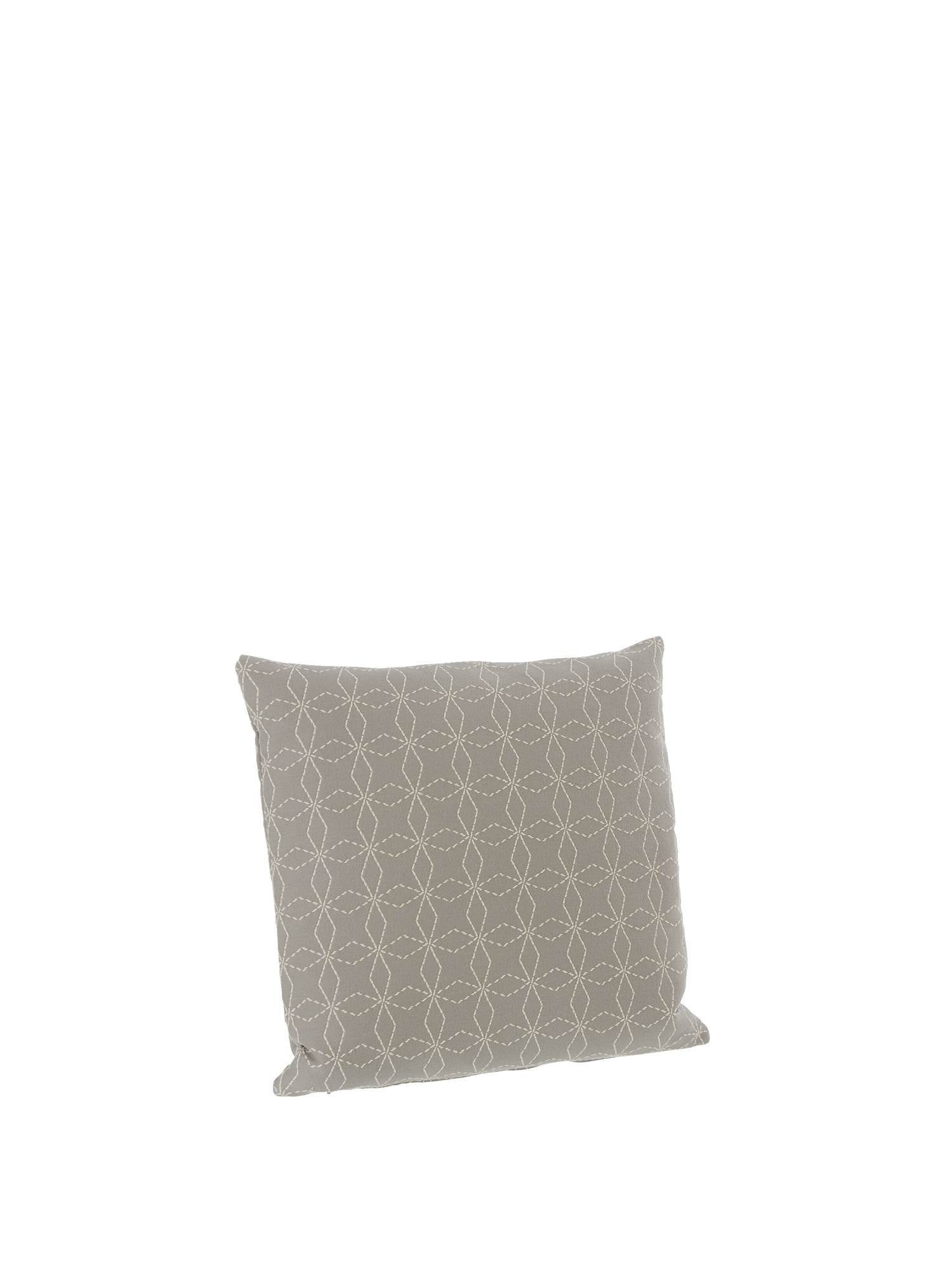Helles Grau und zartes Beige im Wechselspiel: Die Grundfarbe der Mulino Kissen kehrt im grafischen Dessin des jeweils anderen wieder. Quadratische Federkissen und längliche Zusatzkissen lassen sich harmonisch kombinieren.