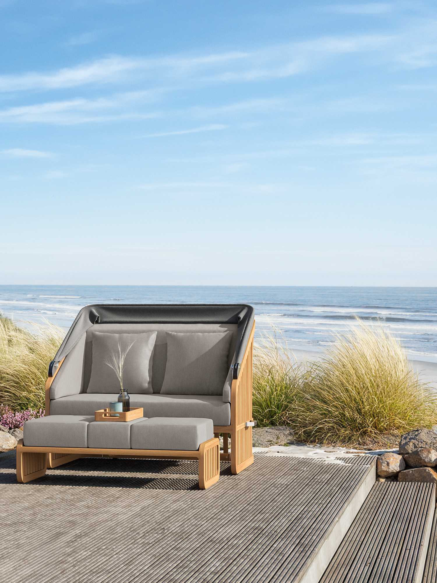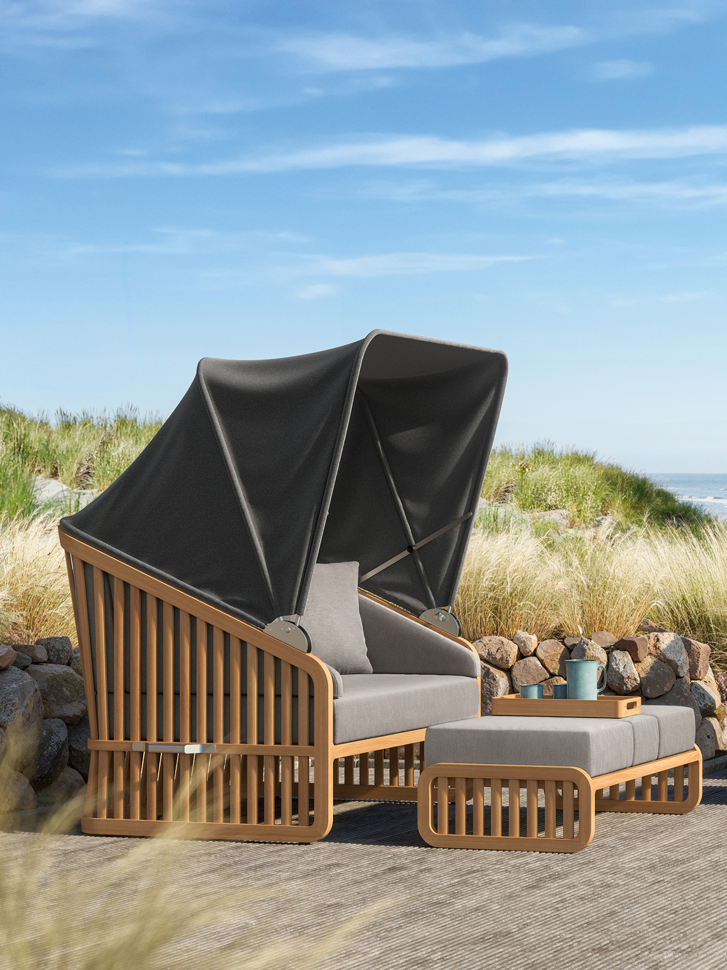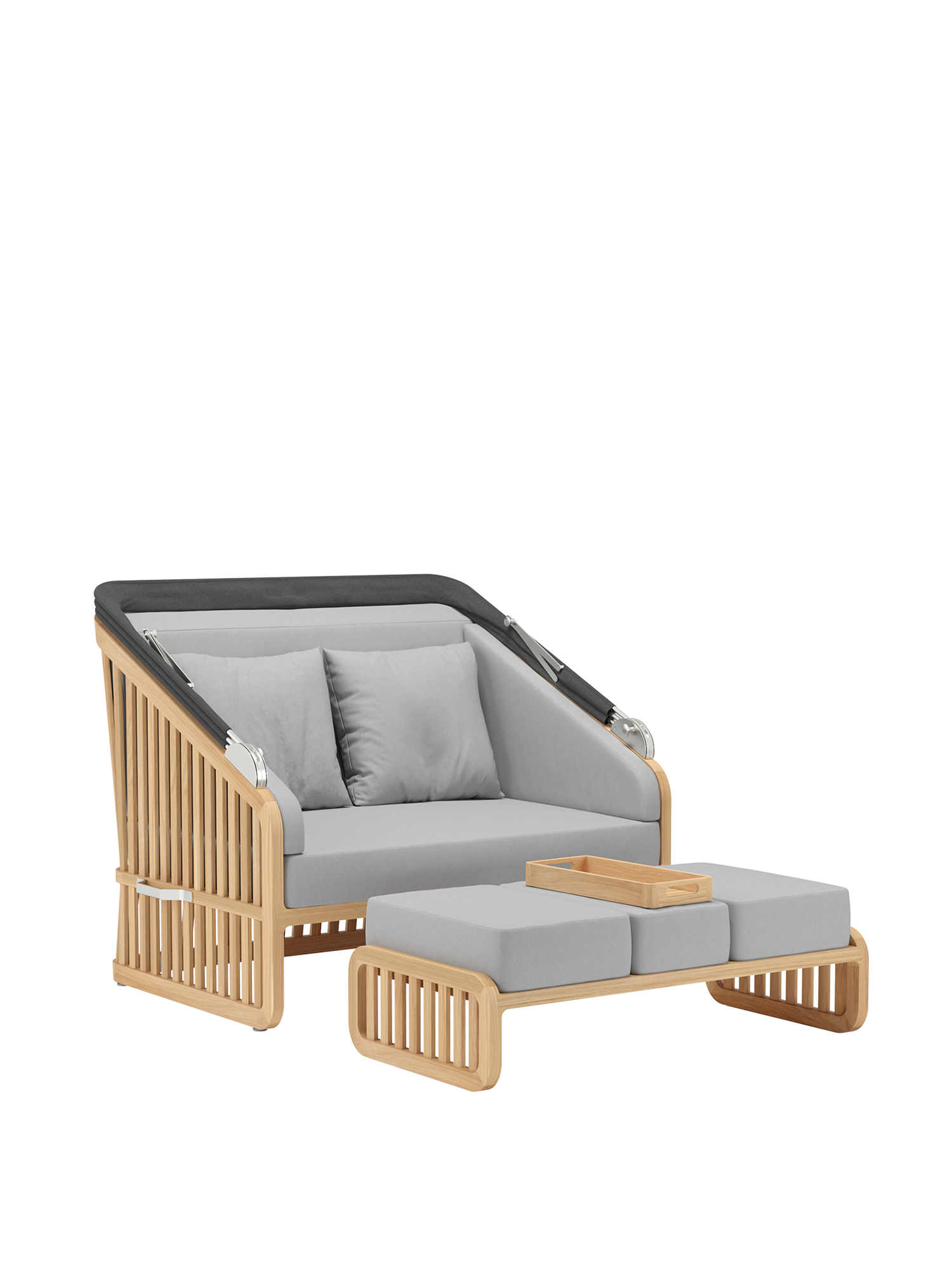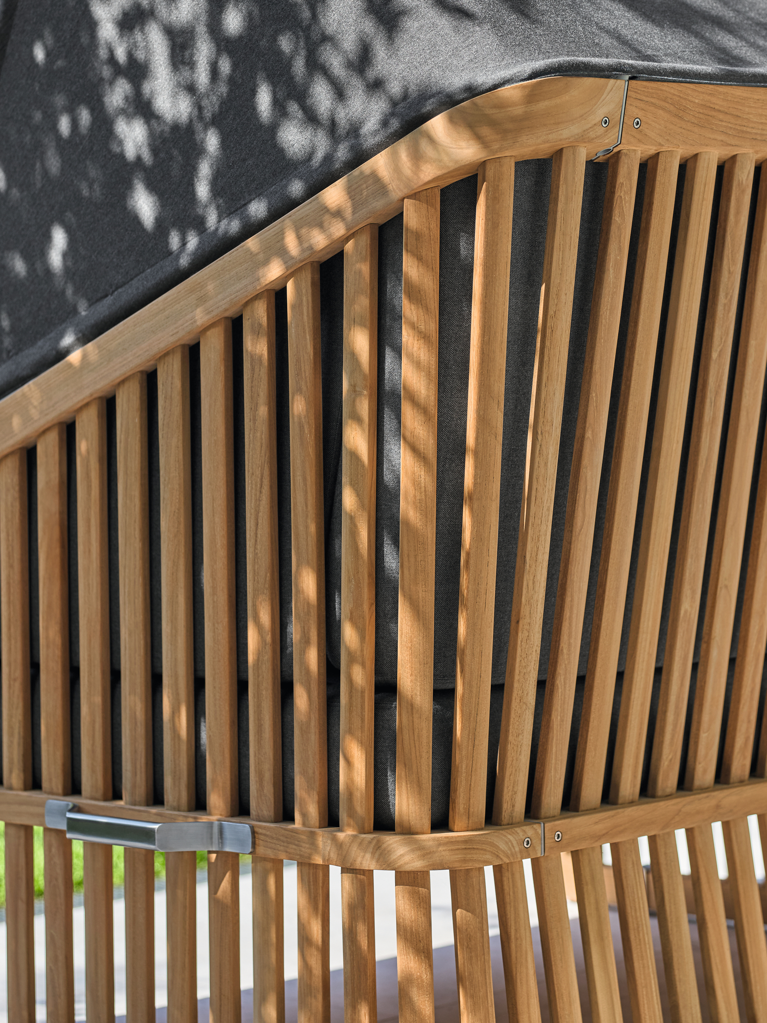 Der Wechsel zwischen Sonneninsel und Schattenplatz gestaltet sich äusserst flexibel: Zurückgeklappt umrahmt das Sommerdach dezent die Kissenlandschaft, aufgespannt wölbt es sich wie ein Kokon über der privaten Nische. Das luftige Design der Streben und ihre Taillierung im Rücken verleihen dem massiven Material eine ungewöhnlich leichte Optik. Newcastle gibt es als Zwei- oder Dreisitzer – immer mit einer gepolsterten Bank, die ohne Kissen unter der Sitzfläche verschwindet, wenn sie nicht gebraucht wird. Das mitgelieferte Teaktablett sichert den Nachschub an Snacks und Drinks.