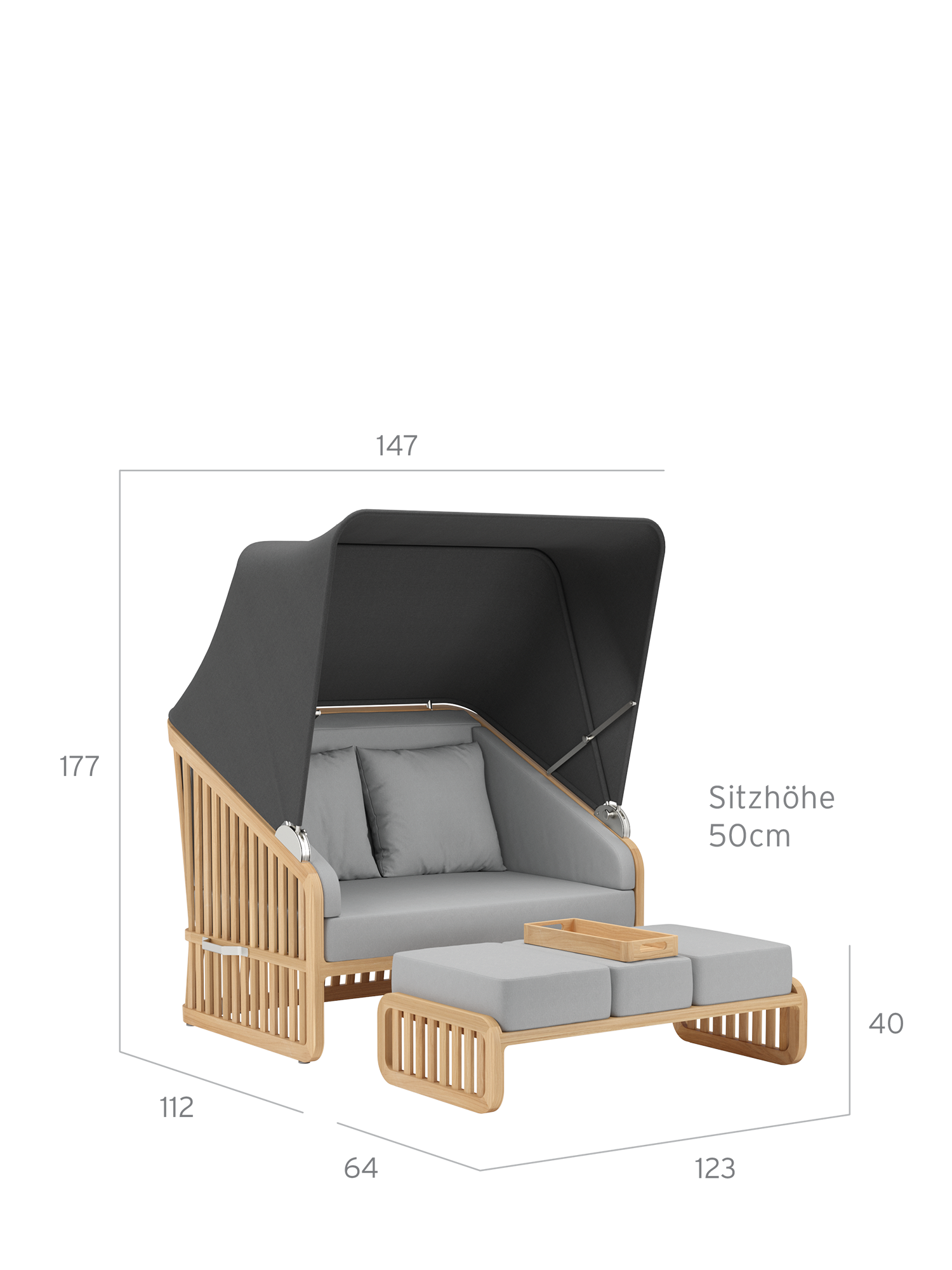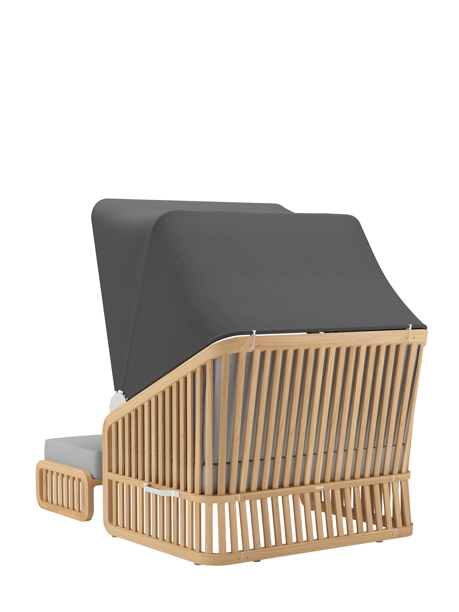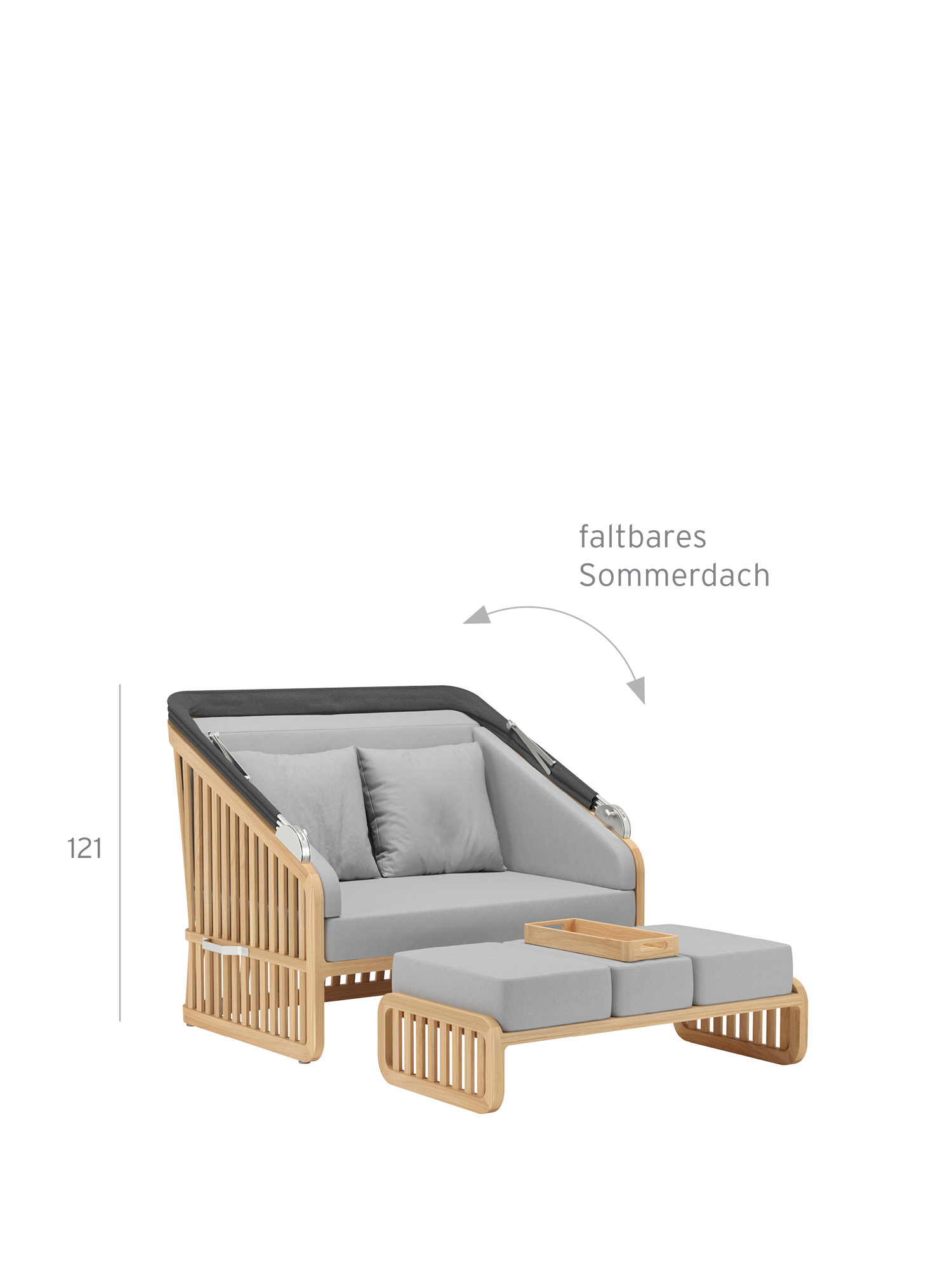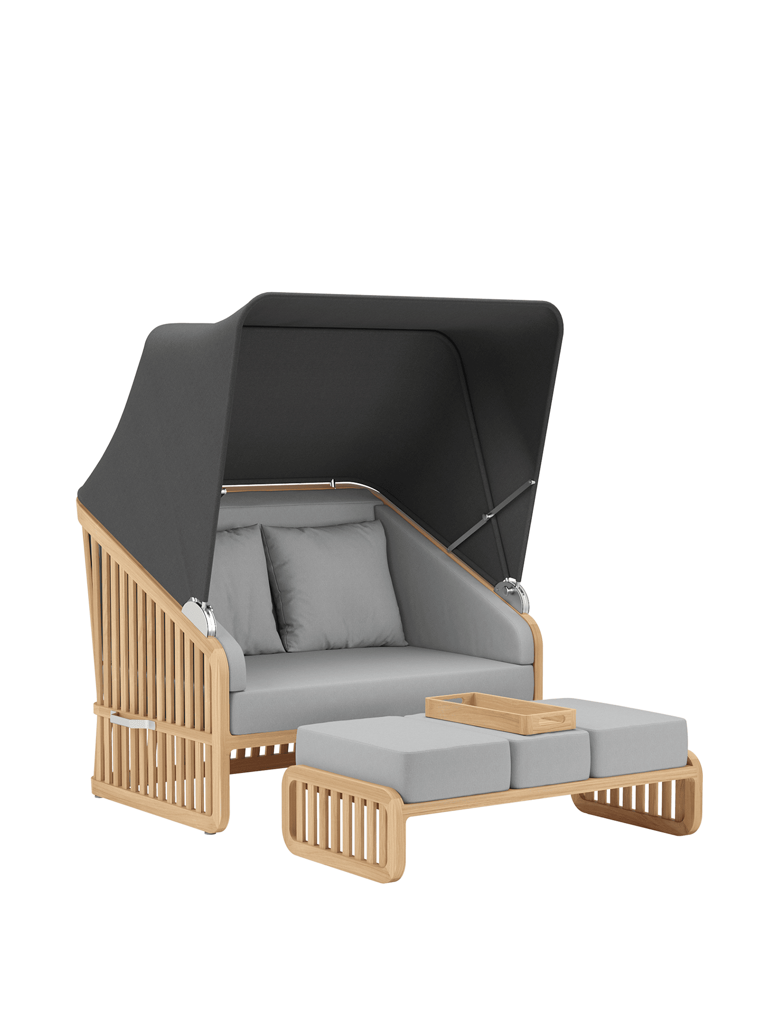 Der Wechsel zwischen Sonneninsel und Schattenplatz gestaltet sich äusserst flexibel: Zurückgeklappt umrahmt das Sommerdach dezent die Kissenlandschaft, aufgespannt wölbt es sich wie ein Kokon über der privaten Nische. Das luftige Design der Streben und ihre Taillierung im Rücken verleihen dem massiven Material eine ungewöhnlich leichte Optik. Newcastle gibt es als Zwei- oder Dreisitzer – immer mit einer gepolsterten Bank, die ohne Kissen unter der Sitzfläche verschwindet, wenn sie nicht gebraucht wird. Das mitgelieferte Teaktablett sichert den Nachschub an Snacks und Drinks.
