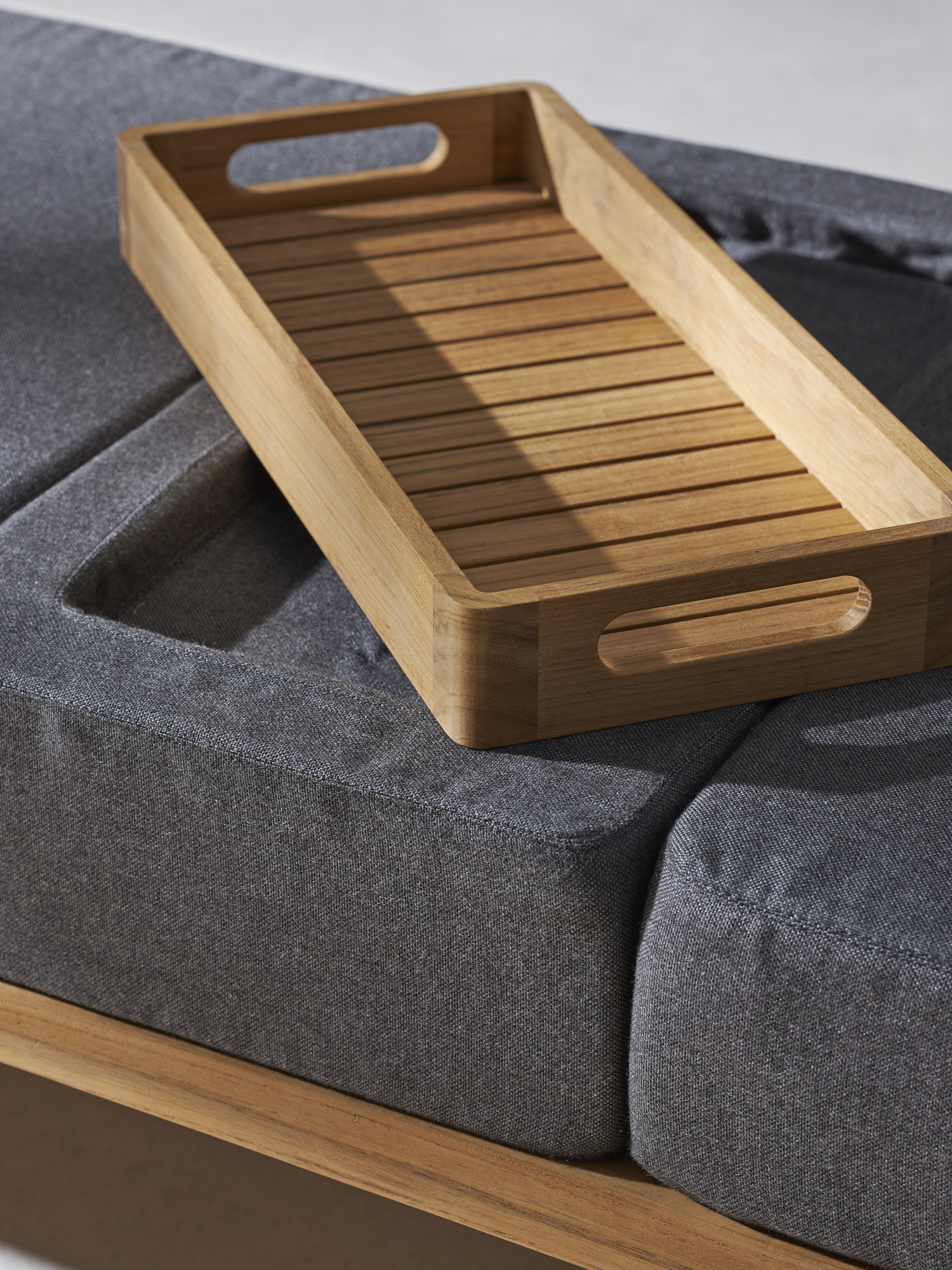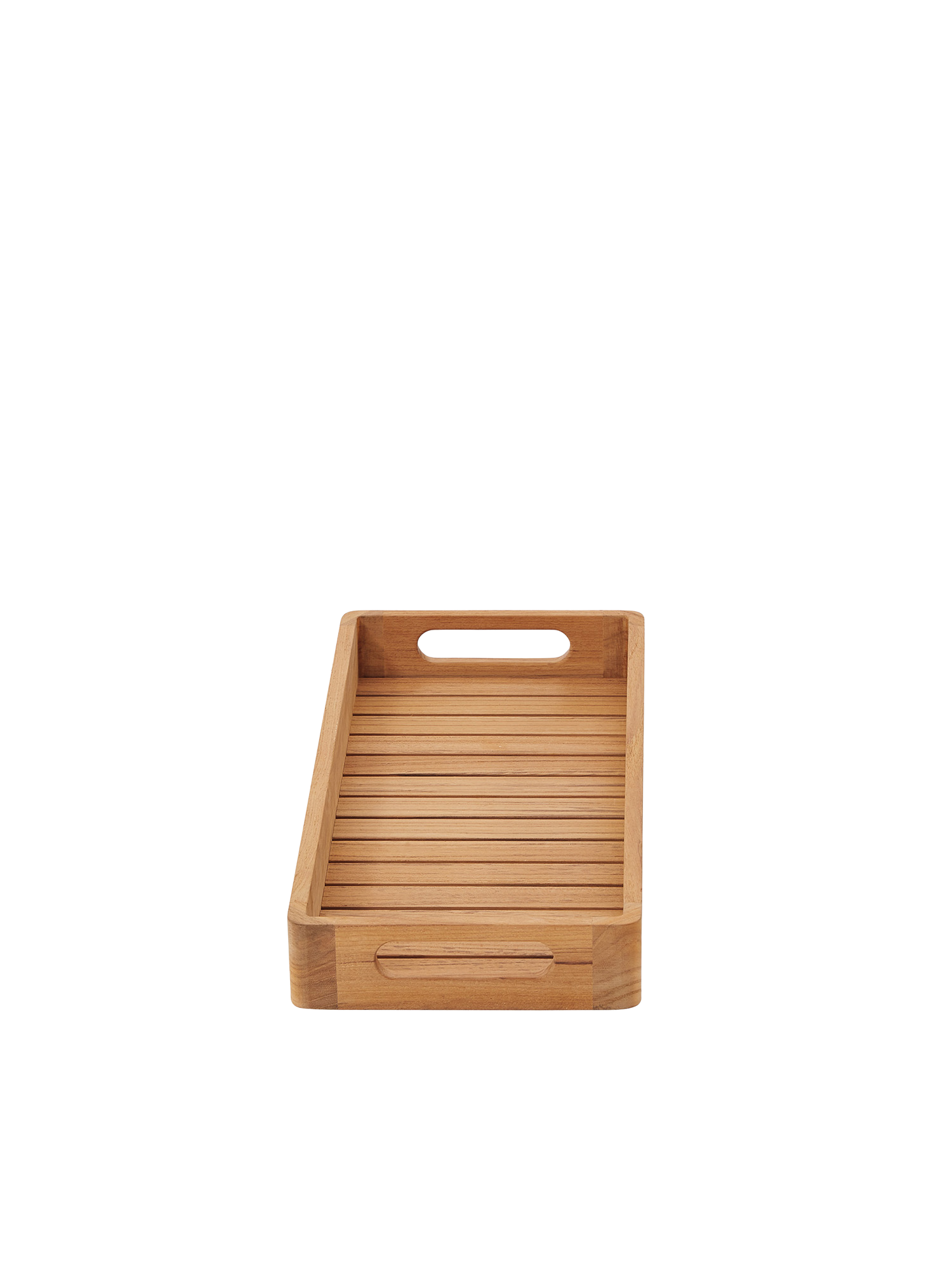 Aus massiven, quer verlaufenden Teakleisten gefertigt und mit zwei Griffen versehen, hält das stabile Tablett Snacks und Drinks jederzeit in Reichweite. Dank seiner glatten Auflagefläche lässt es sich auch auf Lounge- und Polstermöbeln sicher platzieren. Die geradlinige Form mit sanft gerundeten Ecken setzt einen harmonischen Akzent.